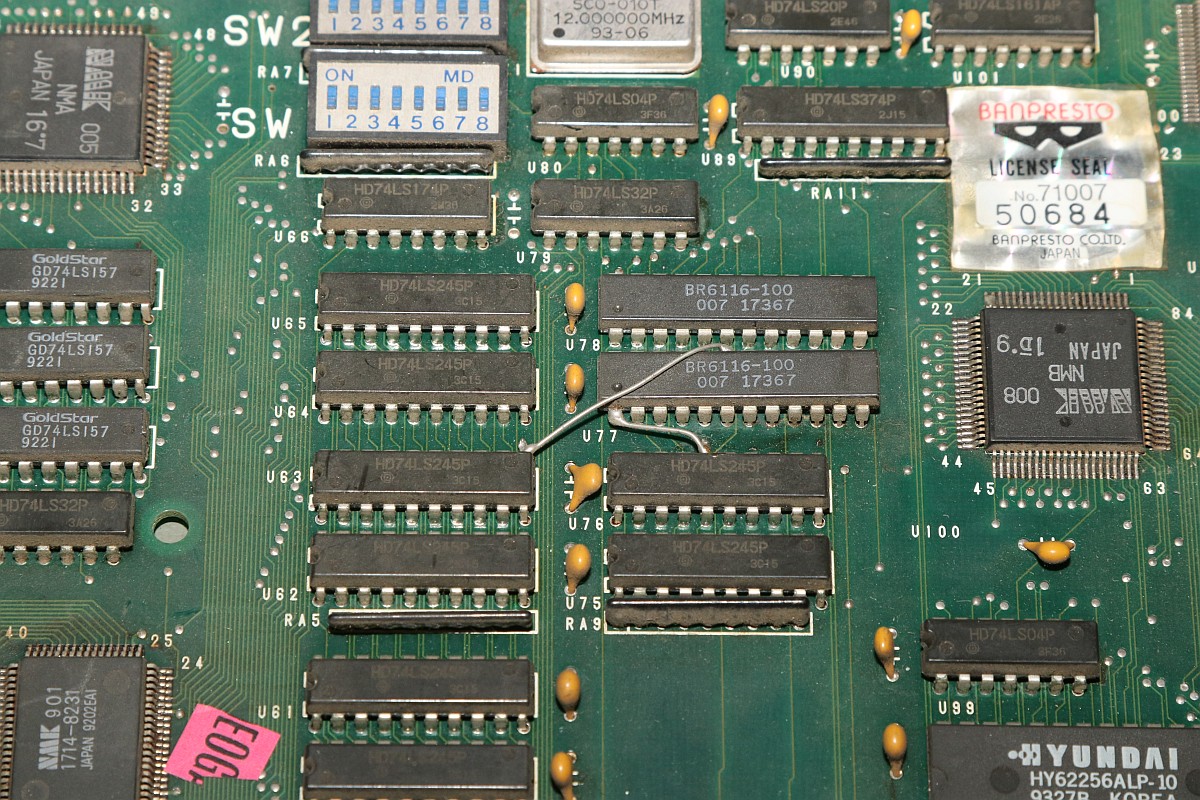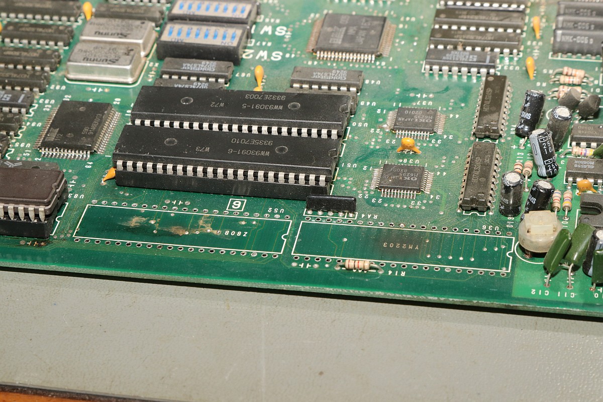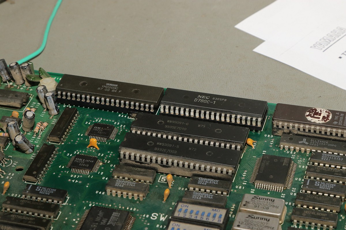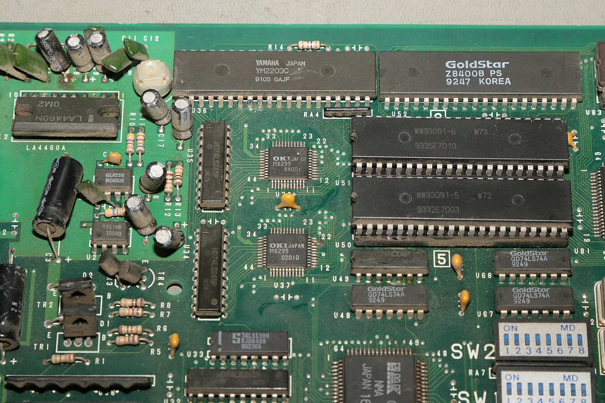 {Big Bang - tonlos} Ein Machwerk von Banpresto, leider wieder mal ohne Schaltplan, dafür mit ganz vielen Custom-ICs... Der Sound-Z80 werkelt. Da haben sie bei der Herstellung schon ganz schön rumgefrickelt... Zwei Sample-Kanäle mit OKI 6295... würde es funktionieren, könnte man da ganz schön was rausholen... Hier zuckt nichts, die Teile bekommen kein Chip-Select. Der Vorbesitzer hat schon mal mächtig rumprobiert - solche Platinen liebe ich, wenn drei Kumpels versagt haben, dann bekommt sie der Mike... Interessant auch der Custom hier: die beiden CS# für die OKIs werden hier erzeugt - und genau an den Pins wurde auch schon rumgefrickelt. Immerhin bin ich auf der richtigen Spur. Der YM2203 bekommt alle Signale, es kommt aber nichts raus, mal sehen, ob hier ein Tausch hilft. {Es geht weiter} Der Datenbus am Z80 ist aktiv, hat aber komische Pausen abhängig von den zyklischen Interrupts... Ich tausche präventiv den Soundchip und den Z80... ...in alter Gewohnheit gut gesockelt... Leider hat das am Verhalten absolut nichts geändert. Dem Zustand der Platine zu Folge haben hier schon andere ihr Glück versucht: Ich lege diesen Patienten zu den Akten, man muss wissen, wann es keinen Sinn mehr hat. :-( |