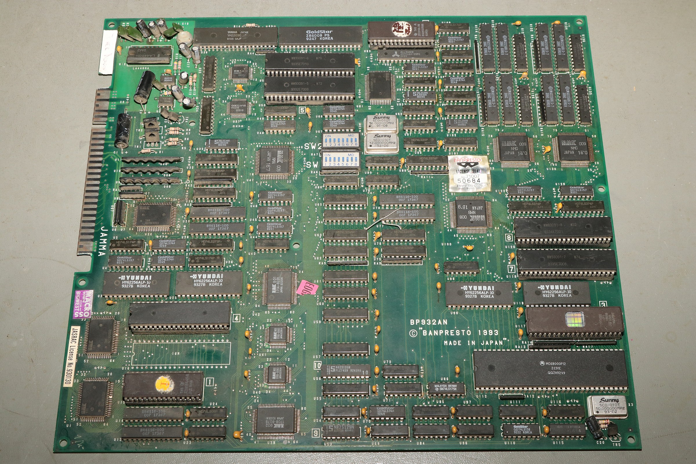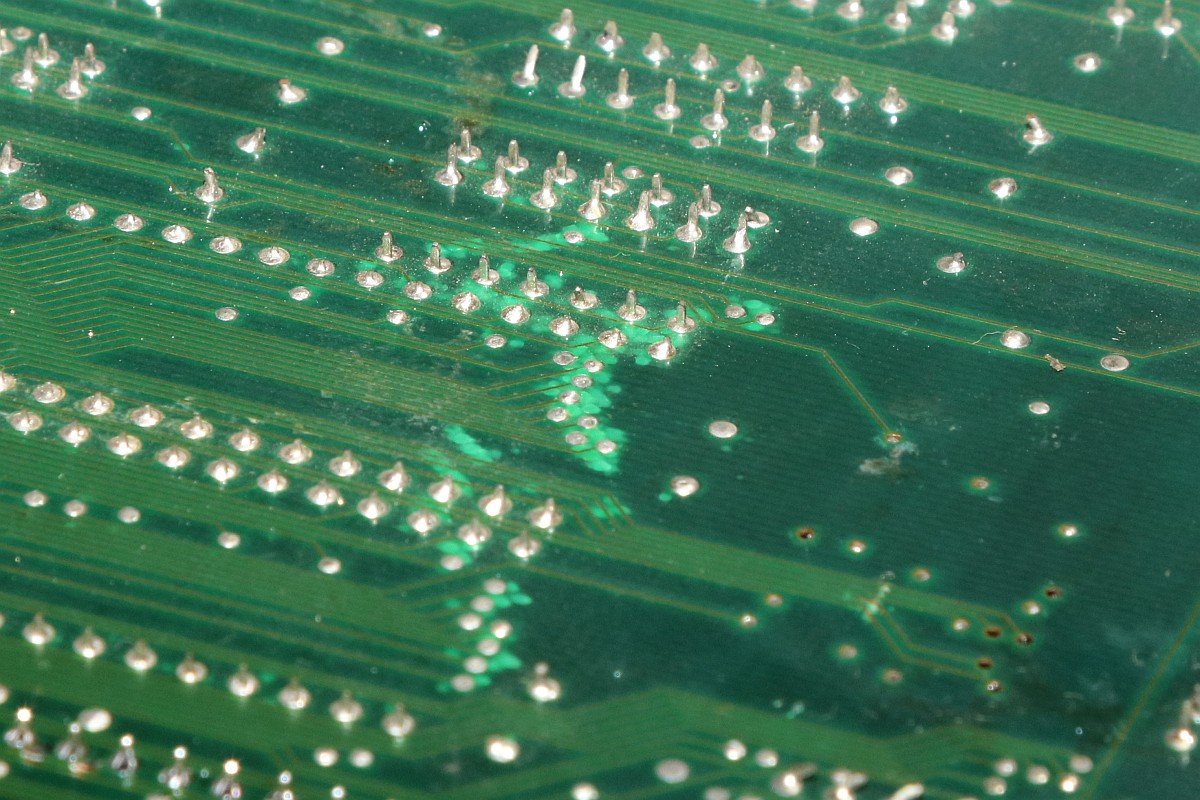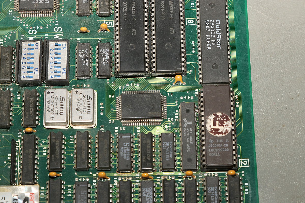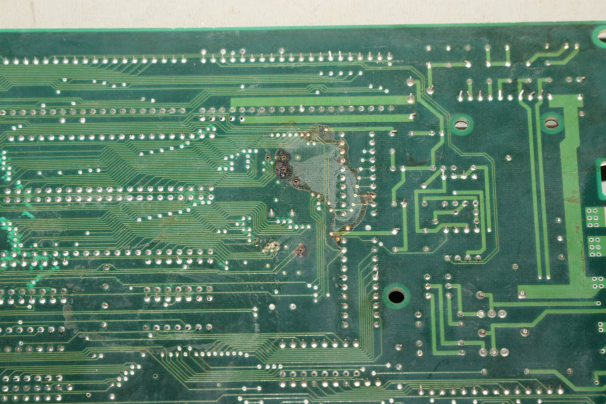 {Big Bang - tonlos} Ein Machwerk von Banpresto, leider wieder mal ohne Schaltplan, dafür mit ganz vielen Custom-ICs... Der Sound-Z80 werkelt. Da haben sie bei der Herstellung schon ganz schön rumgefrickelt... Zwei Sample-Kanäle mit OKI 6295... würde es funktionieren, könnte man da ganz schön was rausholen... Hier zuckt nichts, die Teile bekommen kein Chip-Select. Der Vorbesitzer hat schon mal mächtig rumprobiert - solche Platinen liebe ich, wenn drei Kumpels versagt haben, dann bekommt sie der Mike... Interessant auch der Custom hier: die beiden CS# für die OKIs werden hier erzeugt - und genau an den Pins wurde auch schon rumgefrickelt. Immerhin bin ich auf der richtigen Spur. Der YM2203 bekommt alle Signale, es kommt aber nichts raus, mal sehen, ob hier ein Tausch hilft. {Es geht weiter} Der Datenbus am Z80 ist aktiv, hat aber komische Pausen abhängig von den zyklischen Interrupts... Ich tausche präventiv den Soundchip und den Z80... ...in alter Gewohnheit gut gesockelt... Leider hat das am Verhalten absolut nichts geändert. Dem Zustand der Platine zu Folge haben hier schon andere ihr Glück versucht: Ich lege diesen Patienten zu den Akten, man muss wissen, wann es keinen Sinn mehr hat. :-( |