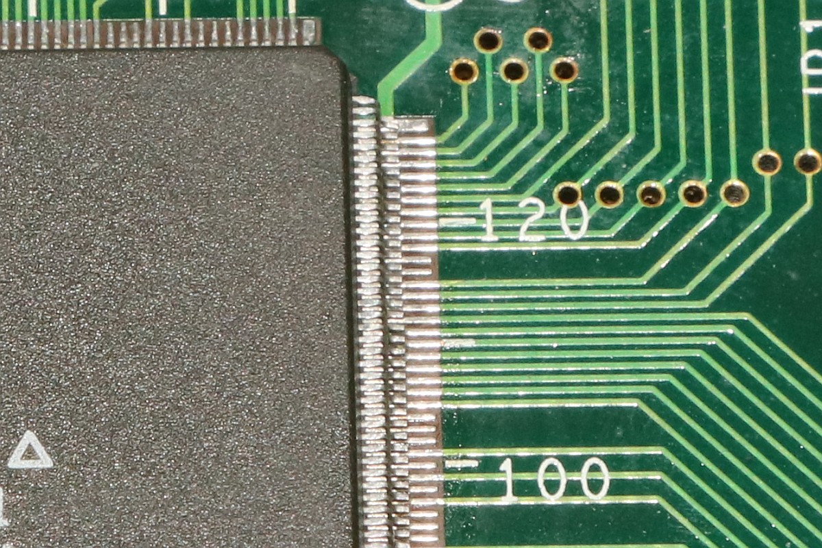 Da hat schon mal wer - sehr sauber - daran rumgelötet und es nicht hinbekommen, auch alle Beinchen wieder mit den Pads zu verlöten. Hier hilft übrigens nur noch ein gutes Stereo-Mikroskop. Mit unbewaffnetem Auge sind diese Fehler nicht zu sehen.