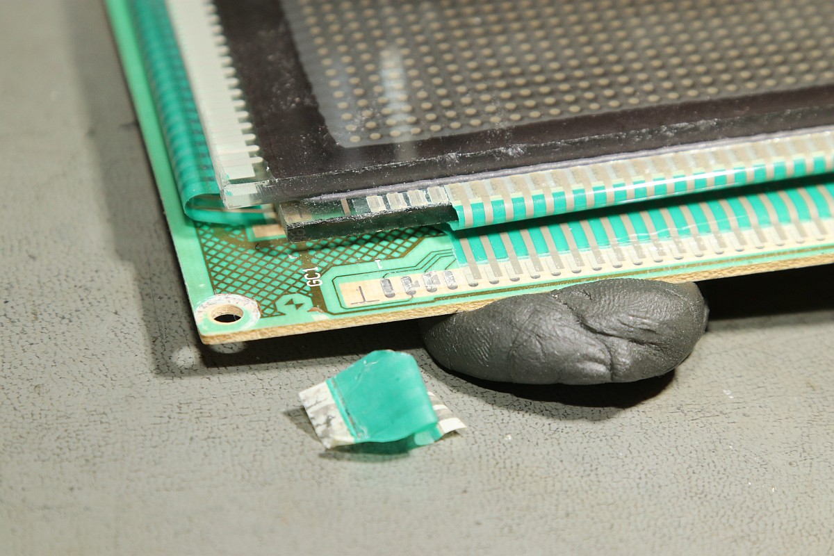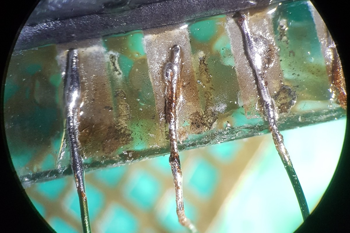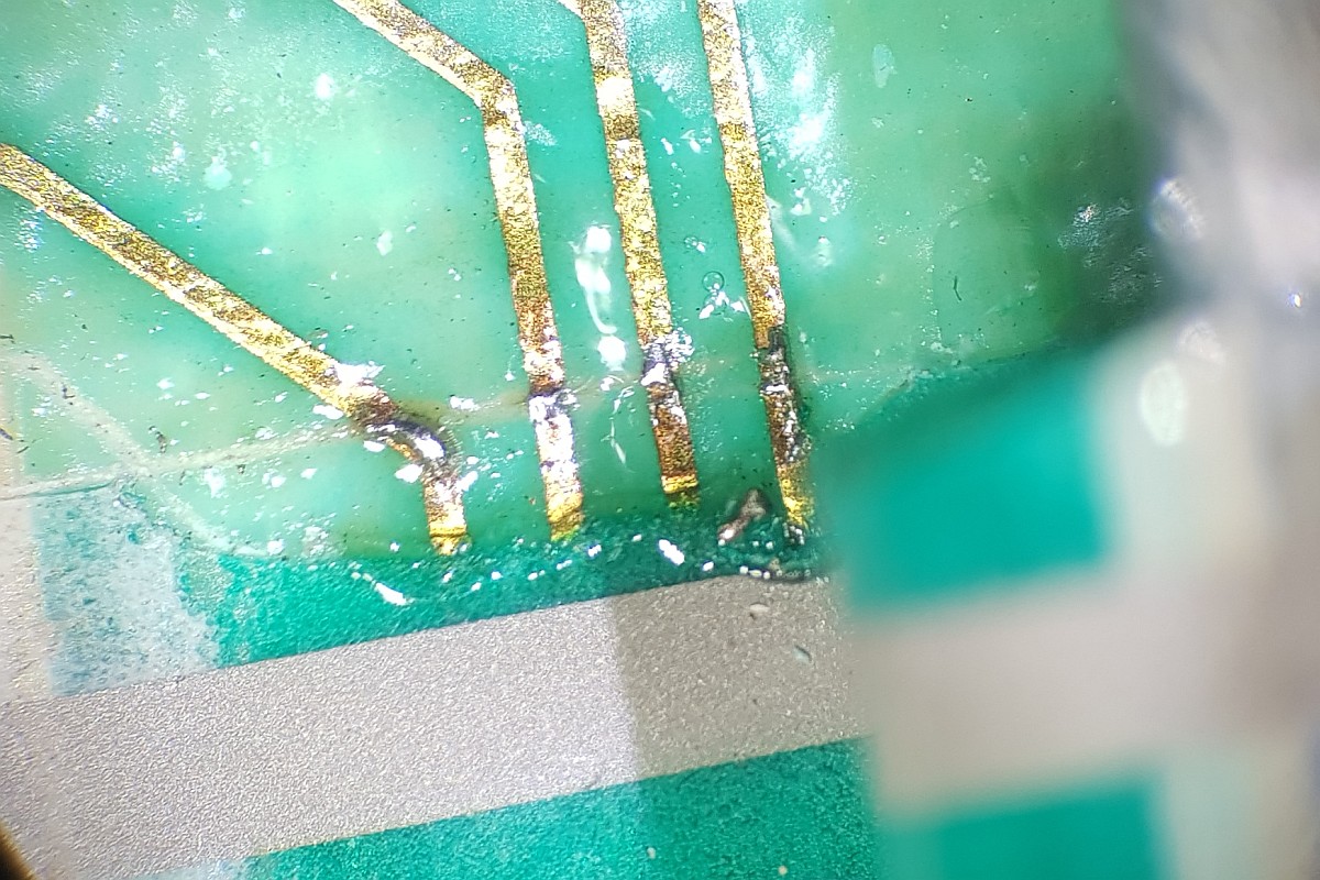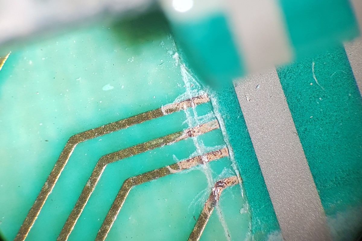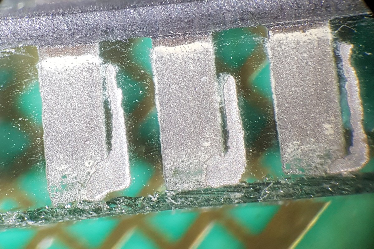 Schon mit unbewaffnetem Auge sieht man, dass die seitliche Leiterbahnfolie sehr verrutscht aufgeklebt wurde.