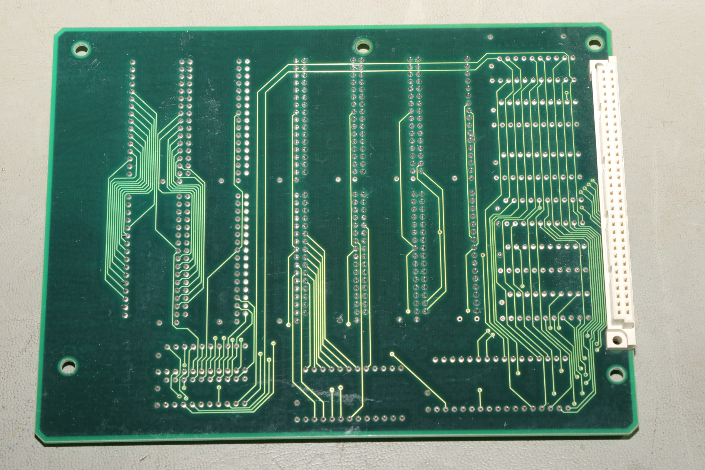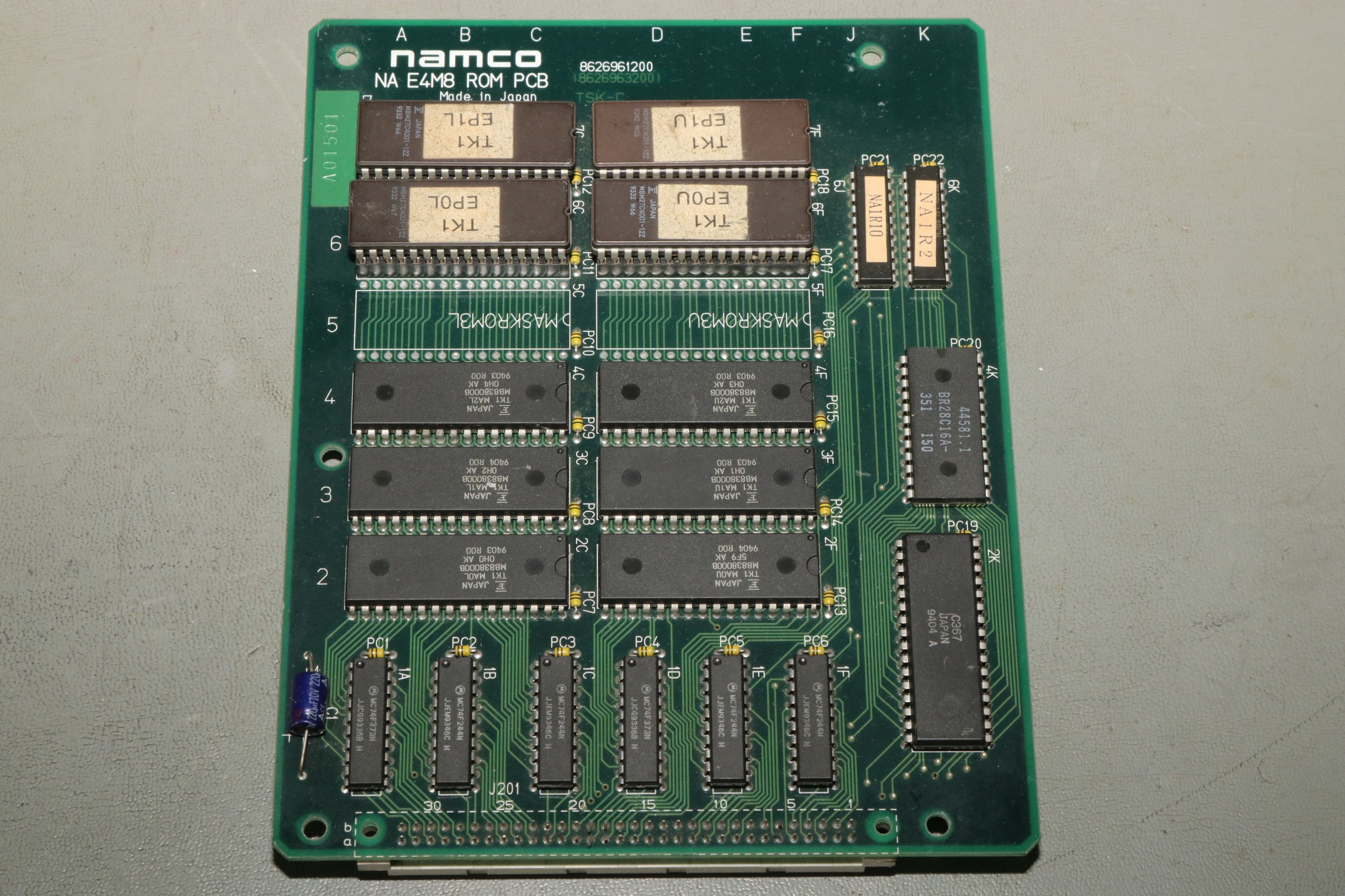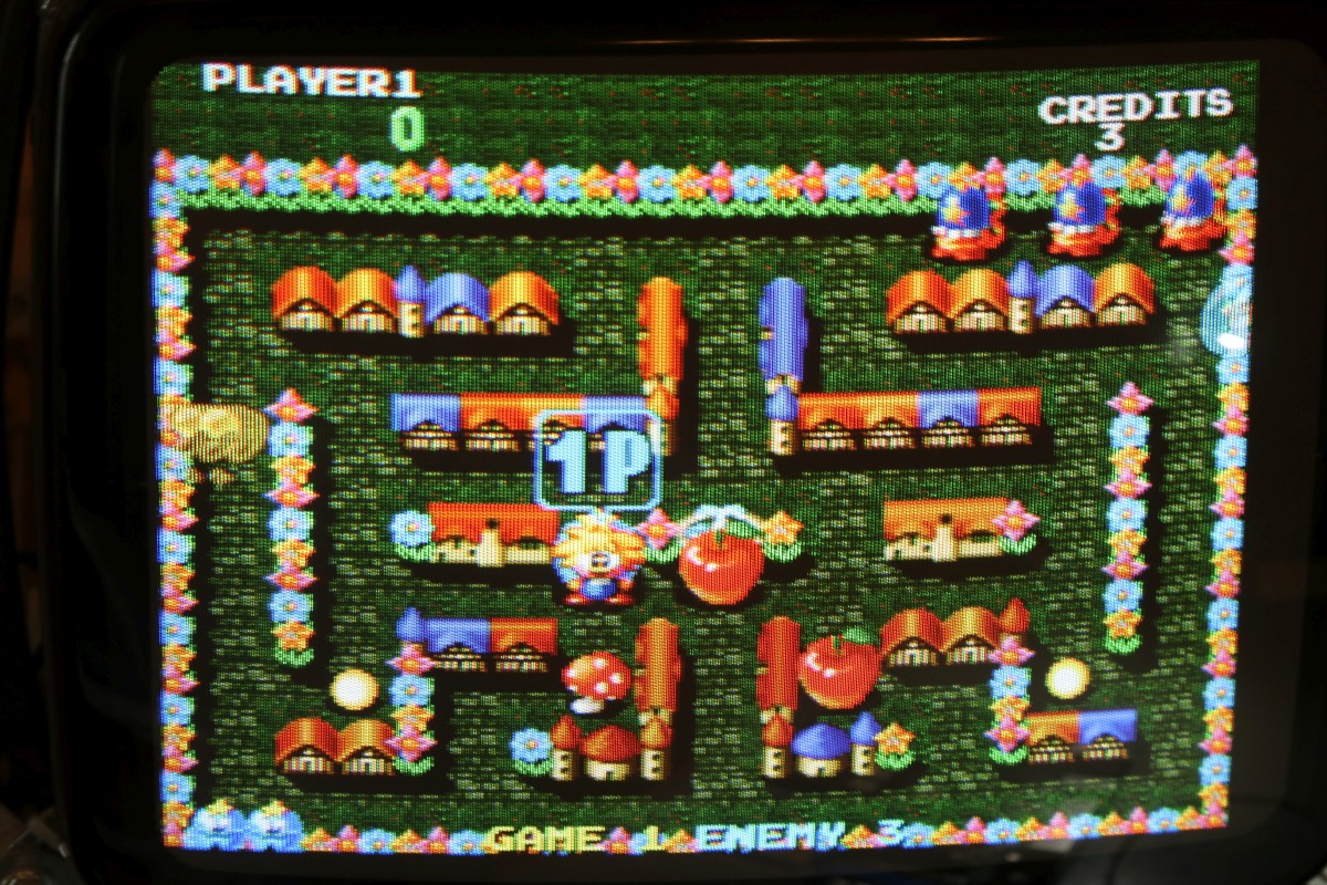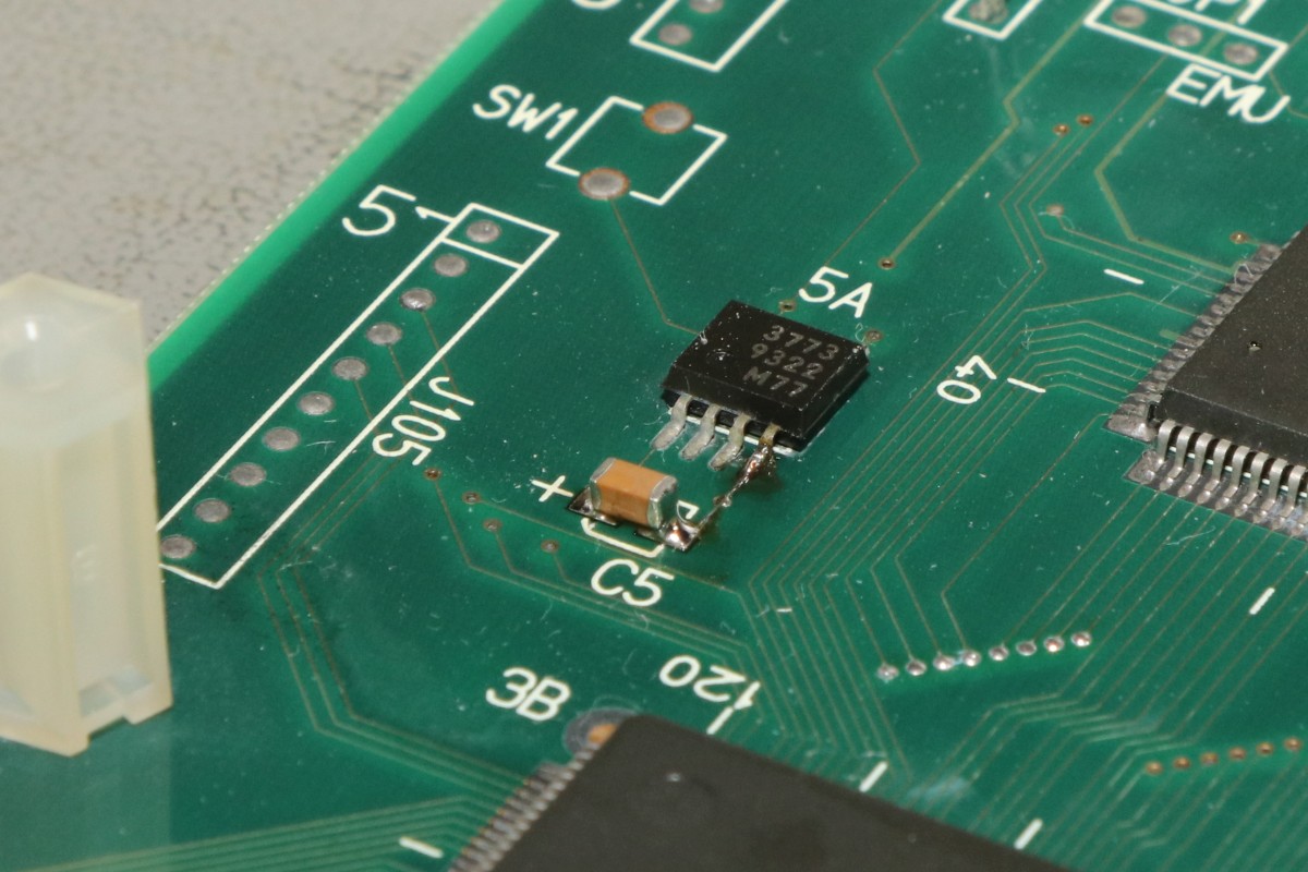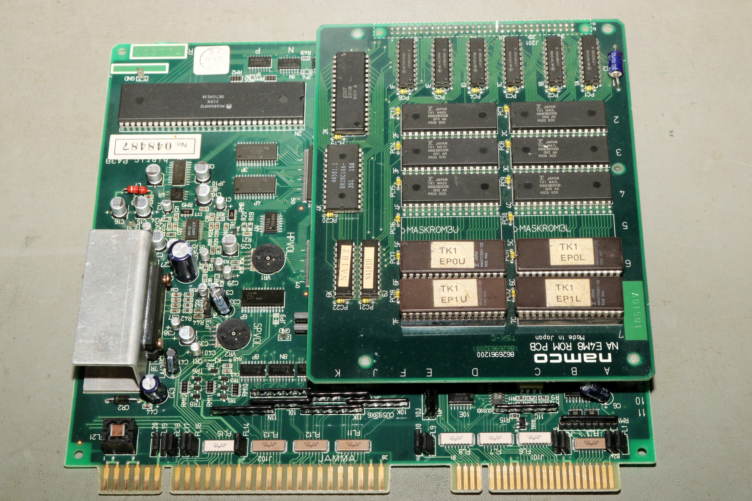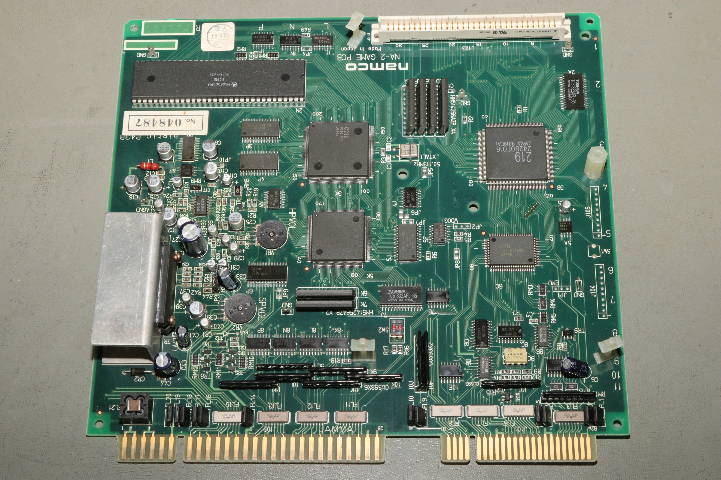 {Eine Exvania Conversion} Das Namco NA-1 System ist berühmt und berüchtigt zugleich: ein 68000er System mit separaten ROM-Boards und natürlich passenden Security-Chips, damit man nicht einfach die Spiele durch EPROM-Kopieren austauschen kann. Mittlerweile gibt es dank extrem heller Köpfe alle ROMs auch in entschlüsselter Form, da kann man tolle Conversions draus basteln. Berüchtigt ist das Namco-System vor Allem aber durch seine inkontinenten SMD-Elkos! Die laufen alle (!) mit der Zeit aus und verätzen die haarfeinen Leiterbahnen und Durchkontaktierungen. Bemerkt man das nicht rechtzeitig, so ist das Motherboard zumindest unwiederbringlich verloren! Deswegen gibt es auf dem freien Markt sehr viele ROM-Boards aber kaum Motherboards, und wenn, dann defekt (aka "nicht getestet", was bei ebay eigentlich immer "Kernschrott" bedeutet...) oder extrem teuer (was defekt nicht zwingend ausschließt!). Ich bekam dank eines freundlichen Hinweises aus einem Forum ein Exemplar "Tinkle Pit" in recht gutem Zustand und deklariert als "voll funktionsfähig"... Der Audiobereich ist zuerst von der Elkopest betroffen, man merkt es am immer schlechter werdendem Sound. Dieser hier sieht noch echt gut aus, auch wenn die Pads schon langsam grau werden... Sound geht einwandfrei, Bild auch - nur um sicher zu gehen. Wenn nachher was nicht funktioniert, war ich selber schuld! Die Elkos haben schon gearbeitet... es wird dringend Zeit für einen Austausch! Unter dem ROM-Board sitzt noch ein einzelner Elko, der die Spannungsüberwachung bedient - und im Auslauffall auch grandios erledigt. Hier hat der Vorbesitzer schon erfolgreich geflickt. Aber warum zum Teufel hat er die Elkos dann nicht alle gleich getauscht? Die Lötstellen sind alle nachgelötet - die Elkos sind alle alt und undicht. Raus damit! Zwei Einzellötkolben ersetzen eine Lötpinzette... Wenn man das zusammen mit seiner Tochter macht, dann geht das unglaublich fix. Die Drecksbecher... Sauber neu verzinnt... Und nach einer sehr gründlichen Reinigung mit Bürste und Spüli (in den Vias setzt sich das Zeug auch ab! Hier hoffe ich, dass die Ätzerei ohne Nachschub langfristig aufhört!) kommen neue Elkos drauf. SMD hab ich nicht, bedrahtet tut auch, ist dicht und funktioniert. Ja, perfekt geht anders! Die kleinen Kondensatoren gehen auch in keramisch. Ein Test mit dem originalen ROM-Board zeigt: alles läuft einwandfrei! Immerhin, nichts zerstört! Jetzt müssen die ROMs raus - warum sind da welche direkt eingelötet? Mein Heißluftfön leistet ganze Arbeit. Die Alufolie schont die umliegenden Bauteile... Jetzt wird alles gesockelt. Zusammenstecken - Exvania startet nicht... was zum T... Ich stöpsel die alten ROMs drauf... Das Spiel geht. Eine Mail an den Ersteller der Decrypted ROMs beantwortet mir fix die Frage aller Fragen: der KEYCUS (Entschlüsselungs-Custom-Chip) stört speziell bei diesem ROM-Board den Bus... Kaum ist der auch rausgelötet, läuft das Spiel perfekt! Geil! Exvania - wie Bomberman, nur viel besser. Der langgehegte Wunsch meiner Tochter, sie hat selbst gelötet und alles mitgemacht, vor Allem hat sie die Platine bezahlt. Die einzige Arcade-Platine, die mir nicht gehört... Und ja, noch ein typisches Problem der Namco-Platinen: die keramischen Filter an den Eingängen verlieren gerne den Kontakt. Manche Pins lassen sich wieder festlöten, wenn es nicht klappt, dann ist Fädeldraht angesagt! Jetzt klappt auch der Zweispielermodus perfekt und der macht richtig Spaß! Hier jetzt noch die einzelnen Platinen in hochauflösender Form: |