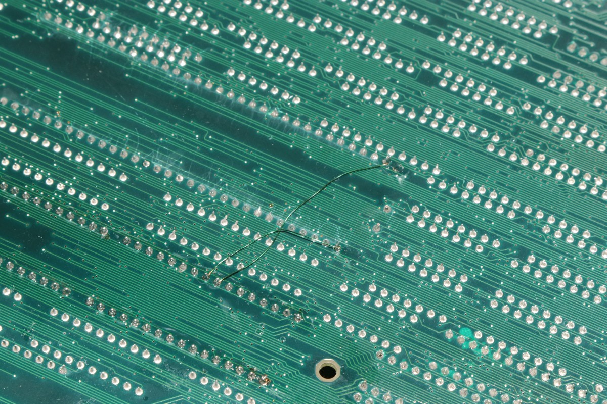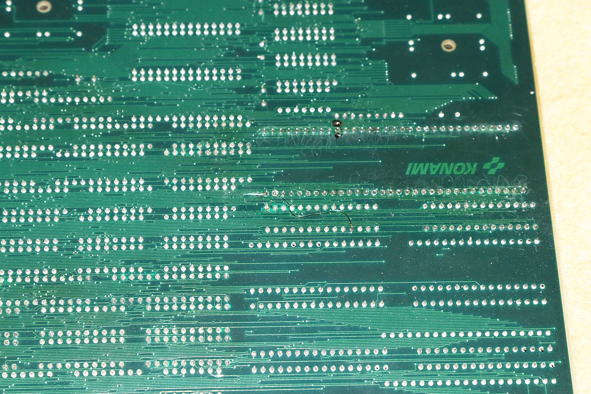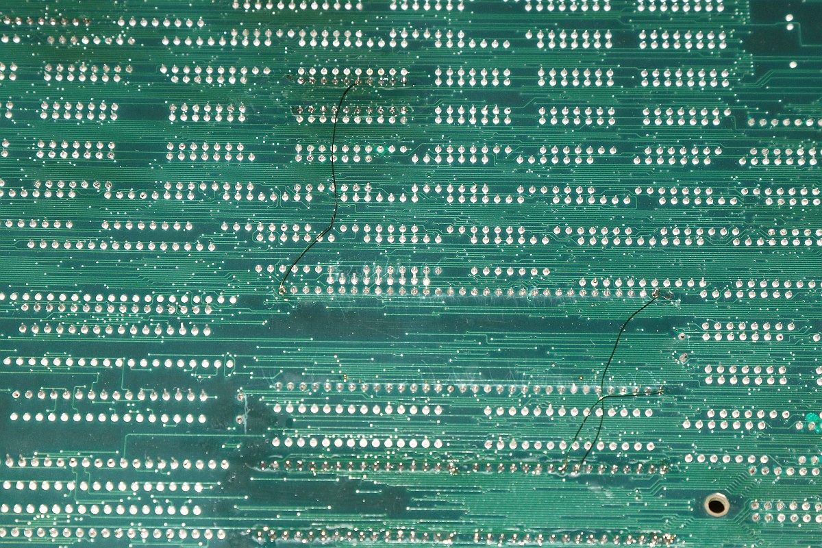 {Gradius III Wiederbelebung} Heute mal eine Erfolgsgeschichte, die ich so nicht erwartet hätte: Konami Gradius III. Ein Monster aus zwei 68000 CPUs, jeder Menge Customs und so dicht bestückt, dass man die Leiterbahnen kaum noch sieht - die im Übrigen meist nur haardünn sind. Hier mal die hoch auflösenden Platinenfotos: Diese Platine ist mittlerweile ziemlich wertvoll, wenn sie läuft... Und normalerweise fasse ich Platinen mit 68000ern nicht an, aber hier habe ich mal eine Ausnahme gemacht. Das Drama in Kürze: zwei 68000er mit massiven Kontaktproblemen, ein defekter Bustreiber, ein defektes RAM und kein Schaltplan. So kam die Platine bei mir an: beide CPUs im Schlafmodus, Datenbusse hochohmig. Bei so einem wertvollen Stück kitzelte mein Ehrgeiz. Die Videosektion geht zumindest, die CPU räumt aber nicht mal den Bildschirmspeicher auf. Beide 68000er zucken nicht mal, Master-CPU-Reset/Halt geht nach wenigen 100ms ordnungsgemäß auf High. Wenn 68000er garnicht mitspielen wollen, dann ist (wenn sie nicht defekt sind) irgendwas am Adress-/Datenbus im Argen, das Programm-ROM wird nicht richtig abgefragt. Das Fiese bei den 68000ern: die machen dann genau nichts. Und wo nichts läuft, kann man eben auch schlecht messen. Aber die Platine ändert ihr Verhalten sporadisch, wenn man sie verbiegt. Manchmal springt dann der Master-68000 kurz an. Ich klingle die Verbindungen zwischen ROM und CPU durch und finde eine Unterbrechung! Die B-CPU ist noch schlimmer dran: da hat schon mal wer alles ausgelötet und einen Sockel gepfriemelt. Mein Stereomikroskop zeigt mir nichts Gutes, auch hier dürften diverse Unterbrechungen lauern... Nachdem die Adressleitung A5 stabil war, wurde das Bild schon etwas aussagekräftiger. Um jetzt allen Spekulationen ein Ende zu machen, hab ich die ROMs neu gesockelt und dabei alle Adress- und Datenleitungen drchgeklingelt. Sockel sauber entfernt. Hier sieht man die haarfeinen Leiterbahnen genauer: Uns sauber neu bestückt - die Sockel fallen jetzt schon mal als Fehlerquelle aus! A4 war auch unterbrochen. Mit viel Glück und Druck auf die Slave-CPU kommen wir jetzt schon mal (manchmal) zum Speichertest. Der Tausch von Video-RAM R03 ist geradezu ein Kindergeburtstag. Was mich irre macht, ist die nur sporadische Mitarbeit vom CPU B. Auch hier liegen massive Wackler vor - aber wie findet man die zielgerichtet ohne Schaltplan? Ganz einfach! Bei entfernter CPU (die ist ja gottseidank gesockelt) misst man mit dem Ohmmeter jeden Pin gegen Masse oder +5V. Wirklich jeder angeschlossene Pin sollte bei dieser Messung irgendeinen Wert bis hin zu 3MOhm zeigen. Wenn das Messgerät eine völlige Unterbrechung anzeigt, dann hat der Pin keinen Kontakt. Dass manche Pins tatsächlich nicht verbunden sind, ist normal. Man benötigt nicht alle Pins des 68000ers. Aber bei Pin 10 sollte das nicht so sein: DTACK# ist für die Buskommunikation wichtig. Voila! Unterbrechung gefunden, gefädelt, gelöst. Und ja, das RAM an R03 geht jetzt. Und die CPU B springt jetzt immer brav an, sobald die Master-CPU ihren Reset freischaltet. Das Video-RAM auf D27 macht es einem nicht leicht. Der RAM Tausch behebt das Problem nicht. Ein Datenbusbit ist stuck high. Ohne Schaltplan muss man mühsam die Verbindungen suchen. Das dauert. Ein Multiplexer ist mit in der Kette und liefert ein halblebiges Signal. Der war's aber nicht... Verursacher ist ein Bustreiber. Der ist zwar tatsächlich defekt, aber der Tausch löst das Problem nicht, da es noch eine weitere Datenbusunterbrechung zur CPU gibt. Fies, denn zum ROM hatte ich alles getestet. Jetzt steigt die Spannung: Alle RAMs und ROMs sind brav... Testgrid... Uff! Der Lohn von diversen Stunden Fummelarbeit! Jetzt bin ich doch froh, dass ich mir diese Platine angetan habe! Und das Fazit? Große Platinen mit 68000er CPUs habe ein Problem: die Leiterplatten sind recht flexibel - die CPUs mit ihren 64 Beinchen nicht. Verbiegt man die Leiterplatten zu stark, dann nehmen die mechanischen Spannungen auf die äußeren Beinchen stark zu, bei sehr dünnen Leiterbahnen reißen die Kontakte. Und wie man hier deutlich sehen kann, sind die äußeren Pins an den Ecken der CPU betroffen. Ich habe viel gelernt, ihr hoffentlich auch! Und das Gefühl, eine einst tote Gradius III wieder funktionierend auf dem Labortisch zu haben, ist fast unbezahlbar. ;-) |