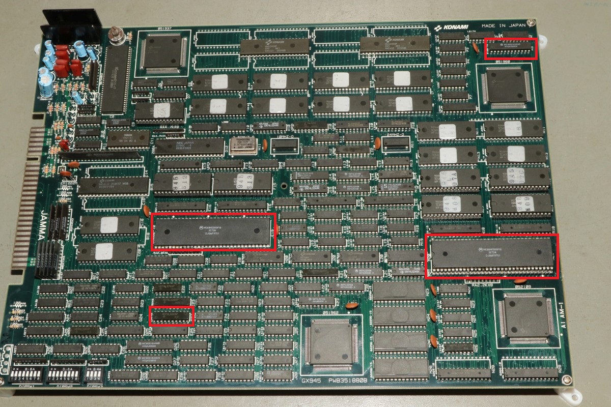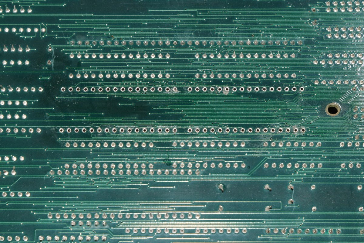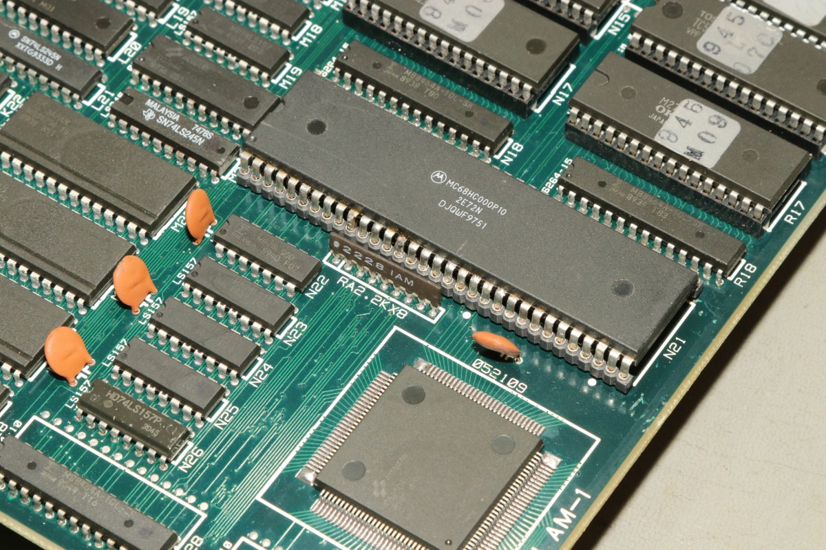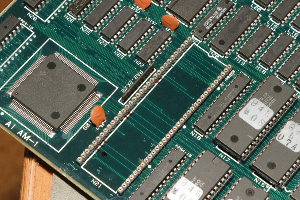 {Gradius III Wiederbelebung} Heute mal eine Erfolgsgeschichte, die ich so nicht erwartet hätte: Konami Gradius III. Ein Monster aus zwei 68000 CPUs, jeder Menge Customs und so dicht bestückt, dass man die Leiterbahnen kaum noch sieht - die im Übrigen meist nur haardünn sind. Hier mal die hoch auflösenden Platinenfotos: Diese Platine ist mittlerweile ziemlich wertvoll, wenn sie läuft... Und normalerweise fasse ich Platinen mit 68000ern nicht an, aber hier habe ich mal eine Ausnahme gemacht. Das Drama in Kürze: zwei 68000er mit massiven Kontaktproblemen, ein defekter Bustreiber, ein defektes RAM und kein Schaltplan. So kam die Platine bei mir an: beide CPUs im Schlafmodus, Datenbusse hochohmig. Bei so einem wertvollen Stück kitzelte mein Ehrgeiz. Die Videosektion geht zumindest, die CPU räumt aber nicht mal den Bildschirmspeicher auf. Beide 68000er zucken nicht mal, Master-CPU-Reset/Halt geht nach wenigen 100ms ordnungsgemäß auf High. Wenn 68000er garnicht mitspielen wollen, dann ist (wenn sie nicht defekt sind) irgendwas am Adress-/Datenbus im Argen, das Programm-ROM wird nicht richtig abgefragt. Das Fiese bei den 68000ern: die machen dann genau nichts. Und wo nichts läuft, kann man eben auch schlecht messen. Aber die Platine ändert ihr Verhalten sporadisch, wenn man sie verbiegt. Manchmal springt dann der Master-68000 kurz an. Ich klingle die Verbindungen zwischen ROM und CPU durch und finde eine Unterbrechung! Die B-CPU ist noch schlimmer dran: da hat schon mal wer alles ausgelötet und einen Sockel gepfriemelt. Mein Stereomikroskop zeigt mir nichts Gutes, auch hier dürften diverse Unterbrechungen lauern... Nachdem die Adressleitung A5 stabil war, wurde das Bild schon etwas aussagekräftiger. Um jetzt allen Spekulationen ein Ende zu machen, hab ich die ROMs neu gesockelt und dabei alle Adress- und Datenleitungen drchgeklingelt. Sockel sauber entfernt. Hier sieht man die haarfeinen Leiterbahnen genauer: Uns sauber neu bestückt - die Sockel fallen jetzt schon mal als Fehlerquelle aus! A4 war auch unterbrochen. Mit viel Glück und Druck auf die Slave-CPU kommen wir jetzt schon mal (manchmal) zum Speichertest. Der Tausch von Video-RAM R03 ist geradezu ein Kindergeburtstag. Was mich irre macht, ist die nur sporadische Mitarbeit vom CPU B. Auch hier liegen massive Wackler vor - aber wie findet man die zielgerichtet ohne Schaltplan? Ganz einfach! Bei entfernter CPU (die ist ja gottseidank gesockelt) misst man mit dem Ohmmeter jeden Pin gegen Masse oder +5V. Wirklich jeder angeschlossene Pin sollte bei dieser Messung irgendeinen Wert bis hin zu 3MOhm zeigen. Wenn das Messgerät eine völlige Unterbrechung anzeigt, dann hat der Pin keinen Kontakt. Dass manche Pins tatsächlich nicht verbunden sind, ist normal. Man benötigt nicht alle Pins des 68000ers. Aber bei Pin 10 sollte das nicht so sein: DTACK# ist für die Buskommunikation wichtig. Voila! Unterbrechung gefunden, gefädelt, gelöst. Und ja, das RAM an R03 geht jetzt. Und die CPU B springt jetzt immer brav an, sobald die Master-CPU ihren Reset freischaltet. Das Video-RAM auf D27 macht es einem nicht leicht. Der RAM Tausch behebt das Problem nicht. Ein Datenbusbit ist stuck high. Ohne Schaltplan muss man mühsam die Verbindungen suchen. Das dauert. Ein Multiplexer ist mit in der Kette und liefert ein halblebiges Signal. Der war's aber nicht... Verursacher ist ein Bustreiber. Der ist zwar tatsächlich defekt, aber der Tausch löst das Problem nicht, da es noch eine weitere Datenbusunterbrechung zur CPU gibt. Fies, denn zum ROM hatte ich alles getestet. Jetzt steigt die Spannung: Alle RAMs und ROMs sind brav... Testgrid... Uff! Der Lohn von diversen Stunden Fummelarbeit! Jetzt bin ich doch froh, dass ich mir diese Platine angetan habe! Und das Fazit? Große Platinen mit 68000er CPUs habe ein Problem: die Leiterplatten sind recht flexibel - die CPUs mit ihren 64 Beinchen nicht. Verbiegt man die Leiterplatten zu stark, dann nehmen die mechanischen Spannungen auf die äußeren Beinchen stark zu, bei sehr dünnen Leiterbahnen reißen die Kontakte. Und wie man hier deutlich sehen kann, sind die äußeren Pins an den Ecken der CPU betroffen. Ich habe viel gelernt, ihr hoffentlich auch! Und das Gefühl, eine einst tote Gradius III wieder funktionierend auf dem Labortisch zu haben, ist fast unbezahlbar. ;-) |
