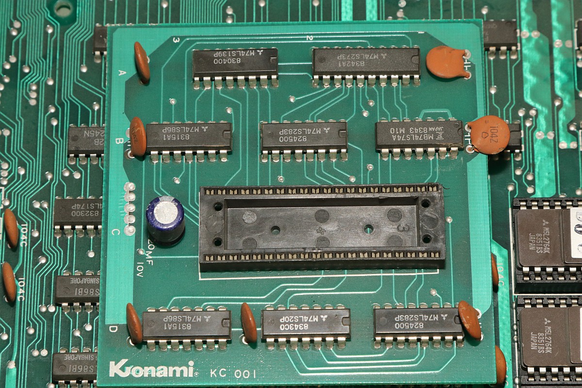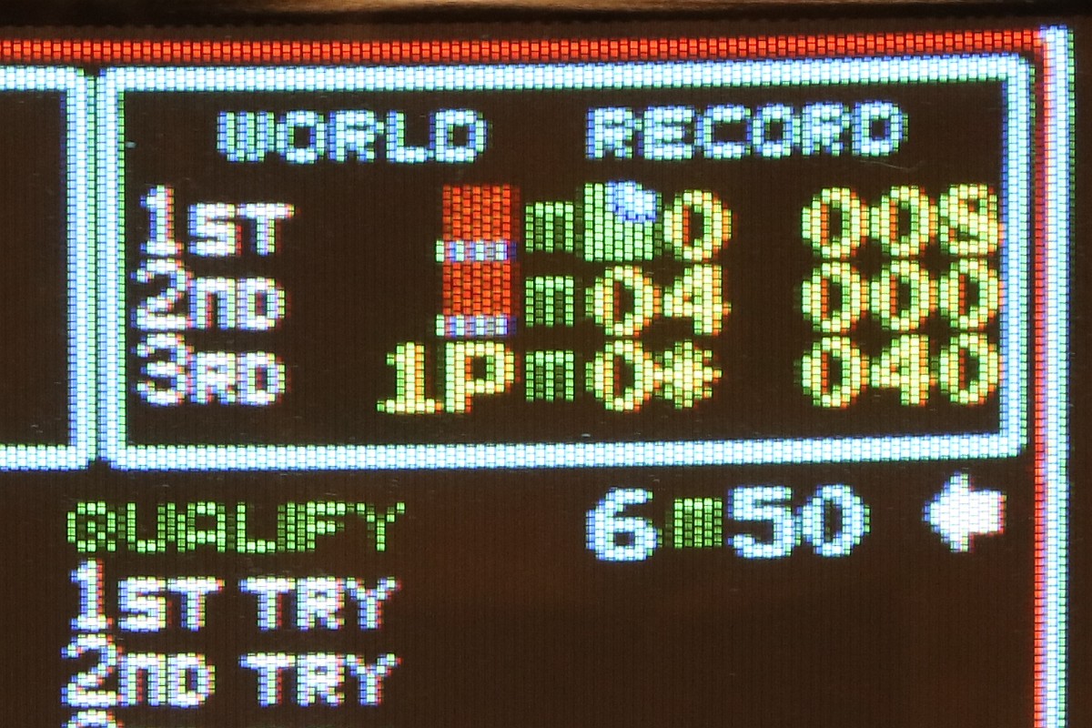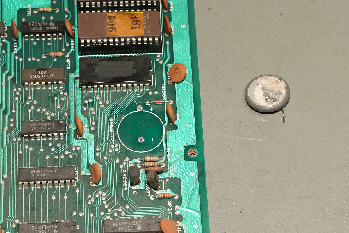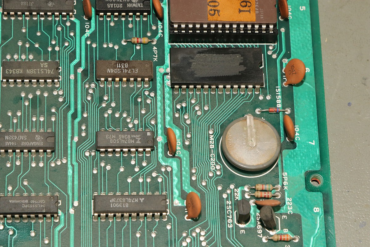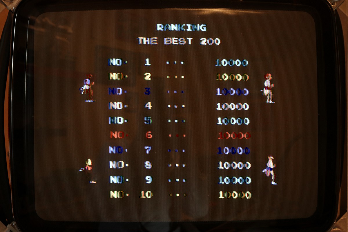 {Hyper Olympics} Ein schönes sauberes Konami Original Hyper Olympics kam zu mir. Diagnose: Grafikfehler. Ja, stimmt. Da stimmt was mit dem Textscreen nicht - aber Moment: nur bei den High-Score-Listen! Die PCB sieht vorbildlich aus! Lustig, wenn dem Hersteller die eigenen Customs ausgehen und er diskrete Nachbauten nachfertigen lassen muss... Andererseits, ohne die hätte es nicht so schnell Bootlegs gegeben. Zum eigentlichen Thema: die "Grafikfehler" sind der leeren Backup-Batterie geschuldet, die eigentlich die Highsores im daneben liegenden (und abgeschliffenen) RAM 6116 halten sollte... Wenn die Batterie leer ist, dann steht im RAM Müll. Und der Müll wird auch angezeigt, da findet keine Kontrolle statt! Sieht bunt aus... Eine neue Lithium-Zelle liefert wieder mehr als 3 Volt. Und wenn man jetzt über den DIP-Schalter noch die Highscores zurücksetzt, dann ist auch alles wieder in bester Ordnung. Solange, bis die Batterie wieder leer ist - aber jetzt wissen wir ja, woran es liegt. ;-) |