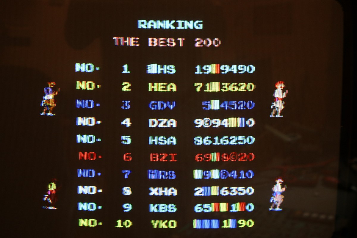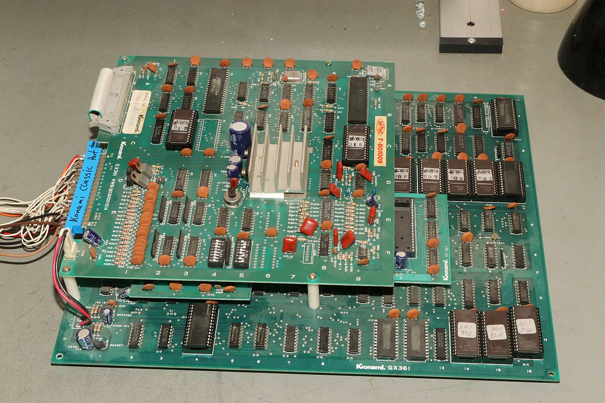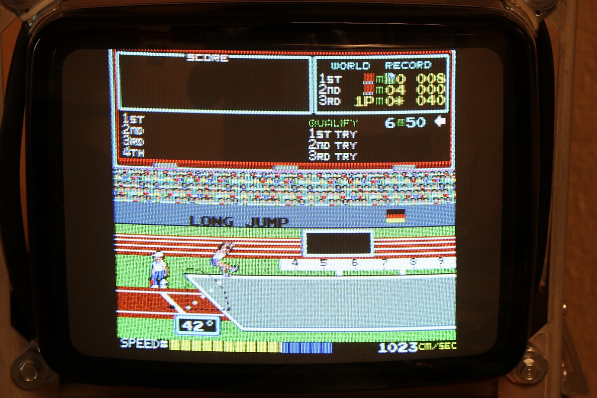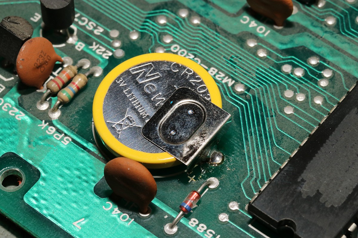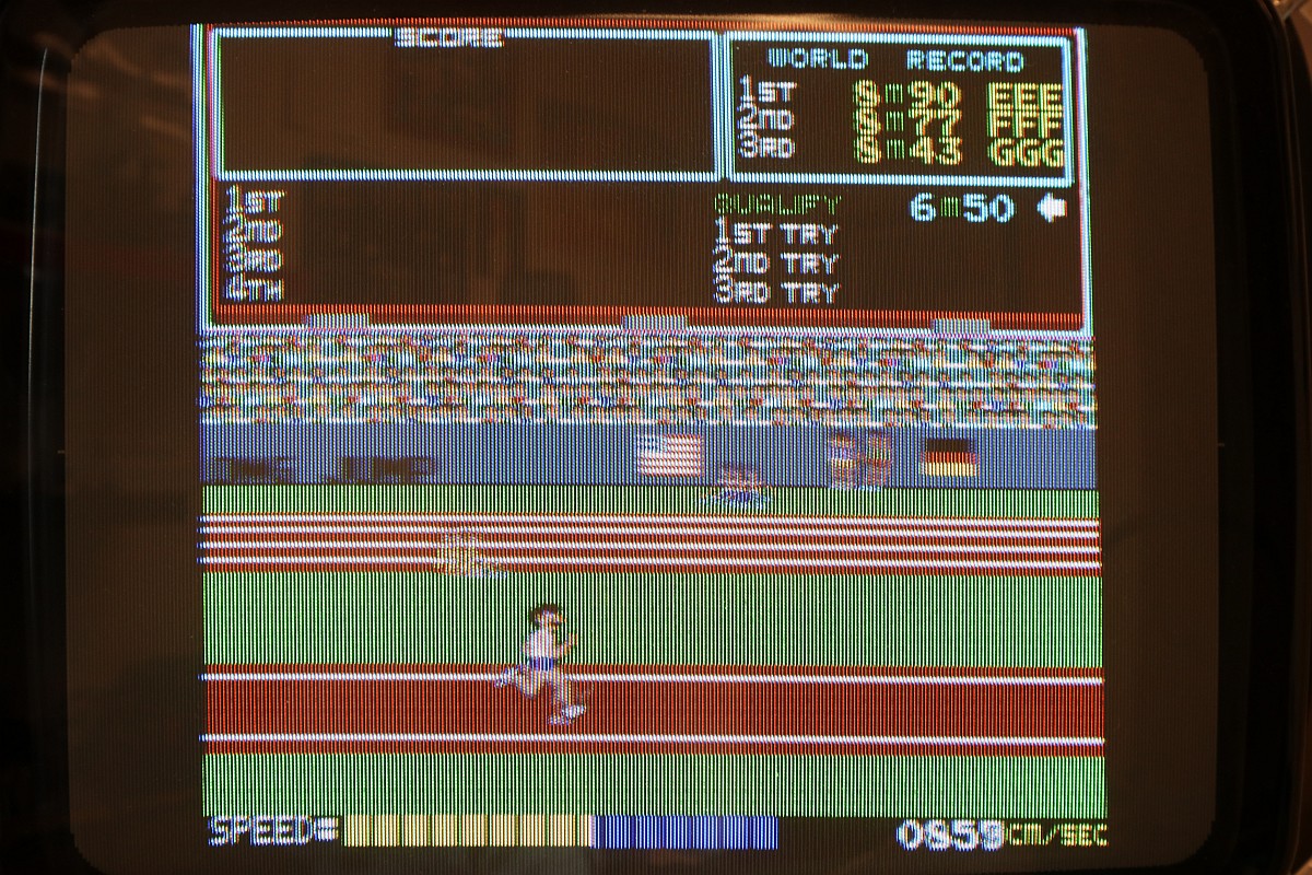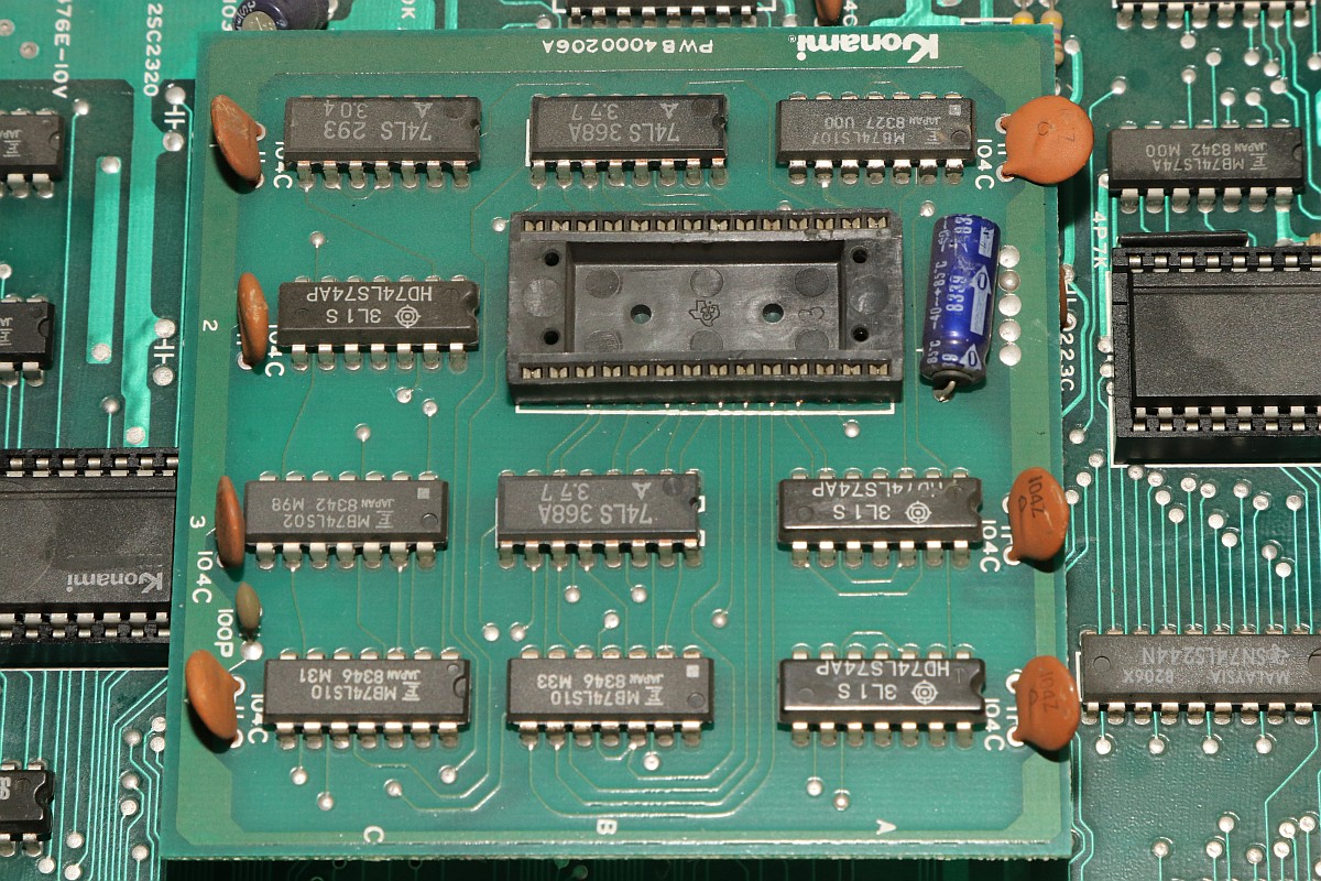 {Hyper Olympics} Ein schönes sauberes Konami Original Hyper Olympics kam zu mir. Diagnose: Grafikfehler. Ja, stimmt. Da stimmt was mit dem Textscreen nicht - aber Moment: nur bei den High-Score-Listen! Die PCB sieht vorbildlich aus! Lustig, wenn dem Hersteller die eigenen Customs ausgehen und er diskrete Nachbauten nachfertigen lassen muss... Andererseits, ohne die hätte es nicht so schnell Bootlegs gegeben. Zum eigentlichen Thema: die "Grafikfehler" sind der leeren Backup-Batterie geschuldet, die eigentlich die Highsores im daneben liegenden (und abgeschliffenen) RAM 6116 halten sollte... Wenn die Batterie leer ist, dann steht im RAM Müll. Und der Müll wird auch angezeigt, da findet keine Kontrolle statt! Sieht bunt aus... Eine neue Lithium-Zelle liefert wieder mehr als 3 Volt. Und wenn man jetzt über den DIP-Schalter noch die Highscores zurücksetzt, dann ist auch alles wieder in bester Ordnung. Solange, bis die Batterie wieder leer ist - aber jetzt wissen wir ja, woran es liegt. ;-) |