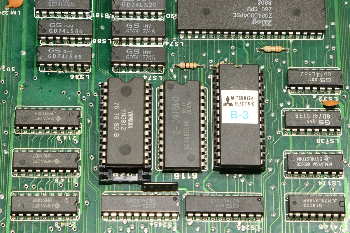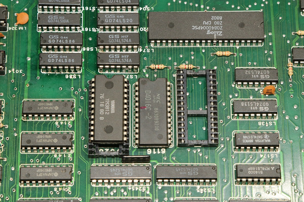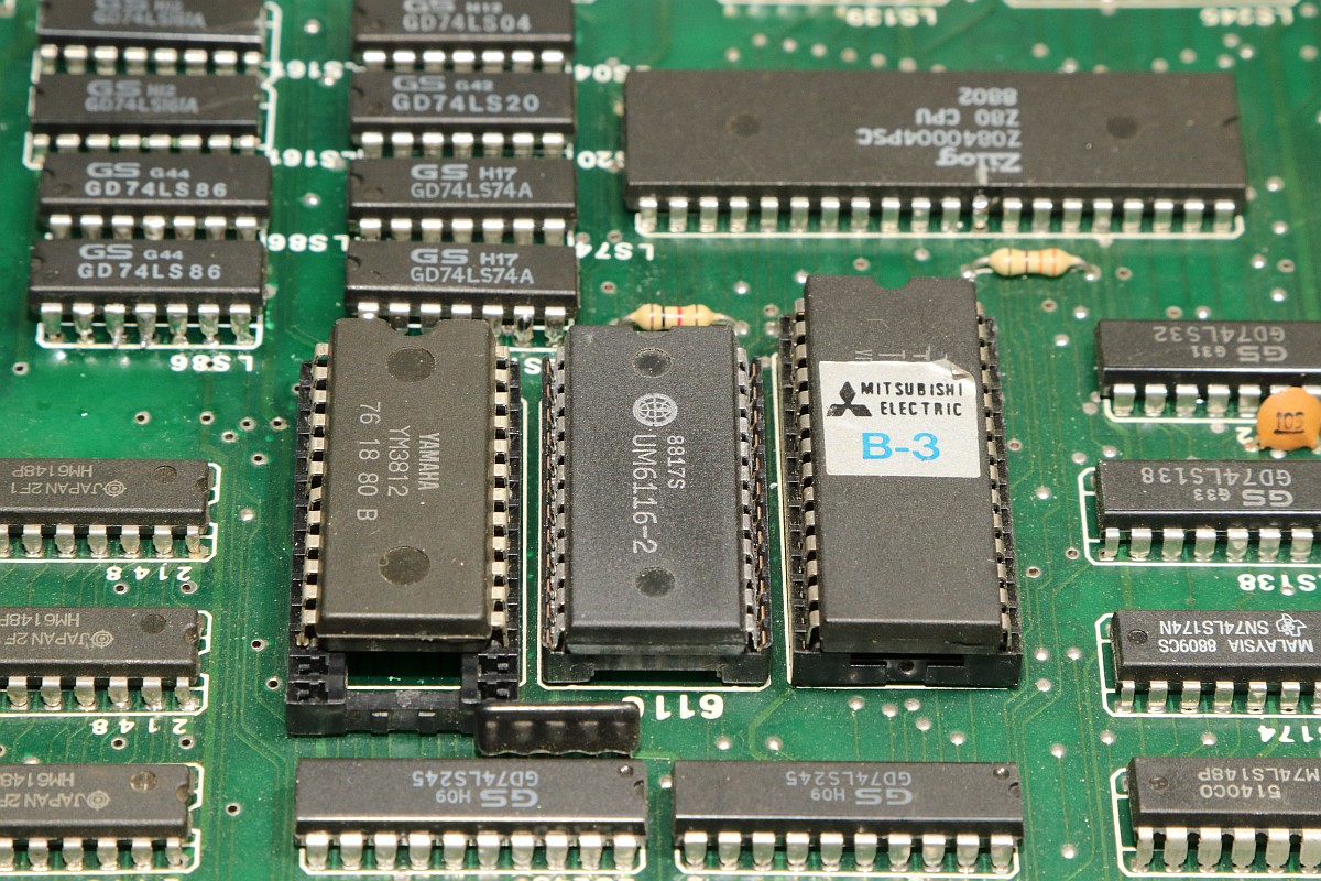 Sodele. Nach Tausch von RAM und ROM (hier ist noch das alte ROM drin) geht der Sound wieder. Wir werden nie erfahren, warum beide Bausteine defekt sind... eigentlich ist ja der Z80 die einzige Quelle für den Adressbus...