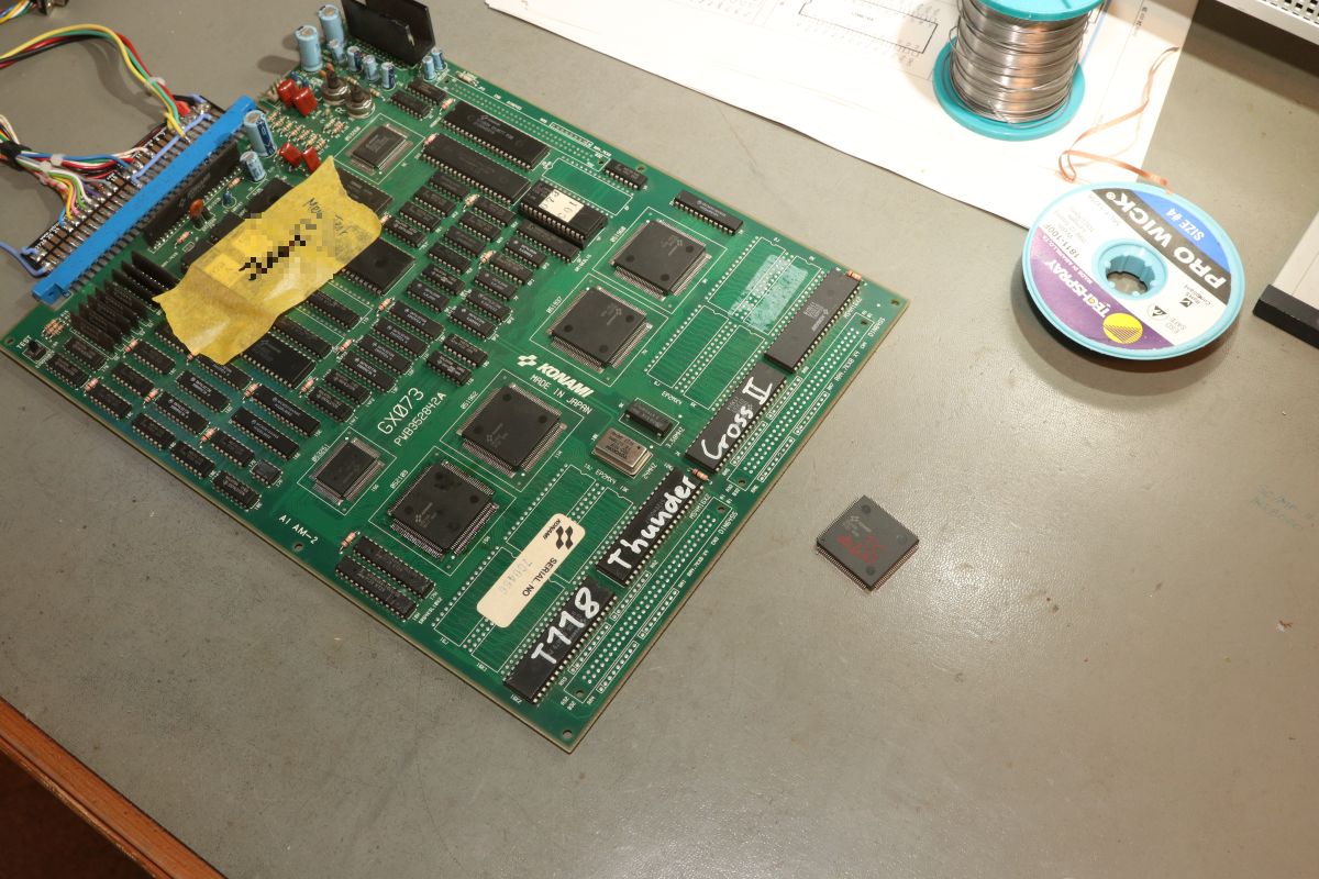 {Thunder Cross II} Ich mag es, wenn Spiele eindeutige Fehlermeldungen geben... hier mal eine Konami Thunder Cross II Platine: OK, so ganz eindeutig ist das jetzt nicht... die Platine stottert... Um genau herauszufinden, was mir die Testroutine sagen möchte, suche ich mal einen Reparaturbericht aus dem Internet... So sieht das aus, wenn die Platine noch keinen Logopäden braucht: Folglich sind also RAM 17H und 18H suspekt. Da kann man schon mal gezielt suchen und siehe da - Adressbit A0 ist stuck high. Das erklärt die Doppelung der Textzeichen. Die beiden RAMs hängen ausschließlich am Konami Custom 052109. Ein Durchzwicken des Adresspins am RAM zeigt, dass die RAMs selber nicht die Fehlerquelle sind. Ich befürchte einen Defekt im Custom - die Adressleitung hat immerhin nur noch 2,7 Ohm gegen +5V. Ich lifte mal das Beinchen 2... Yepp... der Custom ist hin. Den gibt es leider nicht mehr im Konami-Fachhandel. Aber ich habe zeitgleich eine Parodius mit zur Reparatur bekommen, die völlig defekt ist... vielleicht haben wir ja Glück. Der Custom hier muss raus - dafür ist der Heißluftfön gut... ...entfernt... ...geputzt... Die Parodius wird einer sinnvollen Zweitverwertung zugeführt: Dann wird der Custom unter dem Stereomikroskop sauber ausgerichtet und Pin für Pin vorsichtig wieder verlötet. Das dauert seine Zeit... ...lohnt sich aber... Ein gutes Ballerspiel lebt wieder! Gerade bei Spielen mit Unmengen an Custom Chips ist es gut, diverse Leichen zum Schlachten griffbereit zu haben! |