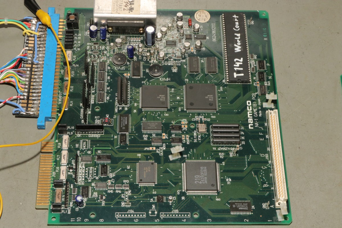 {Namco NA-1 F/A Conversion} Von Namco gibt es für das System NA-1 eigentlich nur zwei interessante Spiele (zumindest nach meinem Geschmack): Exvania und Fighter & Attacker (F/A). Man schenkte mir ein Namco NA-1-Board... Das Problem: Spiel tot. Bei diesen Boards ist das normal: Elkopest! Dieses Exemplar sieht noch relativ gut aus, aber der Verursacher ist schnell gefunden: Reset-Baustein-Elko. Wenn der durch ist, dann springt das Game nicht mehr an. Das IC ist selten defekt, läuft aber ohne Kondensator nicht... Kein Reset, kein Game... Zum Ausprobieren tut's auch ein Kerko mit 10µF - dauert halt entsprechend länger mit dem Aufstart... Scheiß Tennis... da werde ich wohl eine zweite Exvania draus basteln... oder eben: F/A! Aber erst, wenn ich die Elkos im Sound-Bereich alle getauscht habe! Das sind wohl um die 19 Stück - alle werden irgendwann inkontinent und fangen an, die Platine zu verätzen.. Raus damit! Die Pads sind noch alle einwandfrei! Elkos sind bestellt, aber ohne Sound geht's auch ohne Elkos! Nur der eine Kondensator am Reset-Baustein muss drin sein. Das ROM-Board muss wieder bearbeitet werden - warum sind eigentlich die vier PROMs eingelötet? Das hält mich auch nicht auf: hier frisch gesockelt... Eine frische Ladung F/A-ROMs - es müssen die Decrypted-Versionen sein! Und das Board hat plötzlich eine ganz neue Attraktivität bekommen. Obwohl noch ohne Ton, weil die Kondensatoren fehlen... Der Postbote war da... So sieht es zumindest echt original aus! Zum Angriff! |