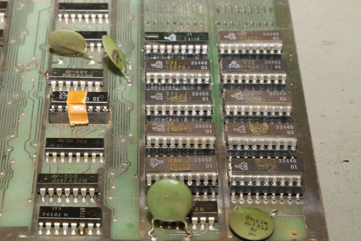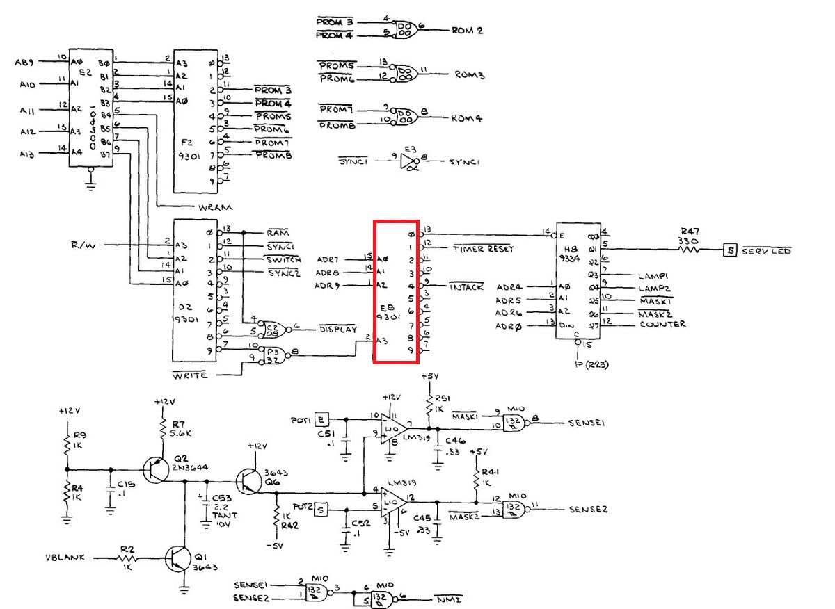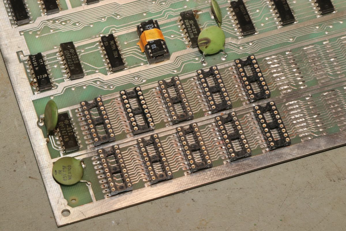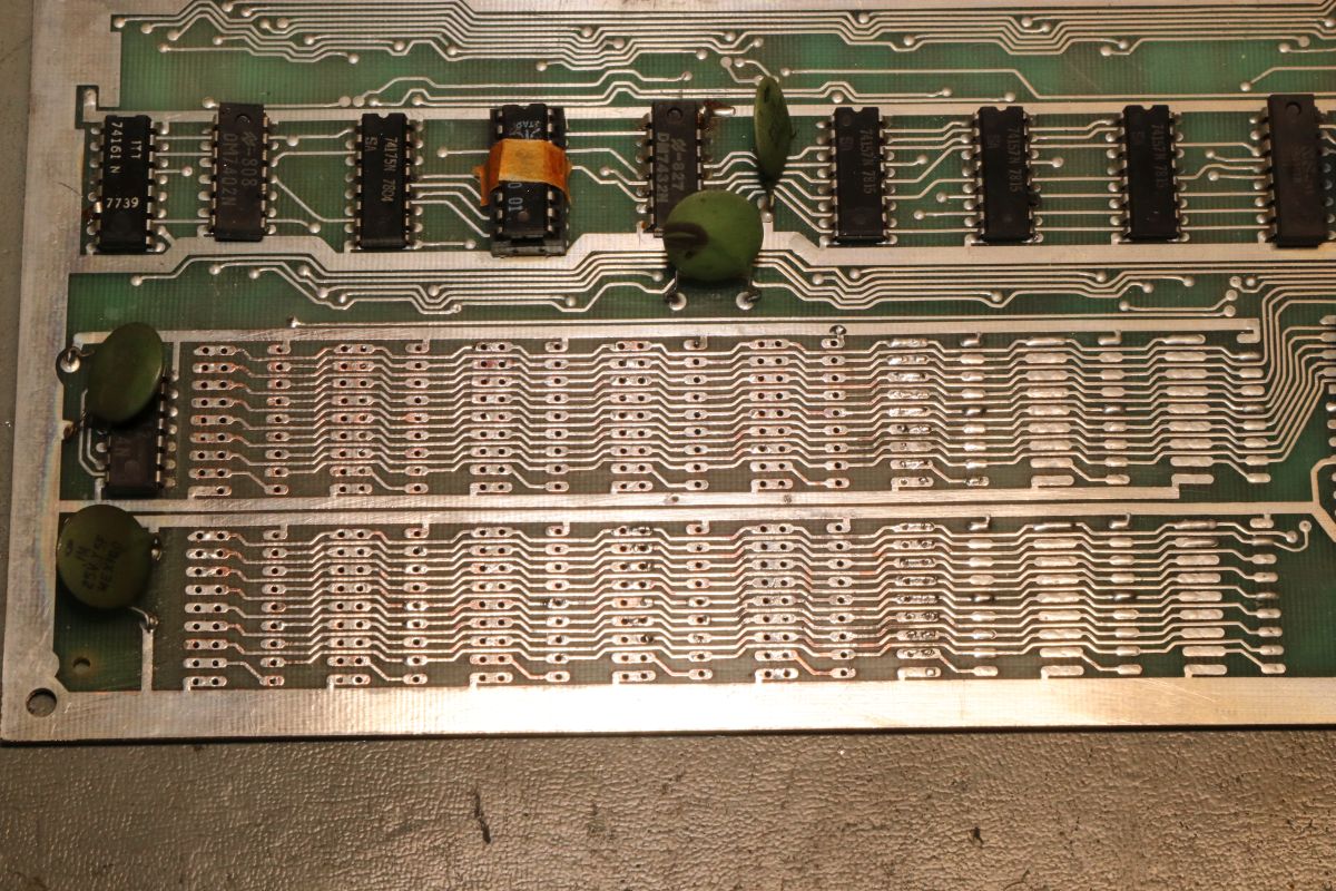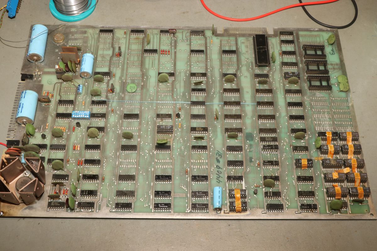 {Super Breakout} Ein weiteres Spiel aus der Arcade-Steinzeit. Aber im Gegensatz zum Breakout besitzt Super Breakout immerhin schon mal einen Prozessor und ein ROM. Der Prozessor ist - trotz verwirrender Atari-Sondernummer 90-6010 - nur ein schnöder 6502. Die ROMs sind bipolare PROMs 1024x4. H-Sync ist vorhanden, V-Sync ist tot und der 6502 ist im Dauerreset. Also fängt man am besten ganz von vorne an: die Taktteilerkette. Ein 74161 (6316) ist völlig tot und unterbricht damit die Teilerorgie. Divide et impera! Der Tausch führt zu einem stabilen guten Videosignal und die 6502 kommt aus dem Reset heraus... Sieht ordentlich aus - aber so richtig ändert sich am Bildinhalt noch nichts.... Da werde ich mich noch weiter durch den Schaltplan durcharbeiten müssen... {Super Breakout - Reparatur} Die CPU läuft ja nicht wirklich gut - ich teste das ROM durch und stelle fest, dass manche ROMs nicht mal 5V bekommen... Das kann ja nicht funktionieren! Die Sockel sind eigentlich gut und vergoldet, aber sie kontaktieren alle nur an einem Punkt am Pin. Durch die hohen Temperaturen der bipolaren PROMs und durch Korrosion ist diese Stelle bei fast allen Pins eingedrückt und extrem korrodiert. Alle Sockel müssen raus! Das ist eine fiese Arbeit... ... die sich lohnt! Jetzt kommen die guten Sockel zum Einsatz. Fertig bestückt, alles kontaktiert. Nichts geht. Mist! Die CPU hängt in der Interrupt-Schleife fest, es gibt kein Interrupt Acknowledge. Das könnte an einem völlig tauben 9301 BCD-zu-Dezimal-Decoder liegen... Ausgelötet ist der Kollege schnell... ... wieder ersetzt hingegen nicht. DM9301 ist Goldstaub. Es gibt ihn schlicht nicht mehr - und wenn, dann zu astronomischen Preisen. Mein Glück ist, dass es sich hierbei um einen 7442 mit unterschiedlichem Pinning handelt. Da muss wohl ein Adaptersockel her! Sieht nur halbwegs gut aus... ... passt aber perfekt. Die CPU läuft! Das Spiel startet, sieht aber noch suboptimal aus. Das nächste Miststück: ein taubes PROM vom Typ 74S131 - ein bipolares PROM 2kx4 Tri-State. Hab ich natürlich nicht vorrätig... Aber hey, noch eine ganze Schublade 74S130 - das Gleiche in Open-Collector! Es kommt wieder mal meine antike Brennerei zum Einsatz: Und Pull-Up-Widerstände machen aus einem Open-Collector fast ein Tri-State - zumindest mit passivem High. Hier reicht das. Das Spiel läuft wieder einwandfrei - sogar mit abwechslungsreichen Spielleveln! Quasi Arkanoid für Arme! Jetzt fehlt noch die Diagnose der Controls und des Sounds. |