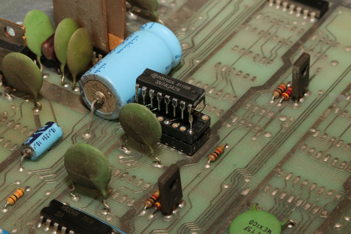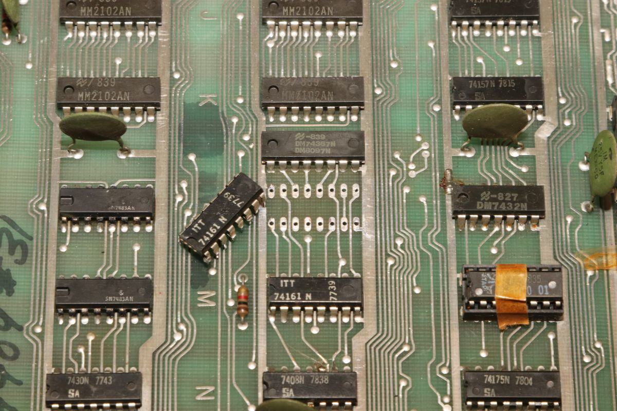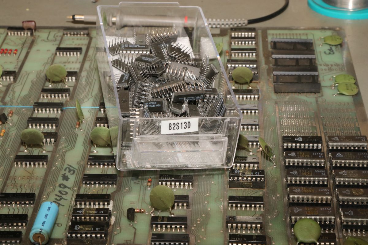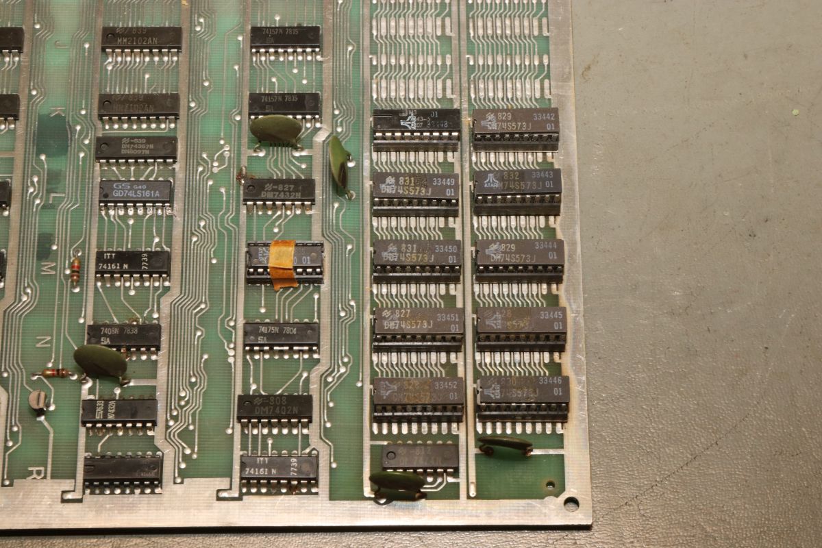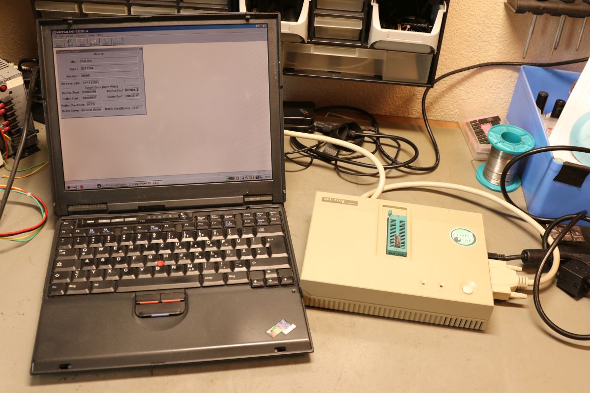 {Super Breakout} Ein weiteres Spiel aus der Arcade-Steinzeit. Aber im Gegensatz zum Breakout besitzt Super Breakout immerhin schon mal einen Prozessor und ein ROM. Der Prozessor ist - trotz verwirrender Atari-Sondernummer 90-6010 - nur ein schnöder 6502. Die ROMs sind bipolare PROMs 1024x4. H-Sync ist vorhanden, V-Sync ist tot und der 6502 ist im Dauerreset. Also fängt man am besten ganz von vorne an: die Taktteilerkette. Ein 74161 (6316) ist völlig tot und unterbricht damit die Teilerorgie. Divide et impera! Der Tausch führt zu einem stabilen guten Videosignal und die 6502 kommt aus dem Reset heraus... Sieht ordentlich aus - aber so richtig ändert sich am Bildinhalt noch nichts.... Da werde ich mich noch weiter durch den Schaltplan durcharbeiten müssen... {Super Breakout - Reparatur} Die CPU läuft ja nicht wirklich gut - ich teste das ROM durch und stelle fest, dass manche ROMs nicht mal 5V bekommen... Das kann ja nicht funktionieren! Die Sockel sind eigentlich gut und vergoldet, aber sie kontaktieren alle nur an einem Punkt am Pin. Durch die hohen Temperaturen der bipolaren PROMs und durch Korrosion ist diese Stelle bei fast allen Pins eingedrückt und extrem korrodiert. Alle Sockel müssen raus! Das ist eine fiese Arbeit... ... die sich lohnt! Jetzt kommen die guten Sockel zum Einsatz. Fertig bestückt, alles kontaktiert. Nichts geht. Mist! Die CPU hängt in der Interrupt-Schleife fest, es gibt kein Interrupt Acknowledge. Das könnte an einem völlig tauben 9301 BCD-zu-Dezimal-Decoder liegen... Ausgelötet ist der Kollege schnell... ... wieder ersetzt hingegen nicht. DM9301 ist Goldstaub. Es gibt ihn schlicht nicht mehr - und wenn, dann zu astronomischen Preisen. Mein Glück ist, dass es sich hierbei um einen 7442 mit unterschiedlichem Pinning handelt. Da muss wohl ein Adaptersockel her! Sieht nur halbwegs gut aus... ... passt aber perfekt. Die CPU läuft! Das Spiel startet, sieht aber noch suboptimal aus. Das nächste Miststück: ein taubes PROM vom Typ 74S131 - ein bipolares PROM 2kx4 Tri-State. Hab ich natürlich nicht vorrätig... Aber hey, noch eine ganze Schublade 74S130 - das Gleiche in Open-Collector! Es kommt wieder mal meine antike Brennerei zum Einsatz: Und Pull-Up-Widerstände machen aus einem Open-Collector fast ein Tri-State - zumindest mit passivem High. Hier reicht das. Das Spiel läuft wieder einwandfrei - sogar mit abwechslungsreichen Spielleveln! Quasi Arkanoid für Arme! Jetzt fehlt noch die Diagnose der Controls und des Sounds. |