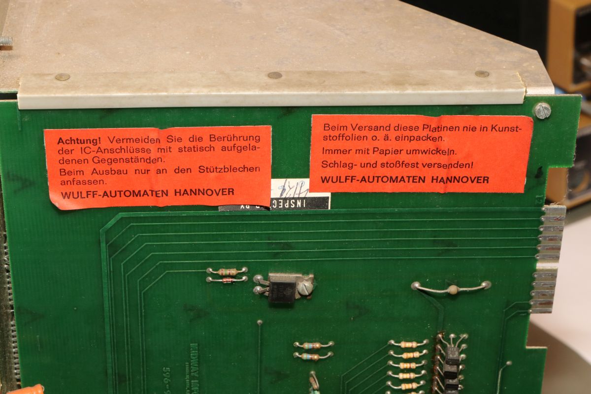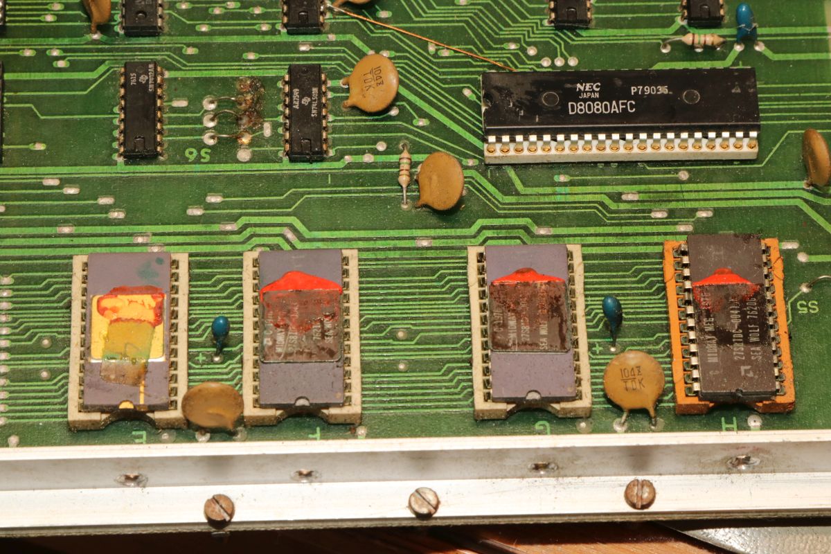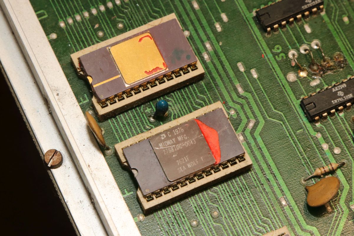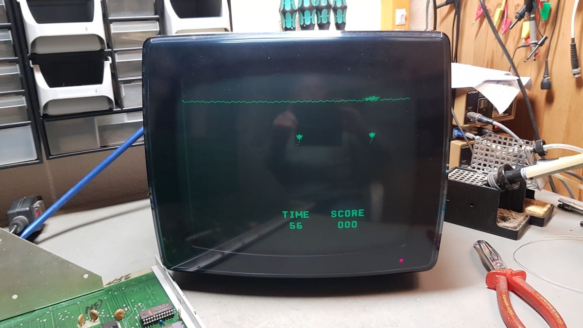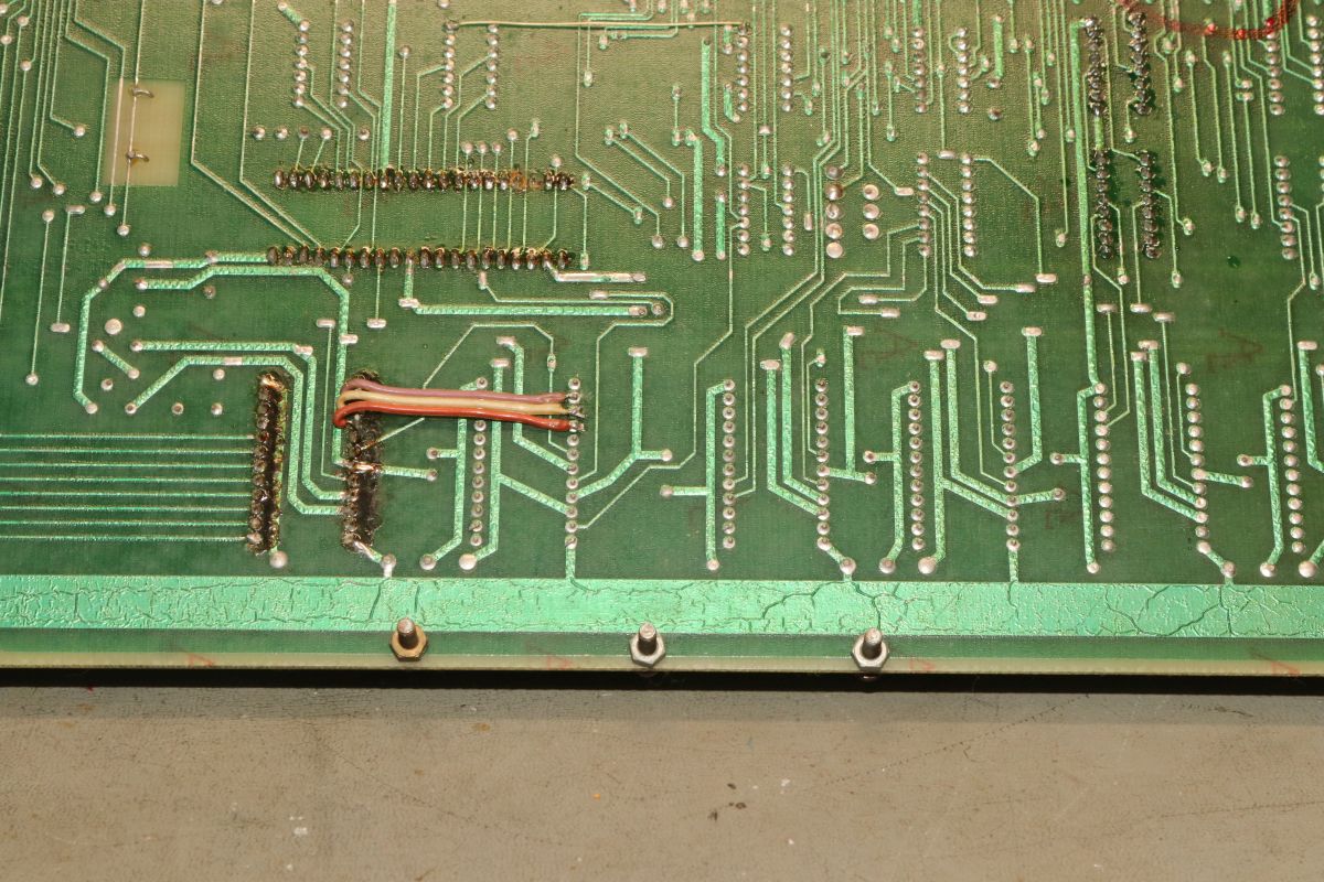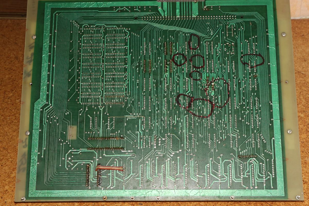 {Midway Sea Wolf} Auf meinem Labortisch landete wieder eine Midway Sea Wolf. Space Invaders Hardware und eigene Zusatzplatine mit I/O und diskreten Schieberegistern auf der senkrechten Platine. Ein vollständiger Test ist ohne Automat kaum möglich, aber hier startet das Spiel schon mal nicht richtig. Das Programm steckt hier in vier bipolaren PROMs mit je 1kx8. Weil die Dinger gut heiß werden, hat sich mal jemand sinnvolle Gedanken zur Kühlung gemacht. Außerdem halten die Teile so ganz gut in den Sockeln Der Programm- und Bildschirmspeicher steckt in Intel 2107 - 4k x 1 dynamische RAMs. Der Rechenknecht: Intel 8080. Auf der senkrechten Platine sind auch noch Logikbereiche untergebracht, die man nicht vegessen sollte. Einerseits wird hier die I/O abgevespert, andererseits geschieht hier auch einiges zum Bildaufbau: für die bewegten Sprites residieren hier vier 4-Bit-Schieberegister vom Typ 25S10. 1975 gefertigt und 1978 schon repariert... Egal... die Garantie ist eh abgelaufen. Vor 47 Jahren... Es sieht aus, als ob die PCB eine Fehlfertigung war, bei der man Kurzschlüsse beseitigt hat... Und auch sonst ist da schon ganz schön herumgebraten worden... Das ist das minimale Setup für die Stromversorgung. Hinzu kommen noch der FBAS-Anschluss und die Reset-Leitung. Ohne händischen Reset tut sich erst mal nichts, der muss nämlich von außen herangeführt werden und ist High-Aktiv! Hey... da läuft ja was... Sieht gut aus, wenige Sekunden lang, dann stürzt das Programm ab. Reproduzierbar! Die Steckverbinder geputzt - hilft aber nichts. Kurzfristig kommt dann mal ein Sprite mit senkrechten Fehlern. Aber auch das hält nicht lange. Die 4-Bit Bustreiber 8216 sind suspekt - gut, dass ich sowas in meinen Schatzkisten auf Lager habe... Die alten Bausteine raus... Sie sind eigentlich hübsch, aber kaputt. Die neuen Bausteine rein - jetzt sehen die Signale ordentlich aus, das Spiel läuft aber trotzdem nicht. Der Multiplexer war mit in den Abgrund gezogen worden. Sauber ersetzt: Und schon läuft das Spiel langfristig und ohne Absturz: Die Sprites sind streifig und das ganze Konstrukt ist extrem stoßempfindlich. Nächster Schritt: PROMs sockeln. 27S81 - diese PROMs sind echt selten. Auf der Platine kann man auch 2708 und ähnliche EPROMs einsetzen, das wird dann über Drahtbrücken gejumpert. Die Schraubkonstruktion mit einem Platinenstückchen dazwischen diente wohl eher der mechanischen Stabilität. Einige Komponenten auf der Platine heizen gut, das ist aber bei den alten 8080-Systemen normal. Auch die neuen NEC Bustreiber heizen... ... die schnellen Zählerbausteine sowieso. Die Programm-ROMs halten sich in Grenzen. Die Sockel haben ihre besten Zeiten lange hinter sich. An einem der ROMs ist schon rumgebraten worden, das geht besser. Raus mit dem alten Mist! Gut reinigen... Vor allem auf der Unterseite! Und dann kommen die guten gedrehten Sockel rein. O.K., das war's jetzt nicht... Da hat doch tatsächlich eine Durchkontaktierung aufgegeben. Wir haben ein stabiles Bild mit Fehlern, aber dafür völlig ohne Wackelkontakte. Die Fehler sind nur bei den Sprites und diese werden auf der senkrecht stehenden Tochterplatine über Schieberegister bearbeitet, weil der 8080 das pixelweise Verschieben in der Zeit nicht hinbekommen würde... Die Schieberegister laufen, aber die Flipflops davor sind teilweise defekt (74175). Schon viel besser: Da war noch eines... Endlich haben wir ein fehlerfreies Bild! Auch das Coinen und das Abschießen der Torpedos funktioniert (wenn man 12V an den Pin für VLED anlegt - die extra-Versorgung für die Optokoppler...). Reparaturen an der I/O-Platine: Reparaturen auf der Hauptplatine: |