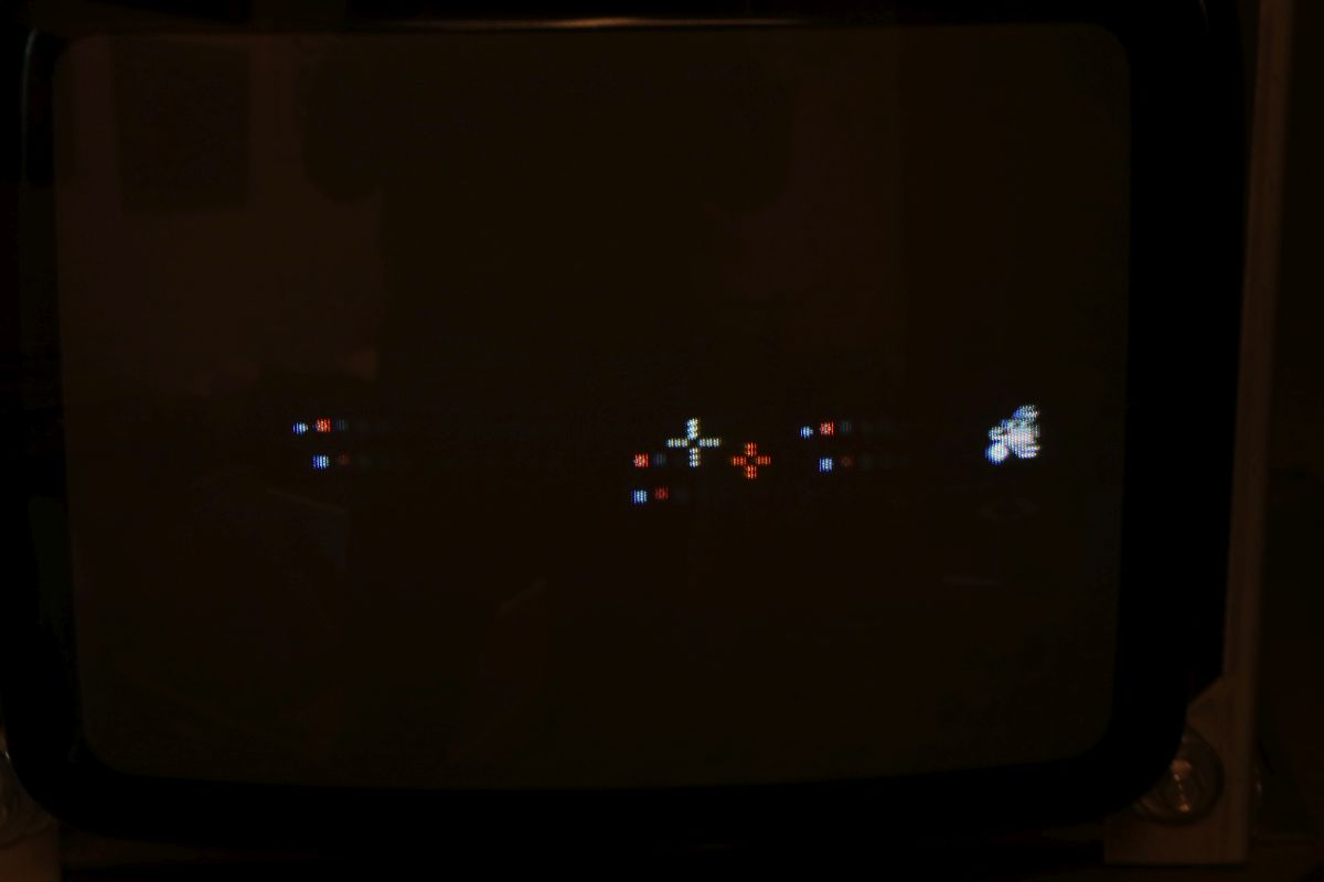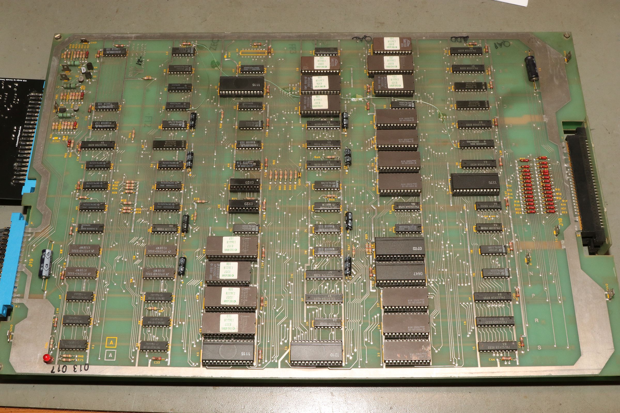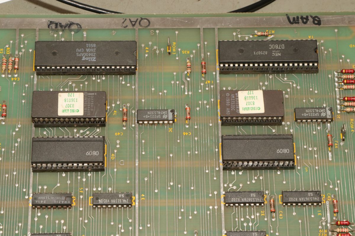 {Atari Xevious} Noch eine seltene und zickige Platine: die originale Xevious von Atari. Drei Z80 prügeln sich parallel um den Datenbus, Background, Motion (Sprites) und Sound. Und als ob das noch nicht genug wäre - ein Sack voll Customs steuert den Spaß dann auch noch. Immerhin gibt es einen guten Schaltplan. Hier erst mal die Grafiksektion ohne CPUs in ihrer hochauflösenden Pracht: Das Spiel startet und läuft... Es möchte uns aber nicht an der Pracht des Hintergrundes teilhaben lassen. Die CPUs laufen alle drei irgendwie... manche nur sehr gelangweilt in Endlosschleife. Das könnte an diesen Korrosionsspuren liegen. Oder daran, dass sich die Prüfsummen der ausgelesenen Programm-ROMs nicht zuordnen lassen... Die neu gebrannten EPROMs machen das nicht besser - mit ihnen startet nicht mal das Spiel richtig. Ich bin gespannt, ob sich der Fehler finden lässt... |