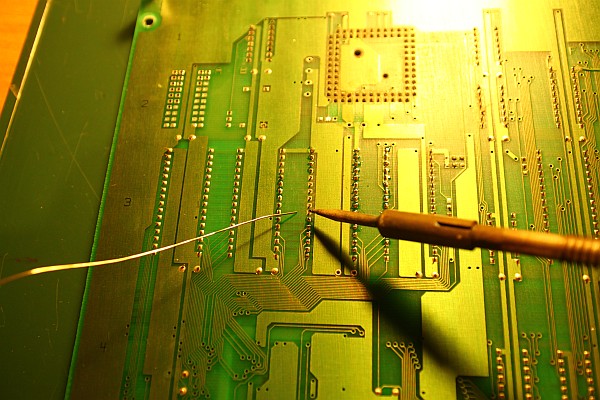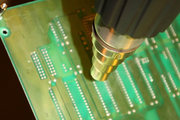 {Auslöten von ICs und Fassungen} Oft muss man auf alten Arcade-Platinen Bausteine mit vielen bis sehr vielen Beinchen wechseln. Das führt bei unsachgemäßer Handhabung schnell zu irreparablem Elektroschrott! Das ist vermeidbar, wenn man mit ein wenig Übung die Heißluftfönmethode anwendet. Hier wird das Bauteil schonend im Stück ausgelötet und gleichzeitig werden alle Durchkontaktierungen sauber von Lötzinnresten befreit, so dass man ein neues Bauelement oder einen Sockel ohne großen Aufwand einlöten kann. Als Werkzeug benötigt man eine Zange oder Pinzette, um sich nicht die Finger zu verbrennen und natürlich einen guten geregelten Heißluftfön (80 Euro). Ungeregelte Supermarktföns bringen es nicht. Überhitztes Epoxy delaminiert und stinkt grausam --> Elektroschrott!