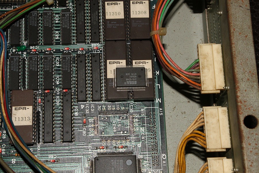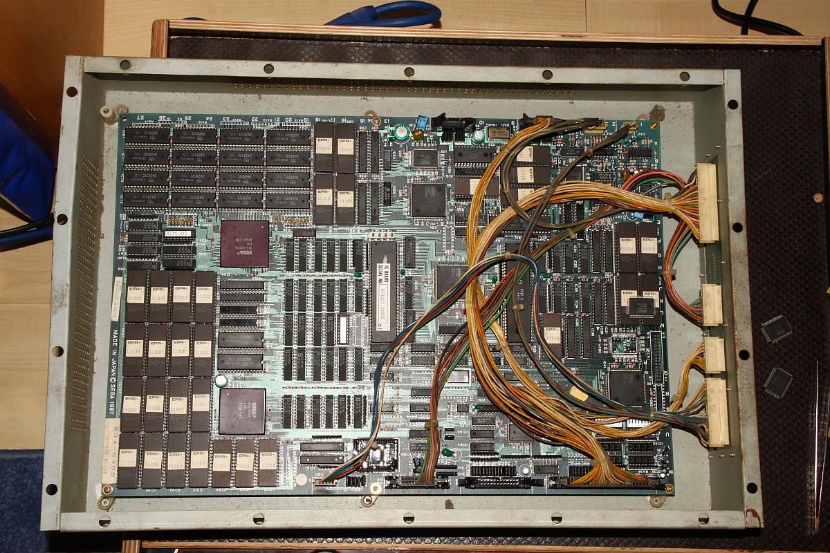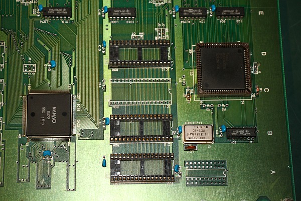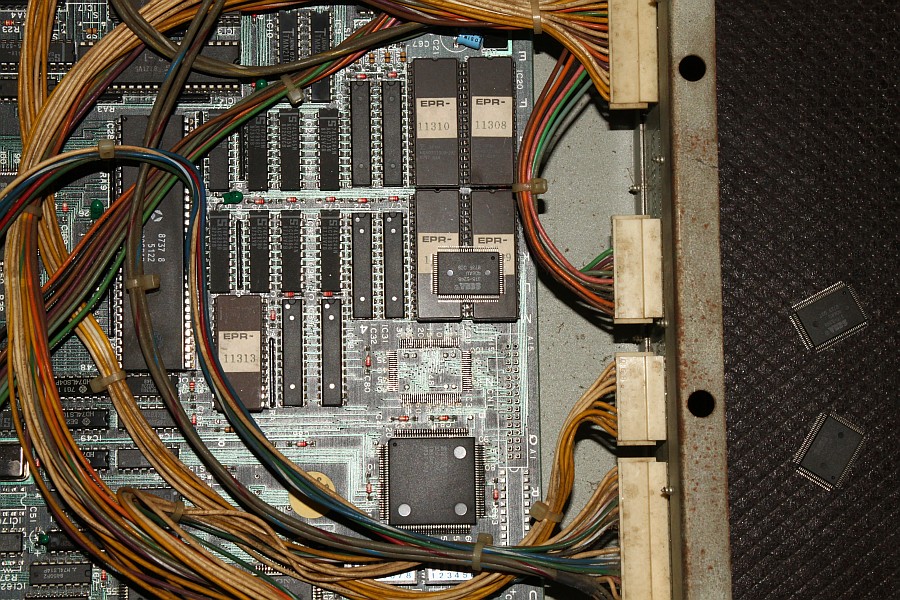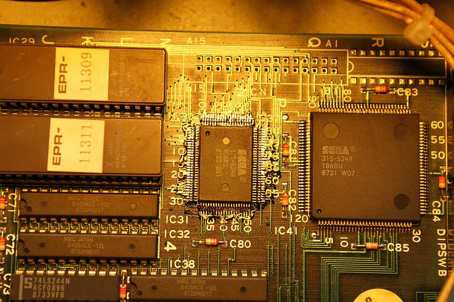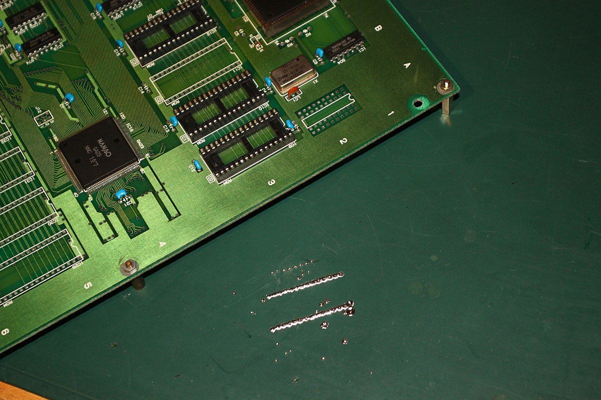 {SMD ICs} Natürlich kann man dies Auslötmethode auch auf SMD-ICs anwenden. Erwärmt wird wie gewohnt, allerdings muss man hierbei sicher gehen, dass wirklich alle Lötstellen schon flüssig sind, weil man sonst die feinen Beinchen verbiegt. Das lose Bauelement wird vorsichtig mit einer Pinzette von der Leiterplatte abgehoben und kann normalerweise danach wieder verwendet werden. Die folgenden Beispiele zeigen den Austausch eines Custom-Chips bei Sega Thunder Blade. Leider war die Platine hinterher immer noch nicht funktionsfähig, aber wenigstens haben wir es versucht... :-( |