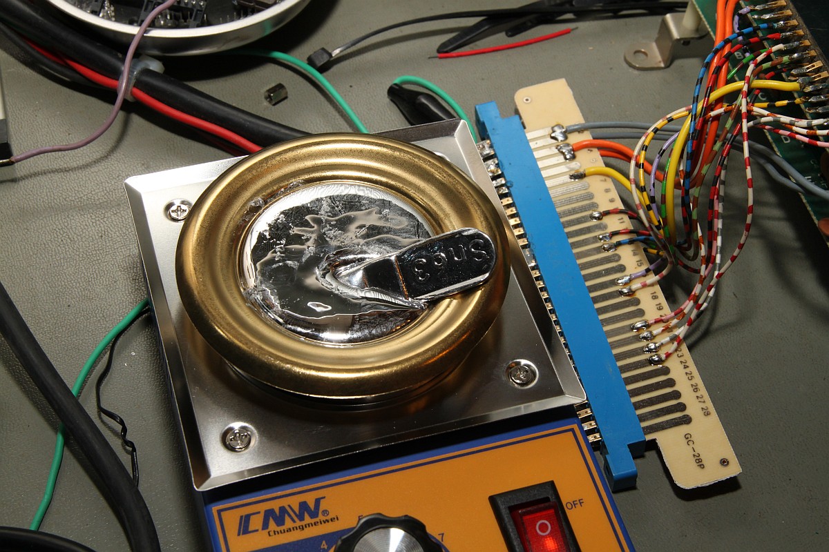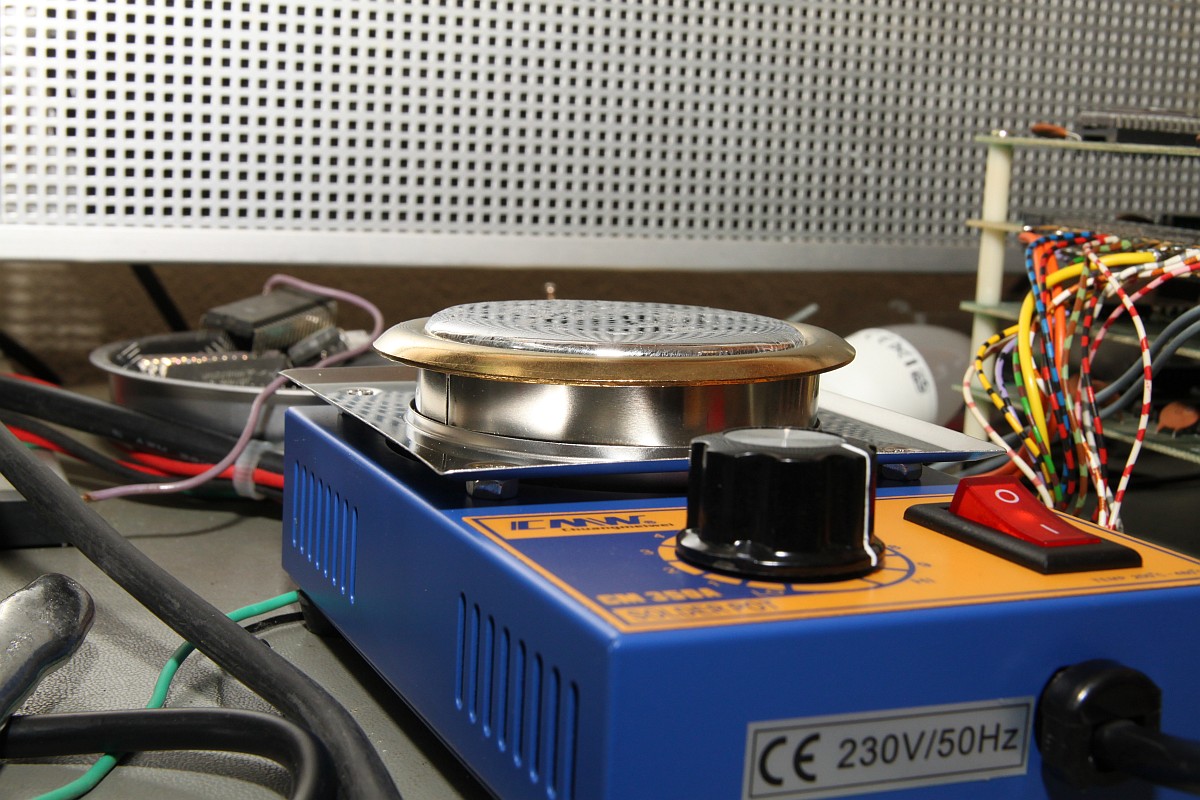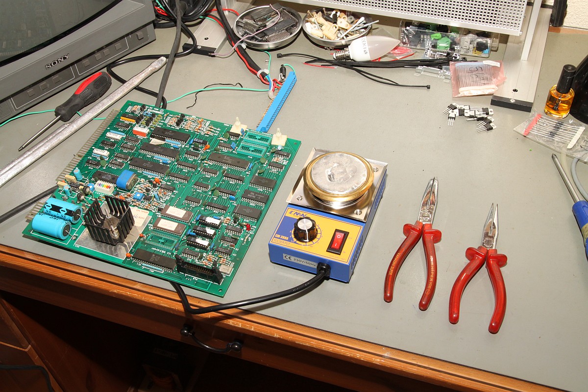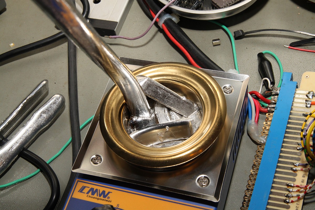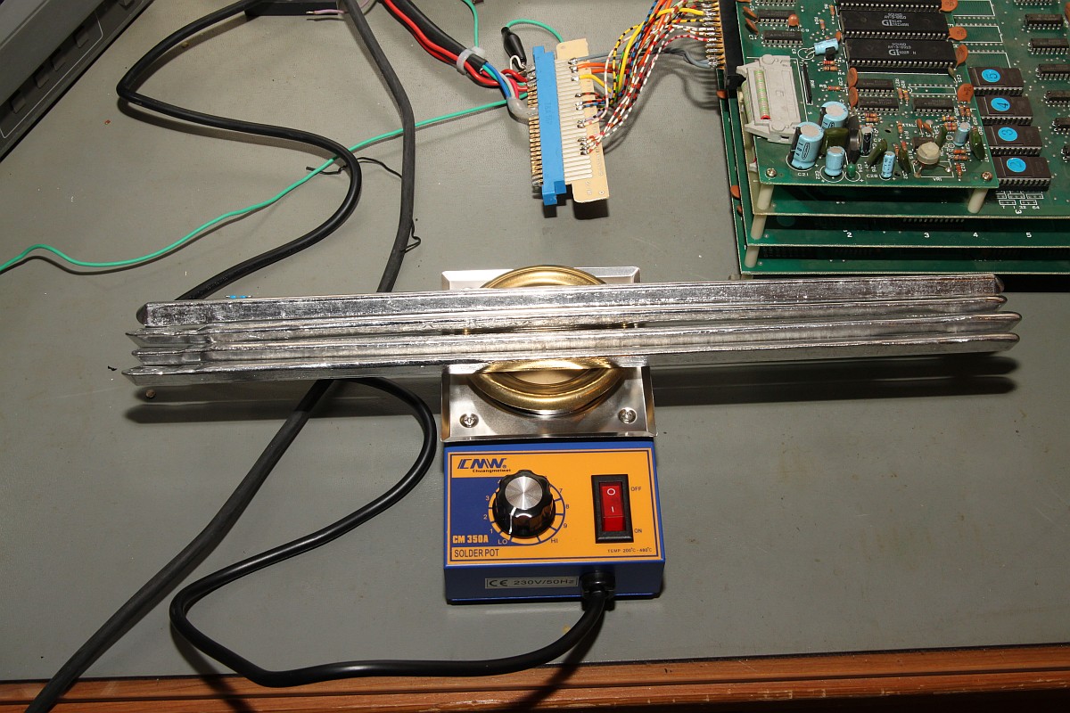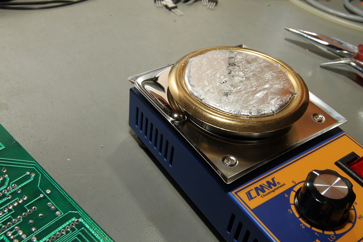 Fazit: sehr gut geeignet für ICs bis DIL32, DIL40 ist schwer, weil man kaum alle Pins richtig erreicht. Die Leistungsregelung muss man ausprobieren, sonst delaminiert sich die Platine schnell - dafür bleiben die ICs handwarm - das ist der deutliche Vorteil zur Heißluftfönmethode. Die Aufheizzeit beträgt 10 Minuten - abkühlen dauert dann schon mal eine Stunde... Und der Umgang mit flüssigem Zinn ist nicht annähernd so kritisch, wie man befürchten könnte. Hier spritzt nichts und wenn was überläuft, ist es schnell fest. Besonders gut entlötet man mit dieser Methode Bausteine mit großer Wärmekapazität - Verstärker und TO3 Transistoren... Draufhalten, rausziehen, fertig. Delamination lässt sich vermeiden, wenn man die Leistung runterregelt. Leider gibt es hier keine Temperaturregelung. Es geht definitiv zerstörungsfrei. Ein Nachteil sind eher die Zinnreste auf der Unterseite... Es schwappt nichts. Das Teil ist mit Zinn gefüllt irre schwer und steht sehr stabil. Die Unterlage muss natürlich feuerfest sein. Das Aufheizen dauert 10 Minuten, das ist überschaubar. Audio-AMPs werde ich in Zukunft immer mit dieser Methode auslöten, bei DIL40 ist der Fön besser. Nebenbei kann man Billigsockel mit dieser Technik so fix auslöten, dass die Sockel hinterher nicht im geringsten verzogen sind - sehr schonend, wenn man es richtig macht.