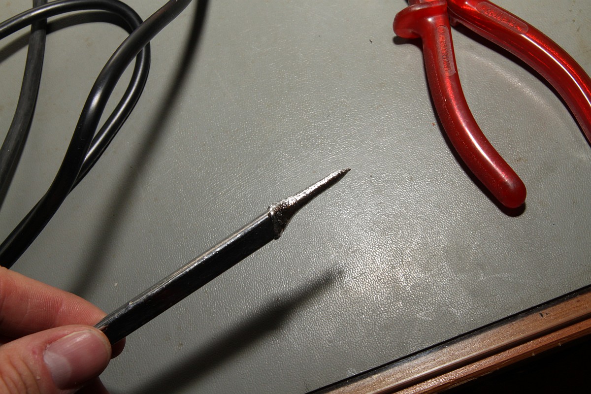 Die Unterseite bleibt relativ sauber. Wenn man sie mit Flussmittel einstreicht und noch mal ins Zinn hält, sieht sie fast aus wie neu. (Also nicht so, wie hier...)