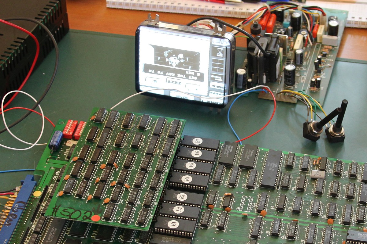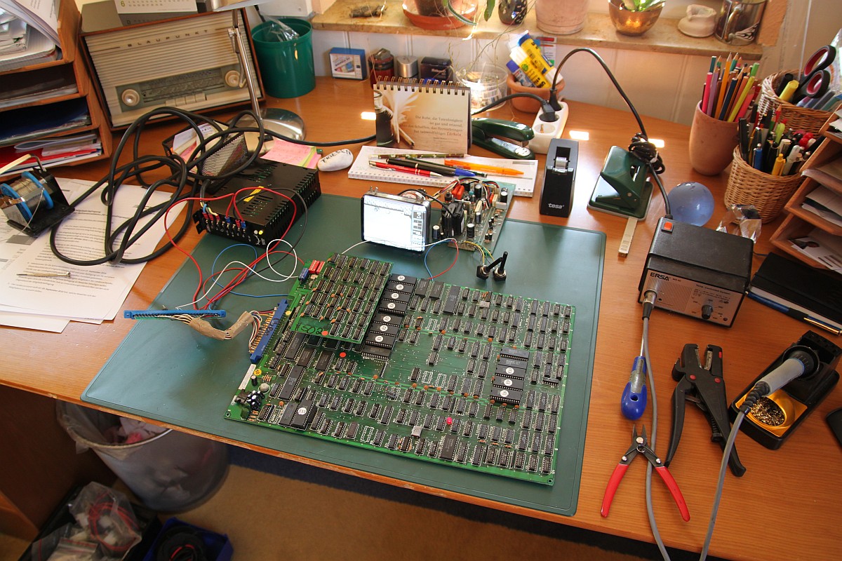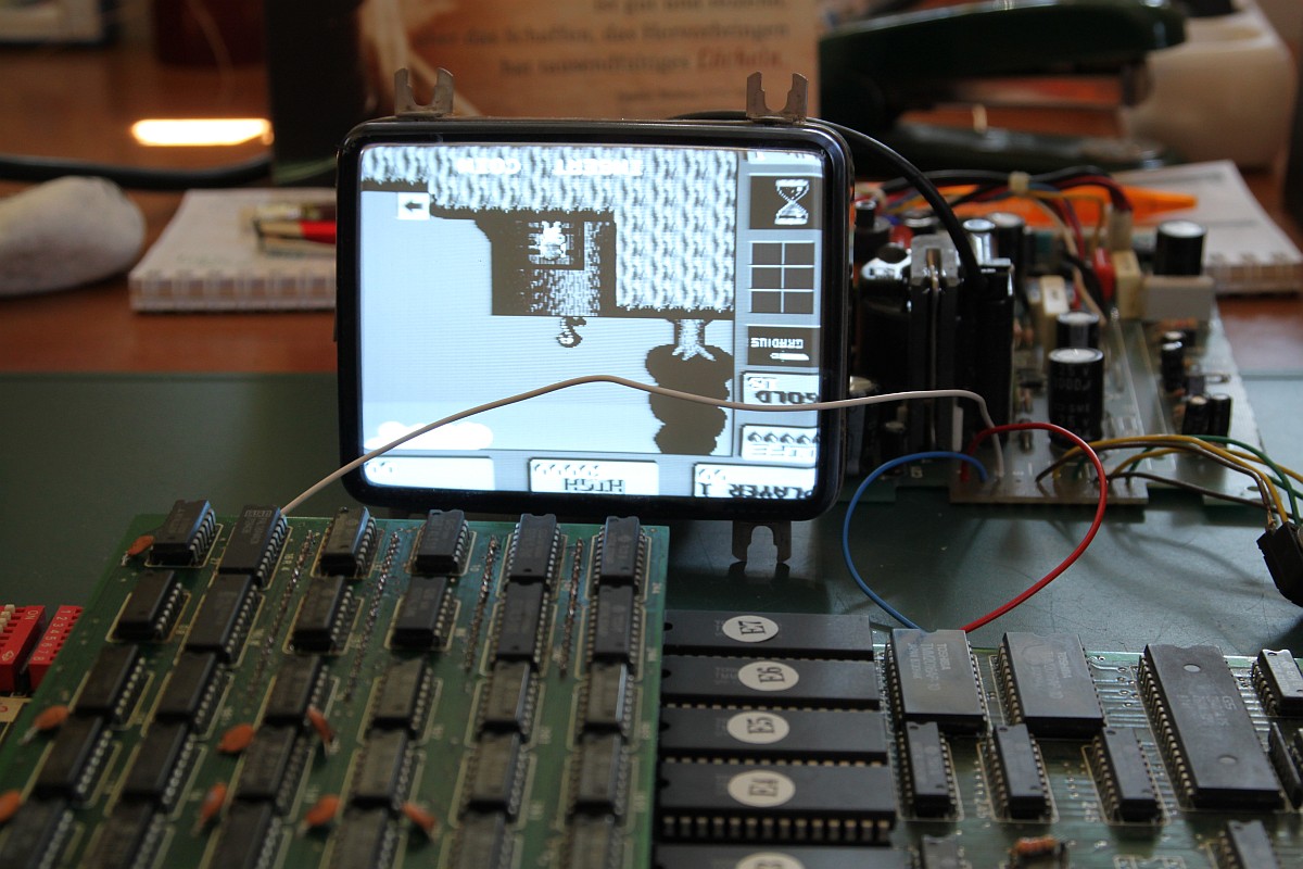 Nicht, dass ich jetzt an sowas spielen möchte, aber zur Kontrolle, ob ein Bild kommt und die Sprites was taugen ist er allemal gut. Und an alle Klugscheißer: ja, ich bemerkte, dass der Monitor auf dem Kopf steht... Und ich habe noch ein Farbmonitorchassis ähnlicher Größe im Keller...