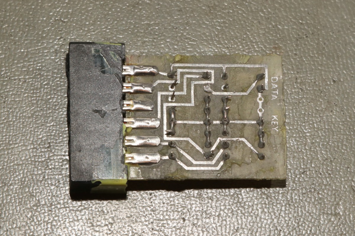{CBM Programmschutz-Dongle} Im Beifang zum CBM-Konvolut fand ich einen Programmschutzdongle für den Cassetten-Port. Diese Teile wurden damals wie heute dafür verwendet, dass man Programme nicht als Raubkopie verwenden konnte. Ohne Dongle lief nichts. Heute benutzt man ausgeklügelte Crypto-Routinen, aber was war in den 80ern drin? Da ich das Programm nicht besitze und der Dongle auch keine Beschriftung mehr aufweist, will ich doch einfach mal Zerobrain-mäßig nachsehen. Wo ist meine Beisszange? Okay, die Beisszange kommt später. Zuerst wird das Kunststoffgehäuse mit viel wohldosierter Wärme gefügig gemacht: Zuerst ziert es sich noch.... ... aber es geht rückstandslos ab. Toll. Komplett vergossen. Aber auch hier helfen 200°C und Geduld. Das Harz wird weich und krümelig, den Rest besorgen Beisszange und Schraubenzieher. Und von Unten - interessant: nicht alle Pins der unkenntlich gemachten ICs sind verlötet. Was da wohl dahinter steckt? Heute habe ich mal keine Geduld: auf den Chips stehen oft interessante Infos als Klartext, aber dazu muss man erst mal an diese gelangen. Der Heißluftfön hilft auch hier. Und die Beisszange. Der erste Chip geht mittels Fön und Uhrmacherschraubenzieher nur beschädigt raus, der zweite fällt mir perfekt erhalten entgegen. Ich lese etwas von 157 und 165. 165 passt gut - ein 8-Bit Schieberegister 74LS165. Was anderes passt auch nicht an die wenigen Steuersignale und Eingänge des Cassettenports. Der Rest vom zweiten Chip sieht aber auch nicht wie ein 74LS157 (Quad-Multiplexer) aus... Meine Reverse-Engineering-Skizze ist widersprüchlich... {710er Deckel? Die Lösung!} Schlaue Leute in schlauen Foren (VzEkC e. V.) schmunzeln. Da war doch dieser uralte Blondinenwitz mit dem 710er Deckel in der KFZ-Werkstatt, der sich beim Umdrehen als OIL-Deckel entpuppte. Alter Falter - ich hätte nicht gedacht, dass mir das passiert. Da macht doch das Schaltbild auf Anhieb einen richtig guten Eindruck: ein 16-Bit-Schieberegister mit hartverdrahtetem Bitmuster (Eingang nicht verbunden: "1"). |