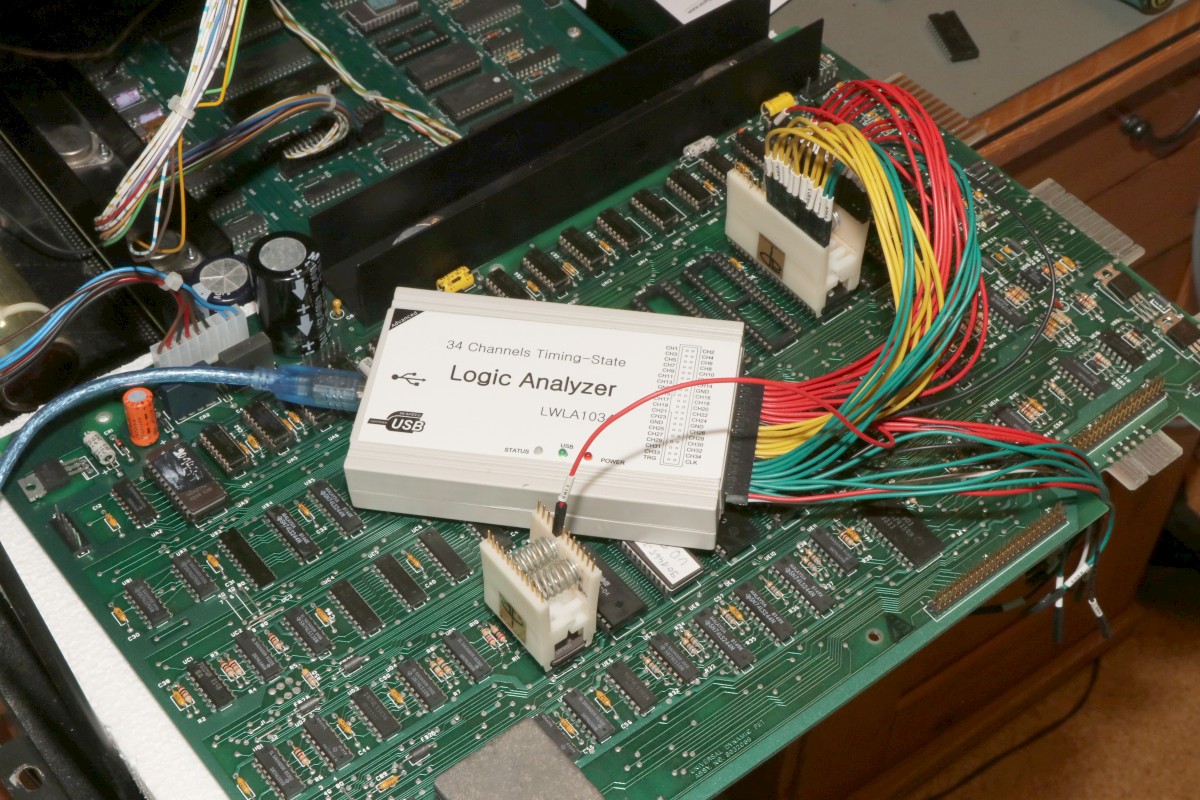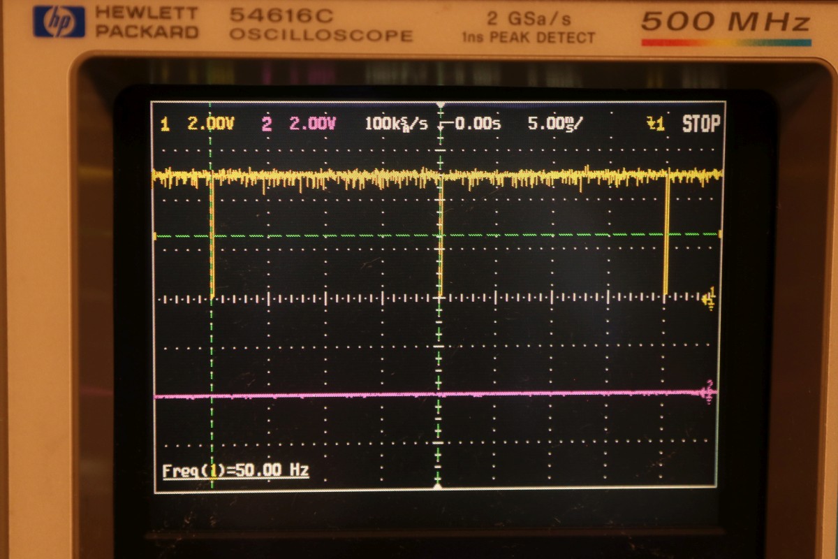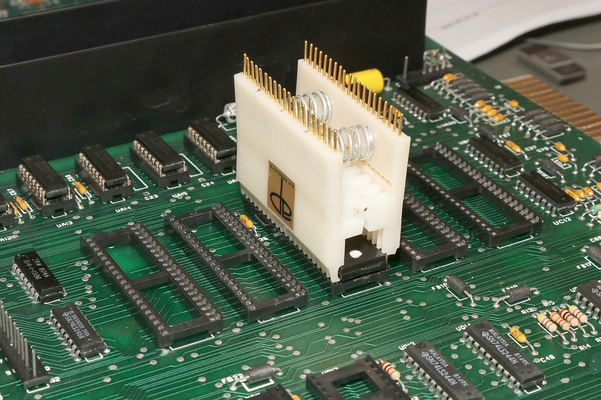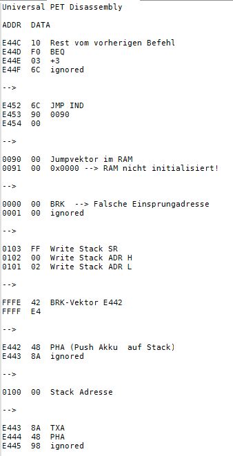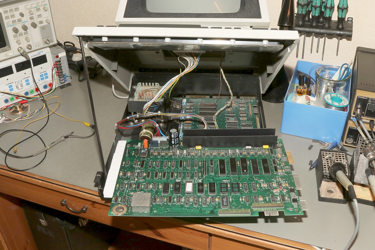 {Universal PET Motherboard} Mich erreichte eine Reparaturanfrage aus dem Altcomputerforum: ein Universal-PET-Motherboard. Die Diagnose des Besitzers wies auf sterbende 4116 hin, es ging immer weniger, am Ende ging garnichts mehr. Allerdings hatte das Teil auch bereits ersetzte defekte ROMs und einen defekten CRTC zu verzeichnen. Seltsam... Mein 8096 zeigte sich sofort bereit, als Netzteilverleiher zu fungieren. Die Diagnose wurde bestätigt. Es geht fast nix mehr auf diesem Board. Reset geht nach 1s brav auf High. Der IRQ von den Schnittstellenbausteinen ist dauernd low - nicht gut, aber den Programmablauf sollte das nicht blockieren. Trotzdem startet die CPU nur sporadisch. Der Datenbus ist nicht wirklich gut - ich teste die Datenausgänge der dynamischen RAMs... Zwei der bereits getauschten RAMs sind defekt - schlechte Idee, die defekten Teile wieder in den Sockel zu stecken. Mit "neuen" RAMs sehen die Datenpegel wieder gut aus. Bit 0 und 1 sind auch platt - ich tausche gleich beide Bänke, man kann die ja eingelötet schlecht auseinanderhalten, die Datenleitungen liegen parallel. Die Leiterplatte ist von sehr guter Qualität, Auslöten mit Entlötpistole und moderater Heißluftfönunterstützung geht prima! Neue RAMs beruhigen den Datenbus - das Programm läuft trotzdem nicht richtig an. Nur als Beispiel: so muss das IRQ#-Signal an der CPU aussehen, wenn alles gut läuft. Bei der Fehlersuche fällt mir auf, dass die ROMs nicht wirklich angesprochen werden. Es kommt kein Chip Select. Der Decoderbaustein 74154 ist völlig tot. Nach Austausch kommt endlich ein sauberes Chip Select - die CPU versucht von ROM 0xFxxx zu starten - hier liegen die Sprungvektoren für Reset , Break und Interrupt. Trotzdem: kein zuverlässiger Programmstart, keine Initialisierung. Immerhin läuft schon mal irgendwas zyklisch. Manchmal bricht es nach wenigen ms ab - manchmal bleibt das Programm in einem stabilen Zustand... Ich tausche konsequent alle RAMs in Bank 0. Das hilft auch nicht, aber mir fällt auf, dass es auf dem Datenbus nicht mit rechten Dingen zugeht! Deutlich zu sehen beim Zugriff auf ROM 0xFxxx: der Datenbus ist nicht das gesamte CS# (oberes Signal) stabil! In den letzten 500ns zwingt offensichtlich ein weiterer Busteilnehmer den Datenbus auf einen Zwischenpegel. AM ROM ligen in diesem Zeitbereich keine Pegelwechsel an. Dieser 500ns-Zeitslot wird nur vom DRAM genutzt - aber auch nicht, wenn CS# aktiv ist... Die Schnittstellenbausteine bekommen derzeit eh keine CS# Signale und müssten stillgelegt sein. Ansonsten liegen am ungebufferten Datenbus nur die ROMs, die DRAMs und zwei Bustreiber. Der Tausch eines der Bustreiber bringt keinerlei Änderung. Die DRAMs können auch nicht der Verursacher sein - wenn ich das Pärchen auf Bit 0 entferne, ändert sich nichts am Verhalten. Als letzte Möglichkeit entferne ich alle Schnittstellenbausteine. Das war sehr aufwändig - aber leider erfolglos. Der Fehler ist immer noch da. Ich fange langsam an, an meinen Fähigkeiten zu zweifeln... {Fortsetzung:} Weiter im Text: ein komplettes Abkoppeln des buffered databus hat nichts gebracht. Der Datenbus wird weiter zeitweilig doppelt verwendet. Also kann es nur was mit der CPU und dem ROM zu tun haben. Die CPU versucht auf das ROM zu schreiben. Also Fehler im Programmablauf - vermutlich schreibt die CPU Sprungadressen in das RAM und springt dann in die Prärie... Ich entferne alles Unnötige: ...und schreibe ein aufwändiges Testprogramm direkt am Hex-Editor. Die Sprungvektoren darf man natürlich auch nicht vergessen: Das Ganze in ein TMS2532 gebrannt: Und schon kann man in aller Ruhe das Verhalten der Schaltung bewundern: In diesem Fall ist Gelb das Chip select von ROM Fxxx und Lila ein Chip Select von ROM Bxxx (der vierte LDA Befehl) Die 10µS Pause oben sind der Rücksprung auf Adresse F000. Das Programm wird erweitert: Zugriffe auf die komplette I/O, den Video-RAM (hätte ich schreiben und nicht lesen sollen - so hat's keinen Effekt...) und wichtig einmal Schreiben und Lesen im DRAM. Die Chip Selects am CRTC 0xE880: Und am DRAM: Schreiben und Lesen einer logischen "1" auf Adresse 0x0000. Schreiben und Lesen einer logischen "0" auf Adresse 0x0000: Schreiben und Lesen einer logischen "0" auf Adresse 0x0000 ohne weitere Datenbusaktivität zu diesem Zeitpunkt: Jetzt kommt die nächste Eskalationsstufe - nachdem ich per Oszi keinen Hardwarefehler finden konnte: Testclips. 34-Bit Logikanalysator. Und die dazu gehörige Analysesoftware. Zuerst mein Testprogramm: alle Aktionen finden sich im Datensalat wieder. Ebenso die DRAM Schreib- und Lesezugriffe und der Rücksprung in der Programmschleife. CPU, Daten- und Adressbus und die ROMs arbeiten einwandfrei. Jetzt prüfe ich das Verhalten mit den Original-ROMs. Mein Verdacht bestätigt sich: die CPU versucht auf 0xE452 einen indirekt adressierten Sprung. Der Vektor steht im DRAM auf den Adressen 0x0090 und 0x0091. Dort stehen aber nur Nullen drin. Somit springt die CPU auf Adresse 0x0000 und findet dort den Befehl 0x00 - also BRK. Offensichtlich hat die Initialisierung der Sprungvektoren im RAM nicht geklappt - entweder sind die RAMs defekt (unwahrscheinlich, weil neu), das Schreiben in dem Adressbereich klappt nicht (Adressbus-Buffer defekt) oder die RAMs vergessen Daten (Refresh-Logik defekt). Weitere Erkenntnisse werde ich nur mit einem verbesserten Testprogramm erhalten! |