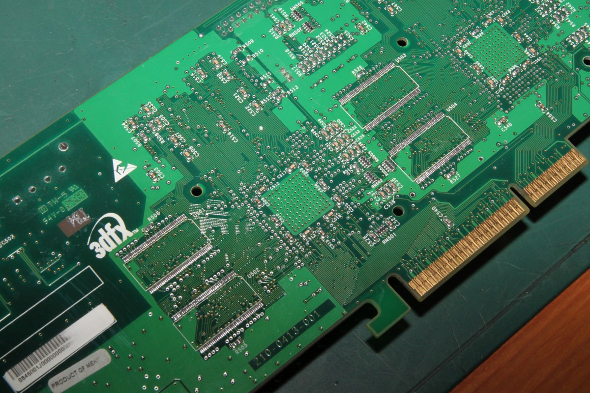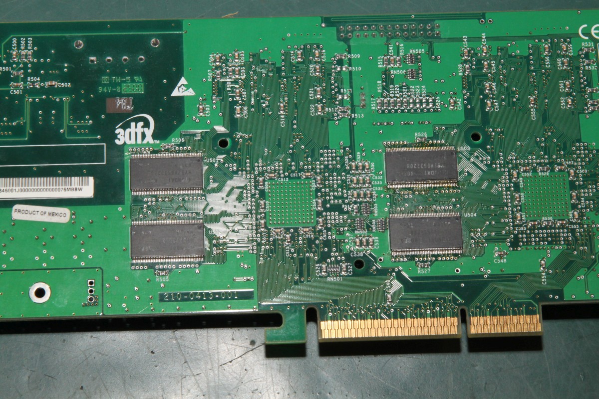 {3DFX Voodoo 5 Fehlerbild} Heute gibt es mal eine Tat, die mich an die Grenzen meiner Nerven (und meines stetig schlechter werdenden Sehvermögens) gebracht hat. Hier hat nur noch meine Werkstattlupe (die mit der runden Leuchtstoffröhre und dem 2kg Glasbrocken in der Mitte) weiter geholfen. Der Kunde lieferte folgendes Fehlerbild: