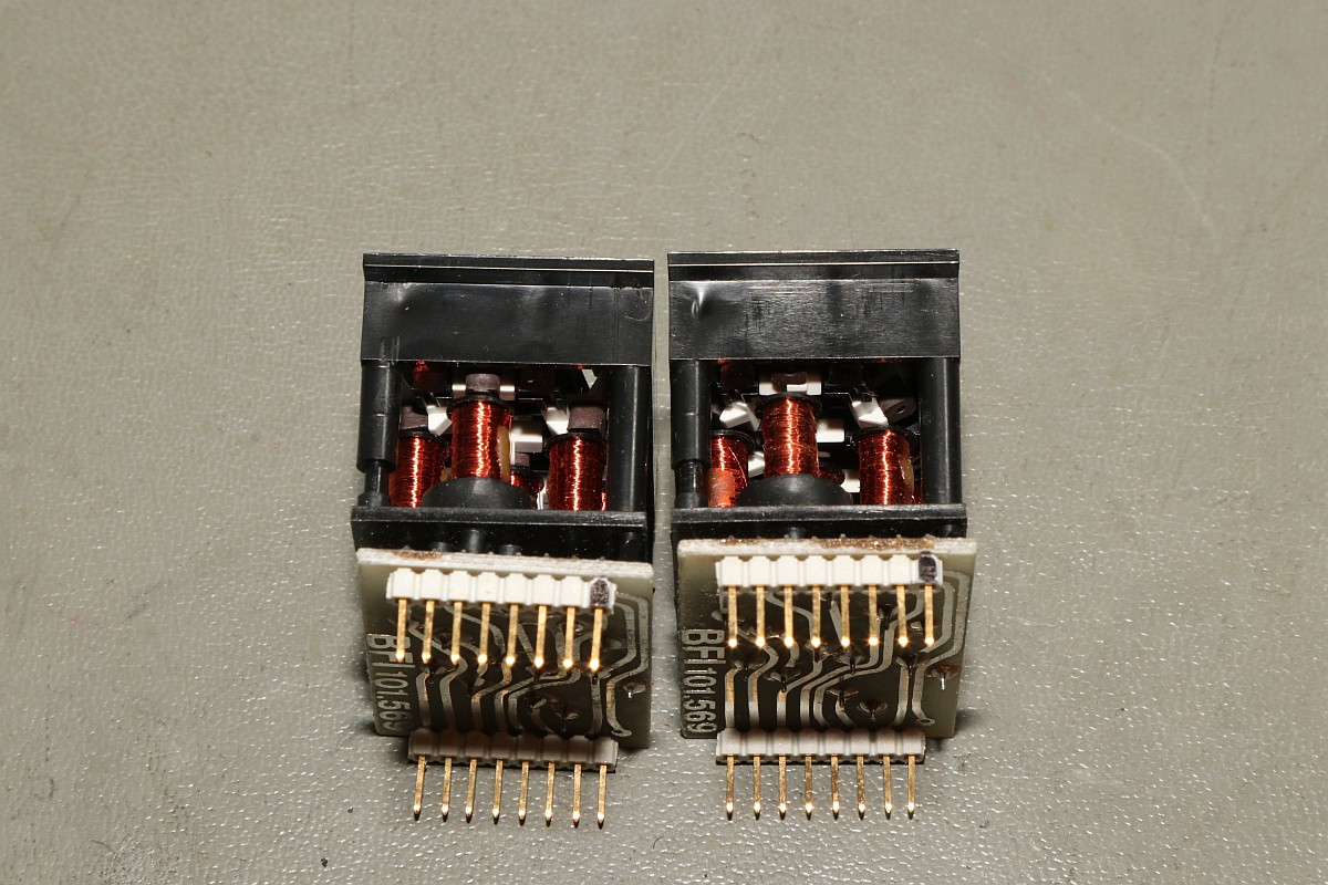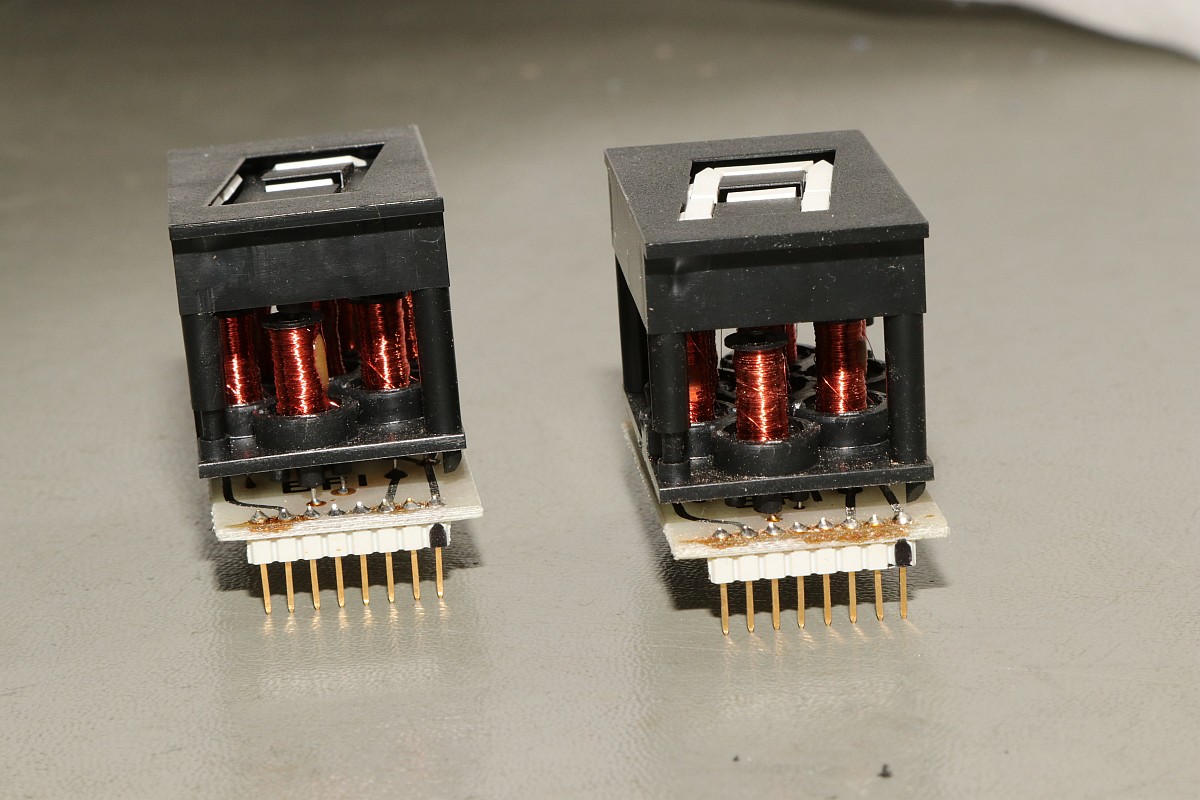 {Klappdeckel Anzeigen} sind faszinierend. Es gibt sie als Matrix-Displays oder auch als 7-Segment-Anzeigen. Die Matrix-Displays findet man gerne auf den Linienbussen zur Anzeige des Fahrtziels. 7-Segment-Anzeigen dieser Bauart waren gerne in Zapfsäulen verbaut. Der Vorteil dieser Technik: sie ist nicht umgebungslichtempfindlich, im Gegenteil: je mehr Licht auf die Anzeige scheint, desto besser lesbar wird sie, sie leuchtet ja nicht selbst, sondern besteht aus lackierten Plättchen. Das Funktionsprinzip: bewegliche Plättchen mit einem kleinen Permanentmagneten - die Plättchen auf der einen Seite hell und auf der anderen Seite dunkel gefärbt - werden uber einen Elektromagneten in eine von zwei möglichen Lagen gebracht. Der Elektromagnet hat einen magnetisierbaren Eisenkern, der nach Anlegen eines kurzen (ca. 1ms) Impulses seine Magnetisierungsrichtung behält. Je nach angelegter Polarität wird das Plättchen dann dauerhaft angezogen oder abgestoßen, auch wenn der Strom durch den Elektromagneten nicht mehr fließt. Links: angezogen - rechts: abgestoßen... Da muss doch was Interessantes draus zu basteln sein... |