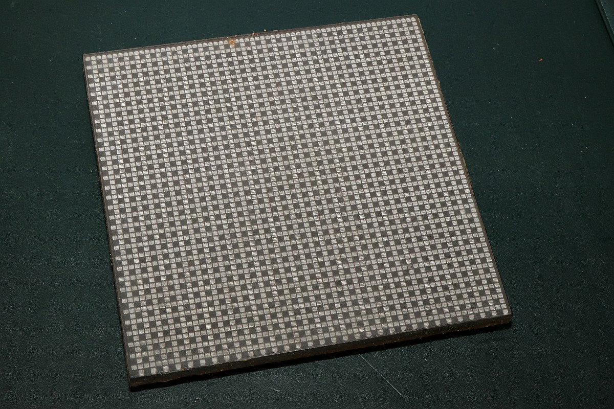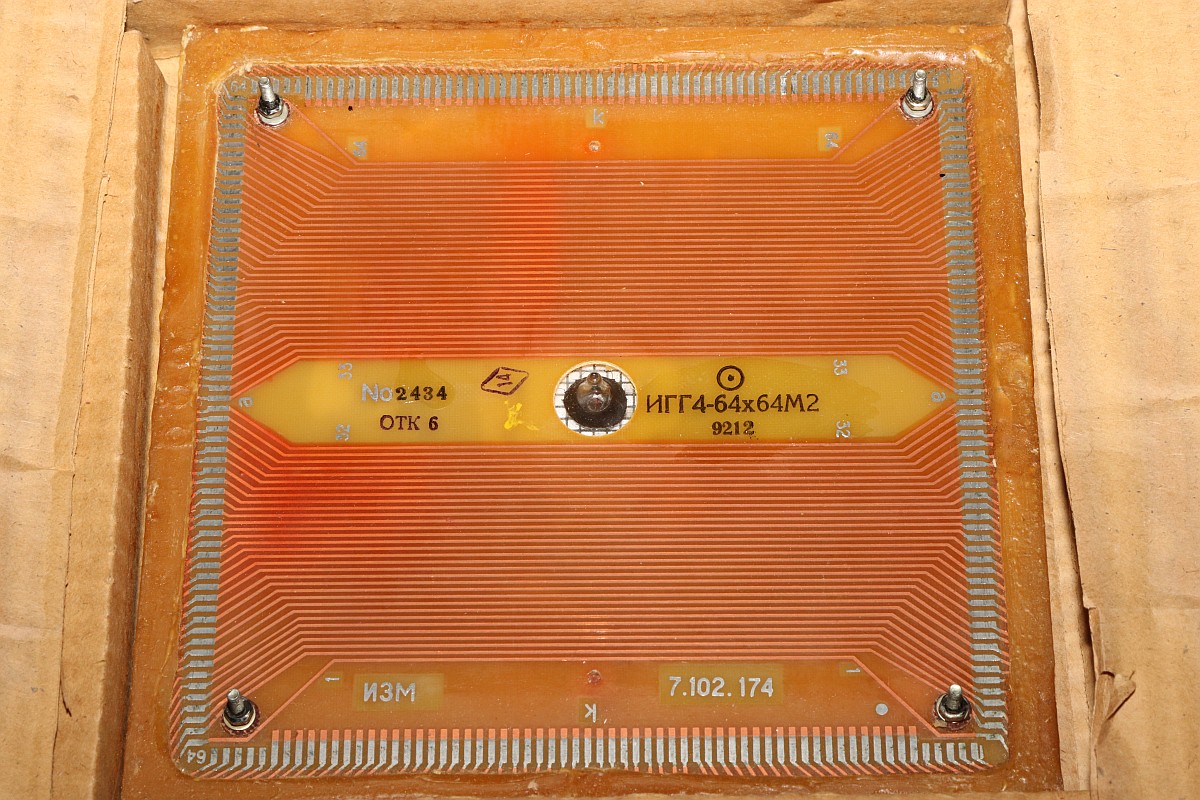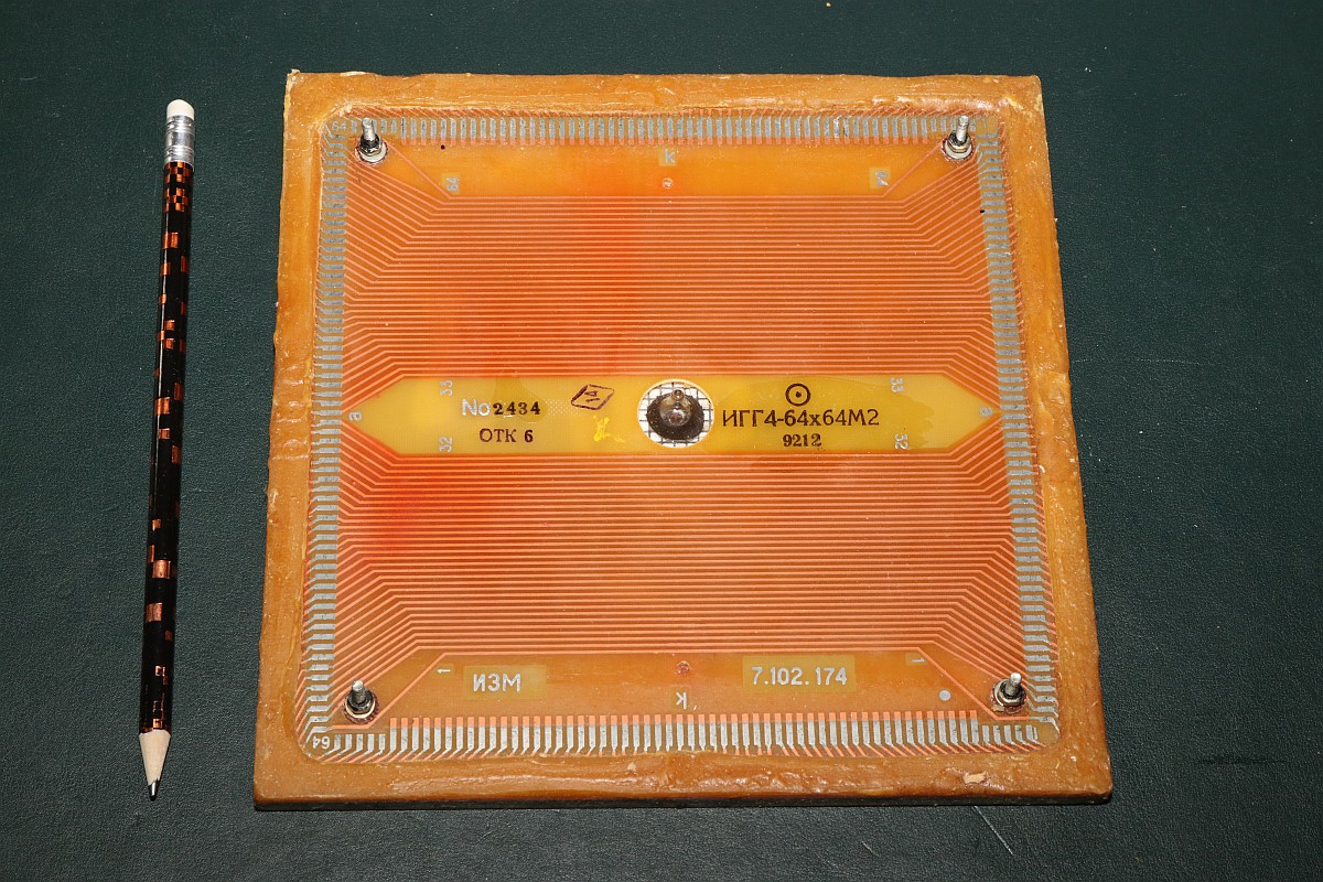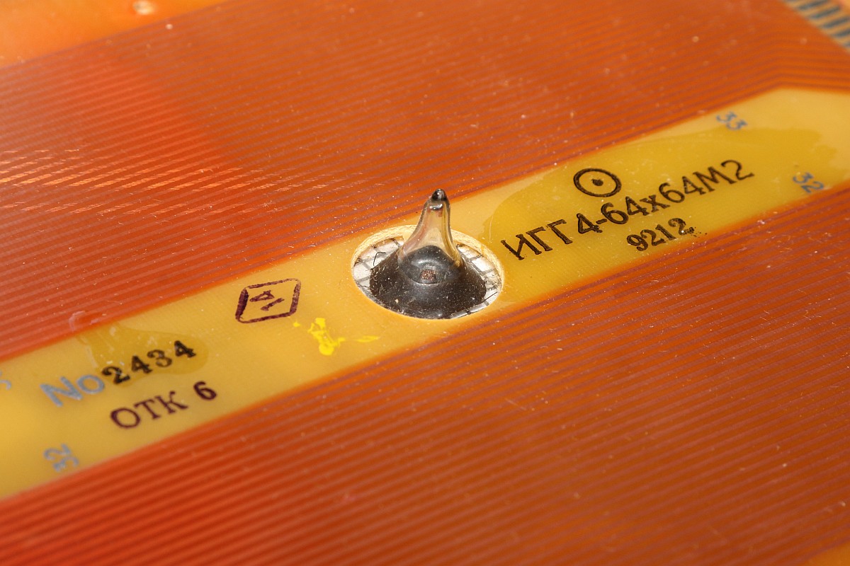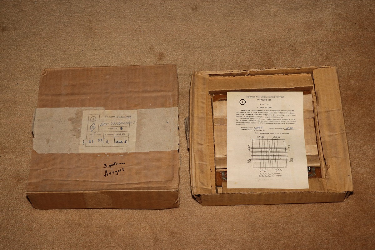 {IGG4-64x64M2 VFD-Nixie} Ist es ein VFD? Ist es eine Nixie-Röhre? Es ist offensichtlich ein Hybride aus beiden Welten: leuchtender Phosphor aus der VFD-Welt und heizungslose Gasentladung von den Nixies. Die Russen haben schon seltsame technische Produkte gezaubert. Sowas musste ich unbedingt besitzen: NOS - New Old Stock... gut, die Pappe liegt schon eine Weile. Die Displaykachel präsentiert sich gut verpackt und mit eigenem Datenblatt - handausgefüllt! Auf der Unterseite: die Anschlüsse. 64 Anoden und 64 Kathoden, so angeordnet, dass man viele Kacheln für eine Videoleinwand abstandslos nebeneinander montieren kann. Die Variante M2 besitzt ein Pixelarray mit drei Farben - Rot, Grün und Blau. Es gibt auch Varianten mit RGB plus Weiß oder nur Grün und Orange oder auch welche mit nur 32x32 Pixeln... Funktionieren tun sie alle gleich. Der Rand ist mit einem wachsartigen Zeug abgedichtet... Die Kanten dürften recht empfindlich sein. Besser nicht runterfallen lassen! Der Aufbau ist mir ein Rätsel: vermutlich ist es so ähnlich wie eine Nixie-Röhre mit einer Phosphorschicht in der Nähe der Gasentladung... man sieht hier die eine gitterförmige Elektrode und darunter in Weiß die Leuchtschicht. Es gibt keine Heizung und kein Steuergitter. Zündspannung ist angeblich 300V... Der dunkle Bereich ist ohne Leuchtschicht. Eigentlich ist das Verschwendung - da hätte man auch noch eine Farbe doppelt anbringen können, ohne Mehraufwand... Nur mal so zum Größenvergleich. Russisch ist selten klein. Hier füllt man Vakuum nach, wenn's mal alle ist: Das beigefügte Datenblatt "Passport" habe ich gleich mal sauber eingescannt. Warum habe ich da jetzt nur "Das 5. Element" im Sinn? Multipass!!! ;-)