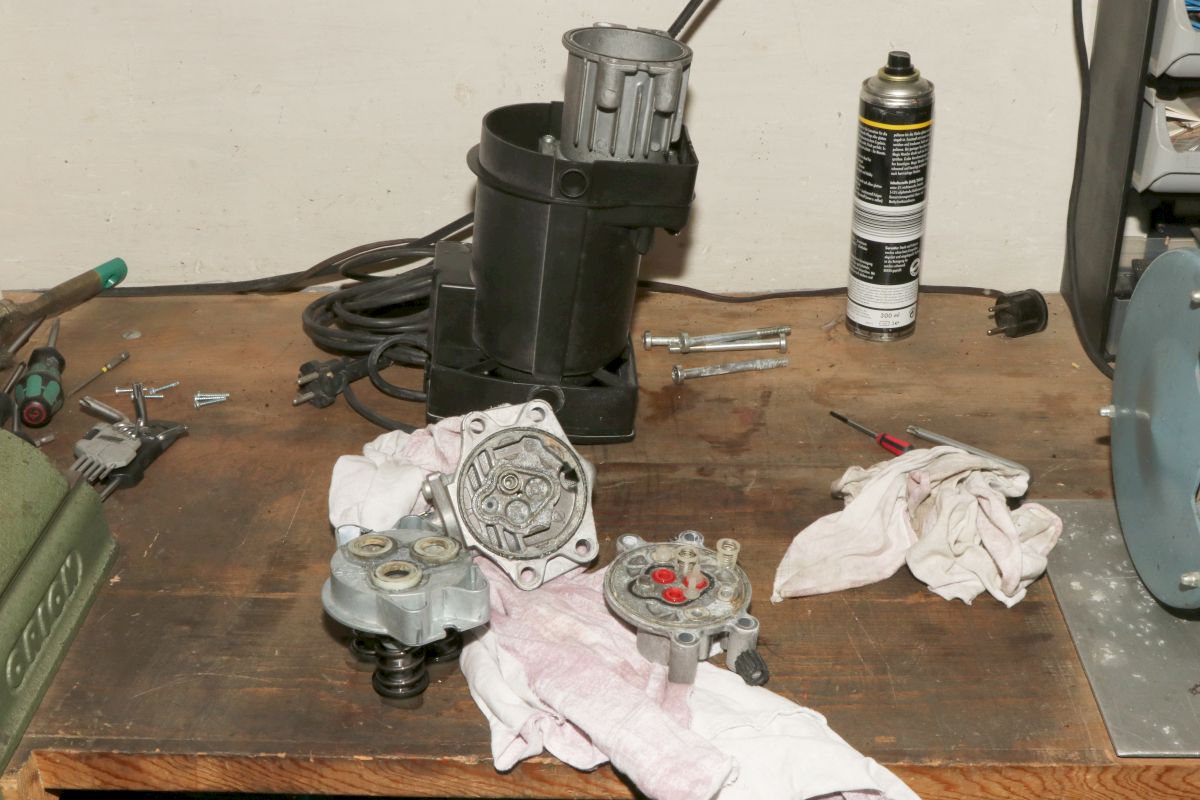 {Kärcher Hochdruckreiniger 410} Manche Defekte merkt man erst, wenn man das Gerät nach Jahren wieder in Betrieb nehmen will: so bei diesem Kärcher Hochdruckreiniger, der trotz problemlos laufendem Motor einfach keinen Druck liefert. Der reine Gartenschlauch bietet mehr Reinigungswirkung... Bevor ich das alte Gerät entsorge, will ich doch mal wissen, ob man da nicht was machen kann. Erste Herausforderung: die Torx-Gehäuseschrauben. Eine davon ist eine Sicherungsschraube mit zusätzlichem Dorn im Schraubenkopf. Das sieht man natürlich nicht. Es hat mich nicht lange aufgehalten... Die Pumpe hingegen lässt sich mustergültig demontieren: 4 fette Torx-Schrauben halten das Aggregat zusammen. Punkt 1: unbedingt aufrecht demontieren, sonst läuft das Motoröl aus und Punkt 2: alle 4 Schrauben gleichmäßig lösen, sonst verkantet das Ganze. Die Ventilplatte ist schon mal beeindruckend korrodiert, sieht aber schlimmer aus, als es ist! Die Kolbenplatte zeigt das Problem: die Kolben sind nicht freigängig. Bei den Ventil-Einzelteilen sollte man sich merken, was wo wie hinkommt. Aber eigentlich ist das nicht sehr kompliziert. Hier die Taumelscheibe, die im Ölbad schwimmt. Die taumelnde Scheibe wird vom Motor angetrieben und drückt die drei Kolbenstößel zyklisch nach vorne. Wenn sie sich denn drücken ließen... Wasserzulauf (oben), Hochdruckabgang (mitte) und Waschmittelzulauf (unten). Sieht aus, wie ein Dreiventiler... Auf Ölbadseite ist alles in Ordnung. Ein Kolben ist freigängig, zwei stecken fest. Da hilft nur die komplette Demontage. Das ist aber ganz einfach, die Kolben sind nur eingesteckt. Die festen Kolben kann man mit einem Treibdorn losbekommen. Ein Teil der Gummidichtung hat sich mit dem Kolben verklebt. Die Reinigung ist mit einer Stahlbürste ganz einfach, die Kolbenstößel sind gehärtet, denen macht das nichts aus. Die Laufbuchsen sind glatt, die Gummidichtungen sehen nicht so gut aus, laufen aber frisch geschmiert einwandfrei. Das Gummifitzelchen der einen Dichtung kann man einfach mal entfernen, damit sich nichts verklemmt. Ich bin gespannt, ob das nachher alles gut läuft. Die Kolben laufen auf jeden Fall wieder satt in den Buchsen. Im schlimmsten Fall dringen geringe Mengen Wasser ins Ölbad ein - das sollte man regelmäßig mal kontrollieren. Gibt es hier eigentlich Ersatzdichtungen? Kolbenplatte und Kunststoffringe geputzt und wieder montiert: Die Ventilplatte vorher... ... und nachher: Diese beiden Teile lassen sich etwas mühsam montieren. Dann vorsichtig aufsetzen, andrücken und die vier Schrauben gleichmäßig festziehen. Der Schalter macht auch Probleme: rastet nicht richtig und ist an einem Kontakt ausgebrochen. Für den ersten Test reicht Kleben. Und nach anfänglichen Schwierigkeiten mit dem Druckaufbau (vermutlich mussten sich die Ventile wieder erst ein wenig einarbeiten) kärchert der Kärcher wieder einwandfrei! Den Garagenvorplatz habe ich damit schon wieder richtig strahlend sauber hinbekommen. Nächster Schritt: den teildefekten Schalter ersetzen - Ersatzteil ist schon bestellt! 30 Euro - Alter!? |