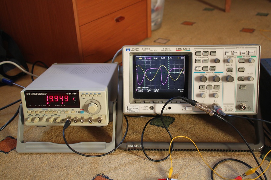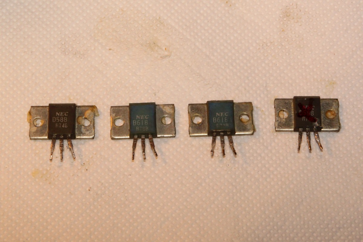 {Diagnose} Da hat sich wohl der Endstufentransistor +40V-seitig verabschiedet: Messaufbau und Spannungsverlauf bei 5kHz und 20kHz: {Reparatur} Zwei Jahre später (was lange währt, wird bekanntlich gut!)- jetzt hab ich mich aufgerafft... am verfärbten Widerstand kann man schon mal erahnen, wo der Fehler ungefähr liegt: Um an die Leistungstransistoren ran zu kommen, muss man erst mal das halbe Gerät auseinanderschrauben. Was für eine unnötige Arbeit... Nur dann kommt man an die Schrauben für die Halteplatte ran: Die Leistungssendstufen - Exoten, die man so gut wie nicht mehr bekommt... Entlötet und getestet... im eingelöteten Zustand kann man die schlecht ausmessen... Basis-Kollektor und Basis-Emitter sollten im Diodentestbereich des Multimeters ca. 500mV ergeben. Ein Originaltransistor kostet ca. 25 Euro. 2SD588 und 2SB618 haben eine extrem exotische Bauform und werden schon lange nicht mehr hergestellt... Internetrecherche gibt's her: 2SD588 = 2SD718 und 2SB618 = 2SB688. Die Bauform ist nicht gleich, aber die Teile werden eh geklemmt und nicht geschraubt. Die Ersatzteile kosten übrigens 1,30 Euro das Stück... Ja, der Pinabstand passt auch nicht. Kann man aber gut hinbiegen! Ich habe übrigens gleich beide Komplementärtransistoren gewechselt. Es war zwar nur einer defekt, aber so ist das Paar sicher symmetrischer, da es ja nicht die originalen Typen sind. Die Glimmerscheiben zur Isolierung passen bei den Ersatztypen perfekt, wenn man sie hochkannt einsetzt: Wärmeleitpaste nicht vergessen: Dranbäppen (schwäbisch für "mit Hilfe der adhäsiven Wirkung der Wärmeleitpaste hilfsweise fixieren"): Festschrauben (die kleinen Wärmeleitpads für die zwei Thermosensoren nicht vergessen!) Und mit einem 10Ohm Lastwiderstand unter Belastung testen: ...den man nach Vollast am Besten nicht mit den blanken Fingern wechseln sollte... Ich Trottel. So sieht eine ordentliche Kurvenform aus: Und dies der Testplatz: |