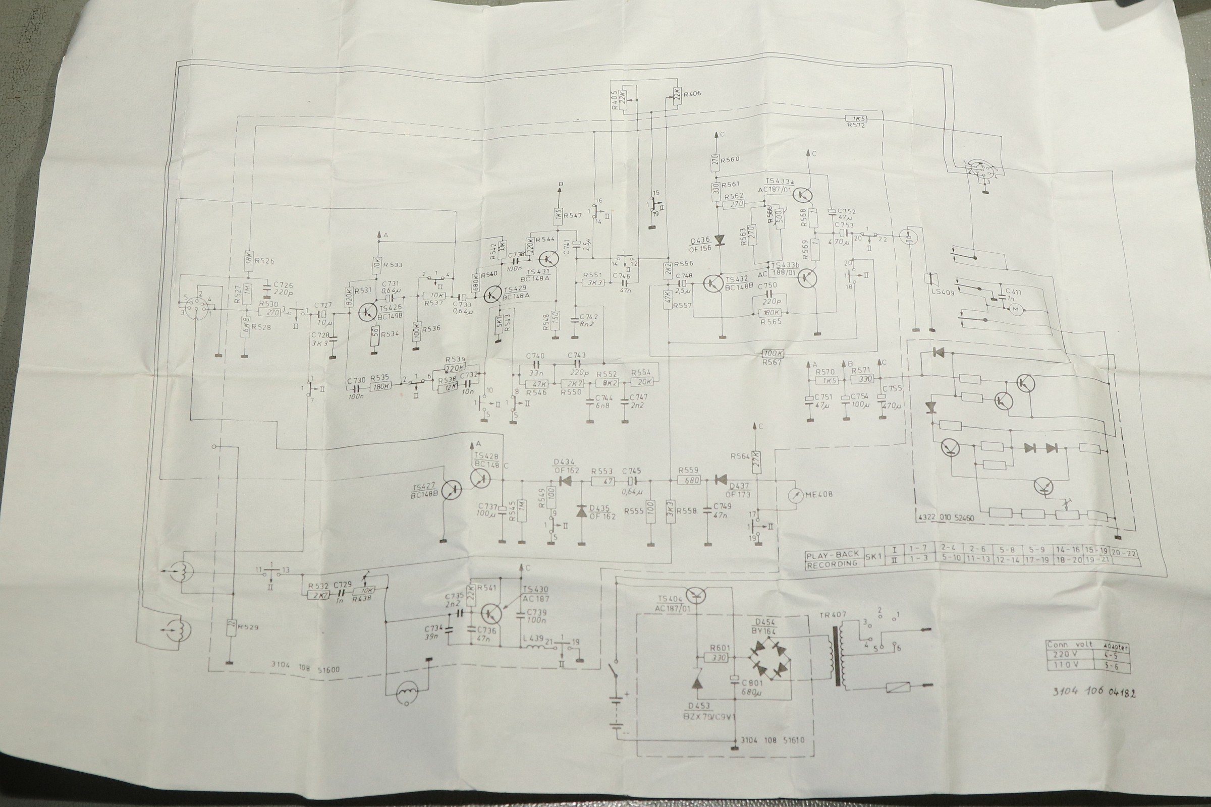 {Philips N2209 Cassette Recorder} Da will man endlich mal seinen KIM-1 mit Software über Cassette füttern und stellt fest, dass das Abspielgerät nicht mehr funktioniert. Die Rollen drehen sich nicht... Es handelt sich um ein schönes, einfaches Monogerät mit gewöhnungsbedürftigem Einhebelsteuerknopf... Die Gehäusehälften sind schnell auseinandergeschraubt - die Ursache der Bewegungslosigkeit ist schnell gefunden: Philips-typisch haben sich mal wieder die Gummiriemen verflüssigt... Da ranzukommen ist eine Kunst für sich... Lecker, sieht aus, wie Lakritze, ist nur deutlich ekliger! Die Überreste haben sich mal wieder überall hin verteilt. Unmengen an Spiritus, Lappen und Ohrstäbchen sind hier von Nöten! Man ist übrigens gut beraten, den Demontageprozess dieser elektromechanischen Presswurst akribisch per Foto festzuhalten, sonst findet man nicht mehr zurück! Die Elektrobucht bietet (perfekt passenden) Ersatz! So sieht es dann aus, wenn es wieder sauber ist. In die ganz feinen Rillen kommt man nicht, ist aber auch nicht so wichtig. Latexhandschuhe helfen übrigens, der Schmodder geht von Metall deutlich besser ab, als von Haut! Die neuen Riemen sind wieder an ihrem Platz! Um an die Oberseite zu gelangen, muss weiter demontiert werden, dazu sollte man auch einzelne Kabelverbindungen ablöten, das macht es deutlich einfacher! Reinigen, schmieren, ölen... das lohnt sich! Nach etwas Gefluche ist das Gerät wieder in der Hülle versenkt... Da steckt doch ein Zettelchen drin... Ahhh... der Schaltplan - immer dabei! Ich hab ihn mal mit sehr großer Auflösung fotografiert... |
