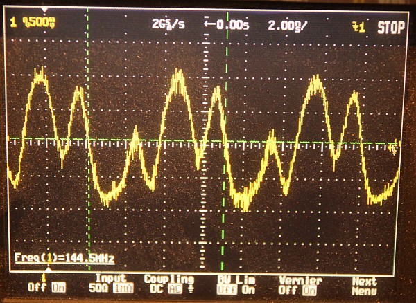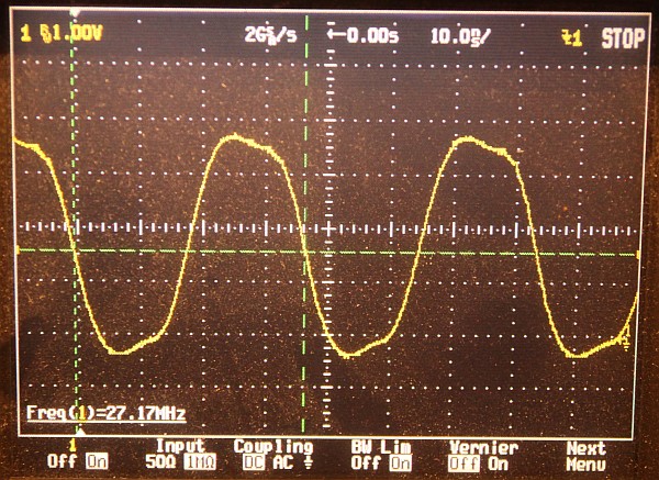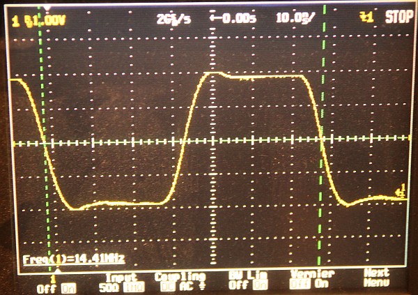 {Pong Taktgenerator} Jedes Arcadeespiel fängt mit einem Systemtakt an. Der Systemtakt des Spiels entspricht in den wenigsten Fällen dem verfügbaren Quarztakt auf einem FPGA-Eval-Board. Daher muss hier erst einmal angepasst werden. Hier mal die professionelle Video-Verkabelung, damit es nachher auch ein gutes Bild gibt: {Schaltplan lesen} das hier ist der Schaltplan des Taktgenerators des PONG-Spiels: Klar, 14,4 MHz haben wir nicht, dafür 27 MHz. Ein PLL wird uns eine Frequenz aus den 27MHz erzeugen, die unseren Wünschen am nächsten kommt. Gut, dass es dafür einen "Wizard" gibt, der das automatisch erzeugt: Probehalber auf einen Ausgang gegeben und oszillografiert kann man das Ergebnis bewundern. Hier das Eingangssignal: Die 144 MHz sehen auf dem Ausgang nicht gut aus, aber die verlassen den FPGA ja auch nicht... DAS ist das gewünschte Ergebnis: saubere 14,4 MHz erzeugt aus 27 MHz: |