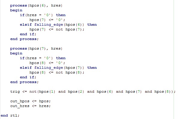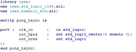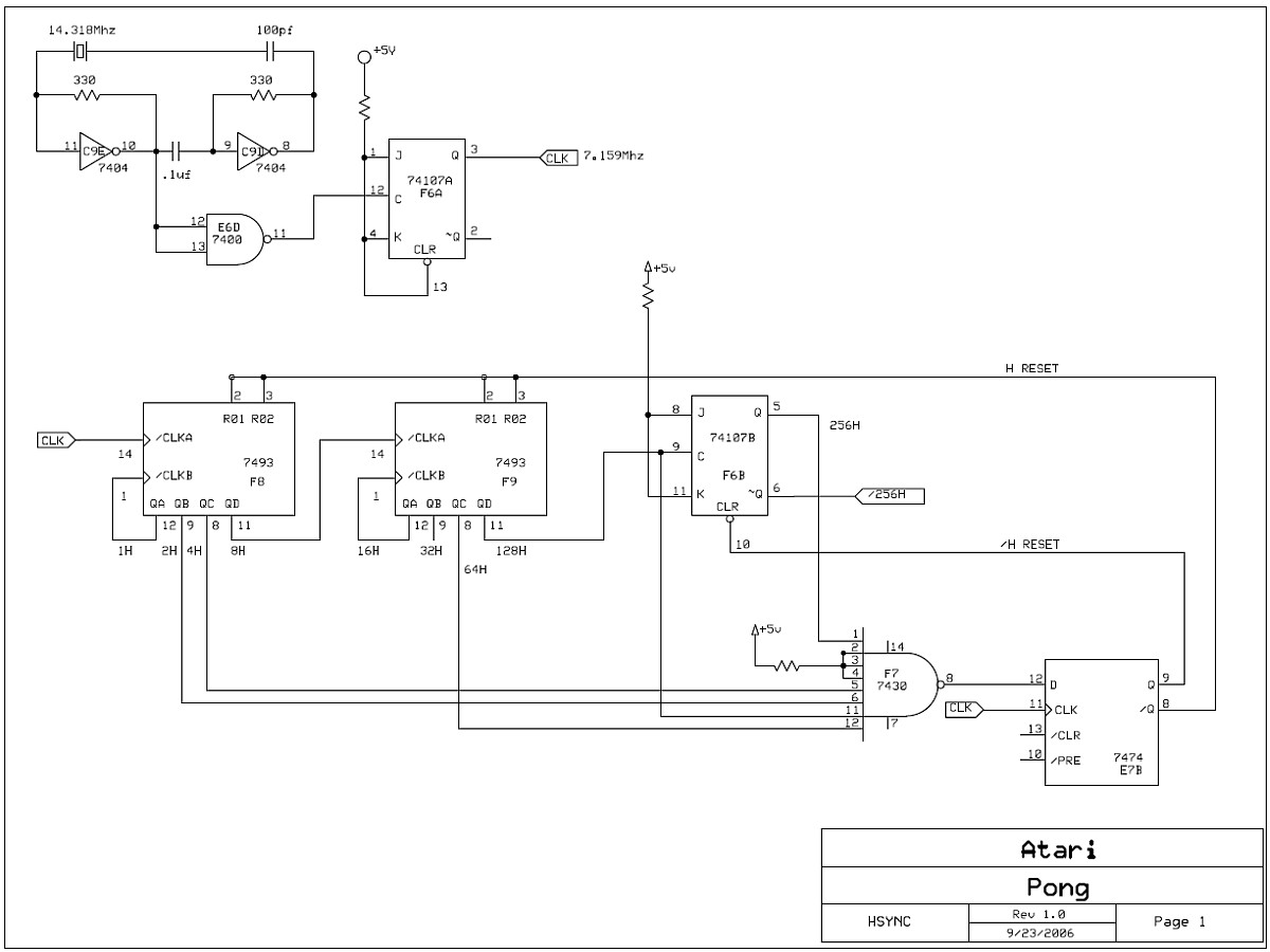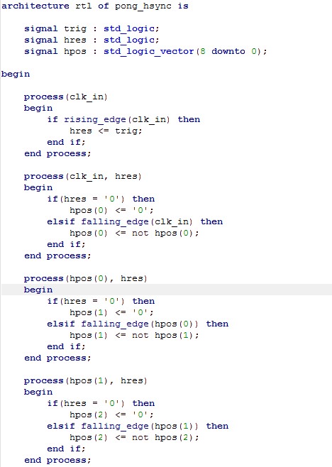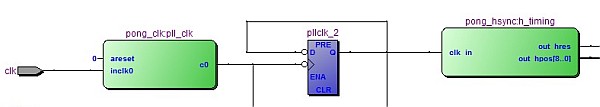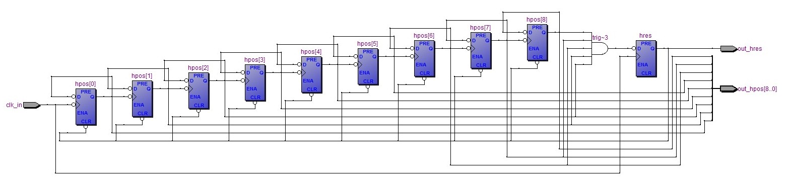 {Pong Horizontalsynchronisation} Jedes Arcadespiel benötigt ein gutes Video-Timing, damit daraus ein Monitorbild aufgebaut werden kann. Der erste Schritt hierbei ist die Horizontalsynchronisation. Sie definiert die Lage der Pixel auf der Bildzeile und generiert den Horizontalen Synchronimpuls (15 kHz). Wir fangen wieder mit dem Schaltplan an: {VHDL-Code} In VHDL wird erst einmal beschrieben, was in das Modul an Signalen hinein geht und was herauskommen soll - die sogenannte Entity: Dann werden Signale (sic!) und Prozesse (Signalabhängige Abläufe) beschrieben. Am Ende gibt es noch nebenläufige Zuweisungen, also digitale Signaloperationen, die immer stattfinden. Im Gegensatz zu einer Programmiersprache für Microcontroller findet im FPGA alles gleichzeitig statt. Das ist zu Beginn etwas gewöhnungsbedüftig. ... (einige Stufen ausgelassen) ... Wenn das dann compiliert wird, dann macht der Compiler den gewünschten Block daraus: Man sieht oben noch den Taktgeneratorblock und das einsame Toggle-FF zur Teilung durch 2 - und hier das, was im Hsync-Block genau drin ist: Wenn man das Ergebnis mit dem originalen Schaltplan vergleicht, kann man jedes einzelne Gatter und die Flip-Flops wiederfinden, die hier in VHDL beschrieben wurden. Der FPGA wird an dieser Stelle alles genau so machen, wie es die Originalhardware auch macht (nur mit viel schnelleren Flanken, aber dazu später...). |