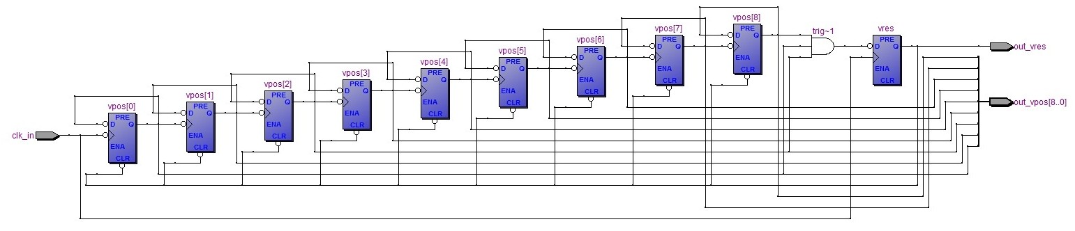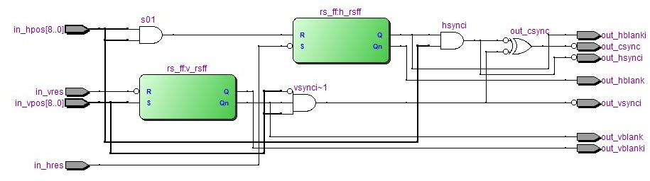 {Vertikal-Synchronisation} Der Vertikalzähler-Teil unterscheidet sich nur geringfügig vom H-Sync-Aufbau, gleiche Zähler, ein wenig andere Logik, es sind ja auch eine unterschiedliche Anzahl Spalten und Zeilen... Wieder blicken wir zuerst in den Schaltplan: Wenn man in VHDL alles richtig beschrieben hat, dann gleicht das Ergebnis dem Schaltplan. Dann kommt noch etwas Logik, um aus den Horizontal- und Vertikal-Informationen passende Synchronimpulse und zu guter Letzt ein leeres Videosignal zu bauen: Hier das Ergebnis nach der Compilierung: Wenn man das Videosignal mit dem Oszi ansieht, dann kann man schon mal die kombinierten Synchronpulse erkennen. Als nächsten Schritt wollen wir mal die ersten sinnvollen Bildinhalte erzeugen... |
