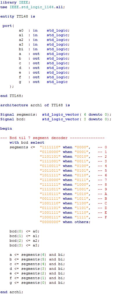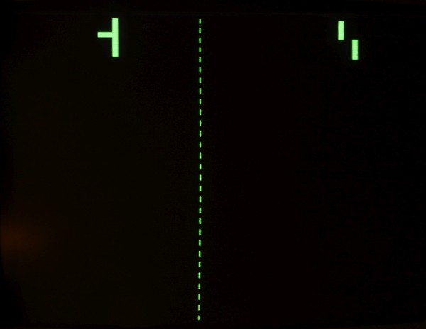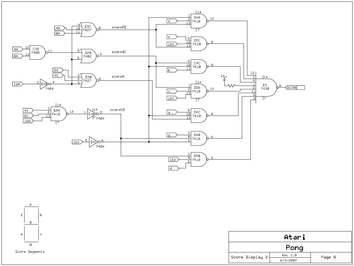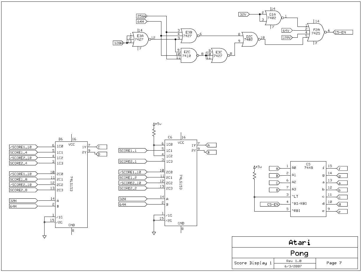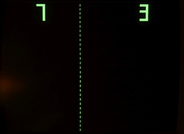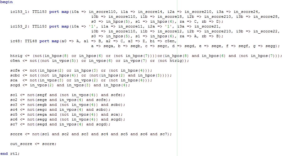 {Pong Punkteanzeige} Die Punkteanzeige bei Pong ist eine geniale Kostruktion: hier wird ein 7-Segment-Decoder, der eigentlich für den Betrieb von 7-Segment-LED-Anzeigen gedacht war, mit in die Videogenerierung eingebunden: Trickreich mit H- und V-Signalen und den Punktezählern verbunden, erscheinen dann die 7-Segment-Balken auf dem Bildschirm. Hier der VHDL-Code von 7448 und vom Behavioural der Score-Anzeige. Ähnlichkeiten mit den Obigen Schaltplänen sind nicht zufällig, sondern gewollt! Und dann wird wieder compiliert und gespannt auf den Bildschirm gestarrt: Ups, da war wohl noch ein kleiner Fehler drin (fehlende Invertierung in der Signalerzeugung...) |