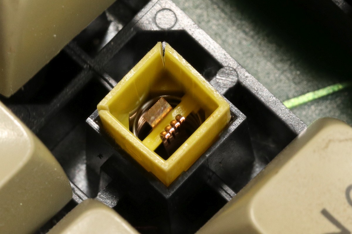 Die Kunststoffstempel, die die Tastenkappen aufnehmen, sind spröde und reißen an den Ecken leicht ein. Dann spreizen sich die Seitenteile und verklemmen.