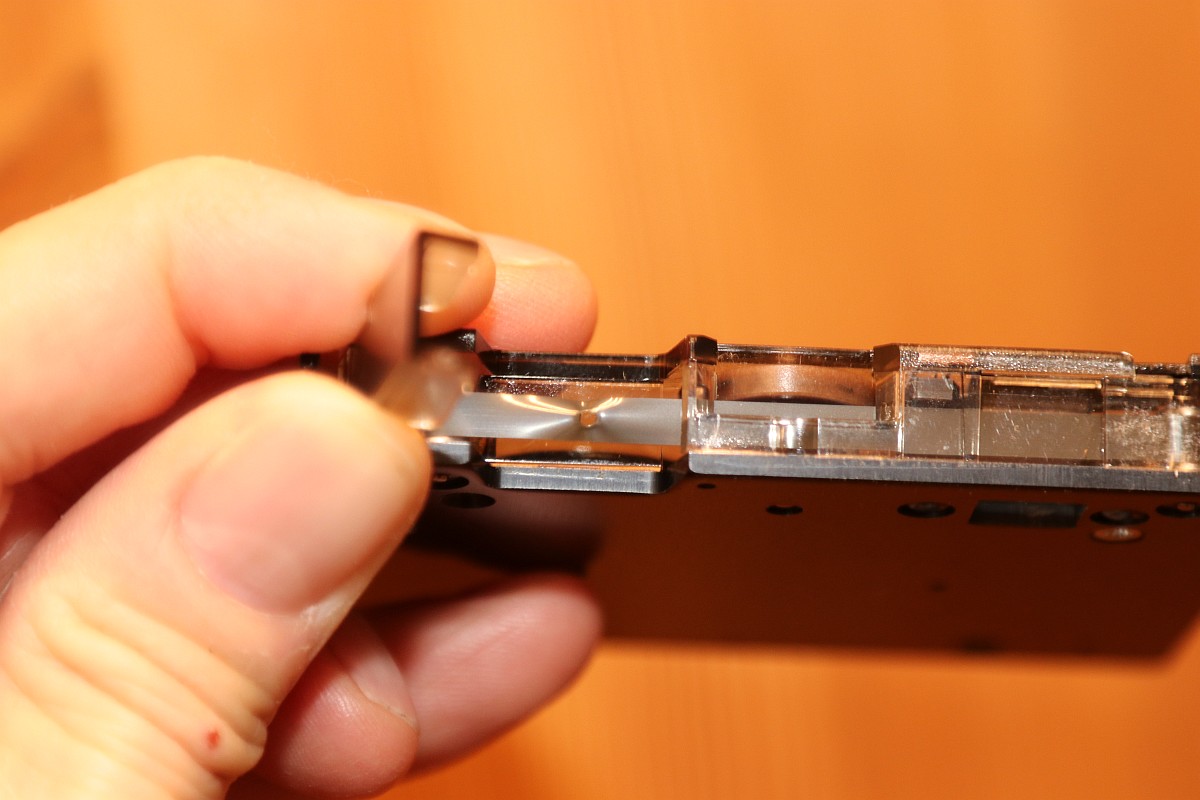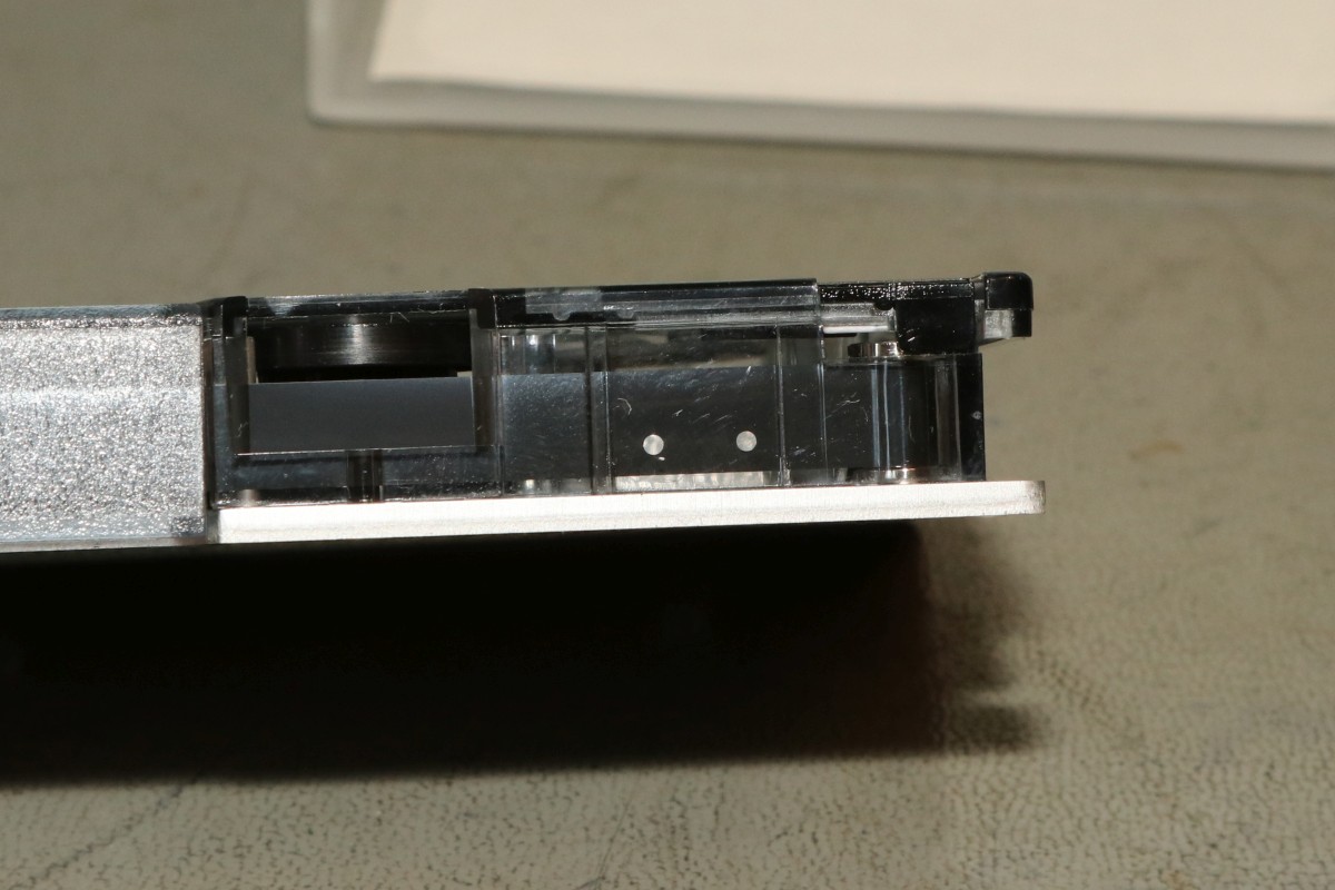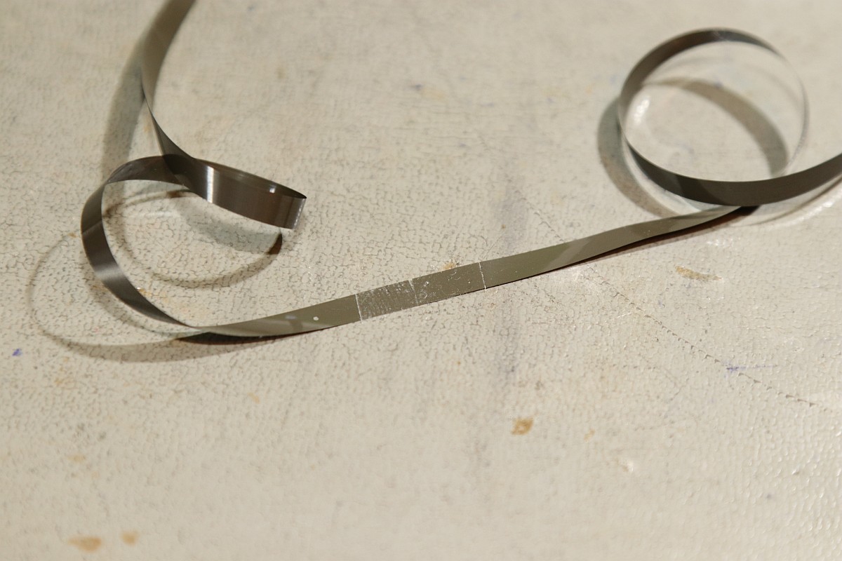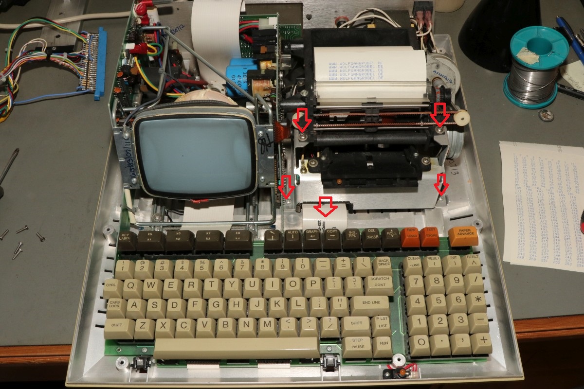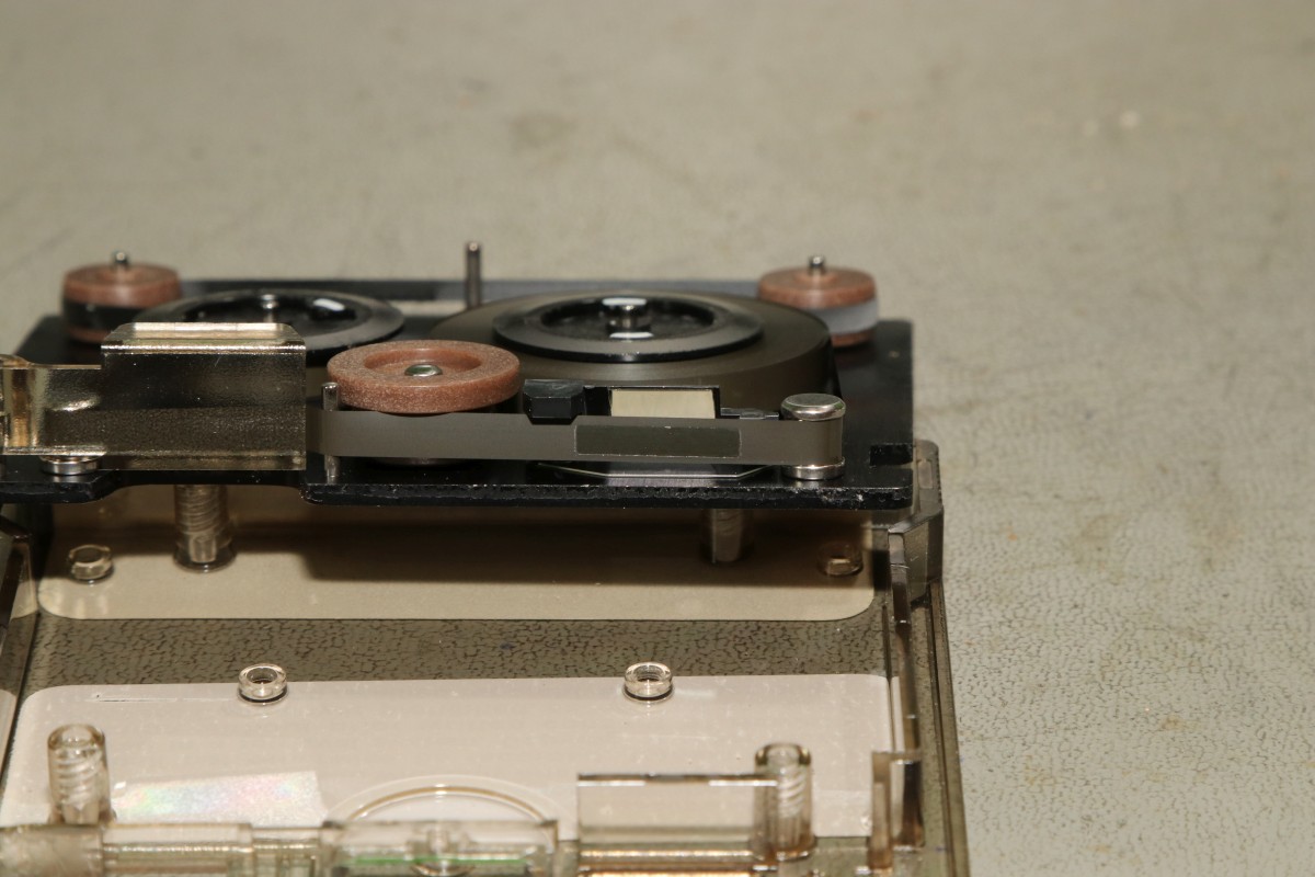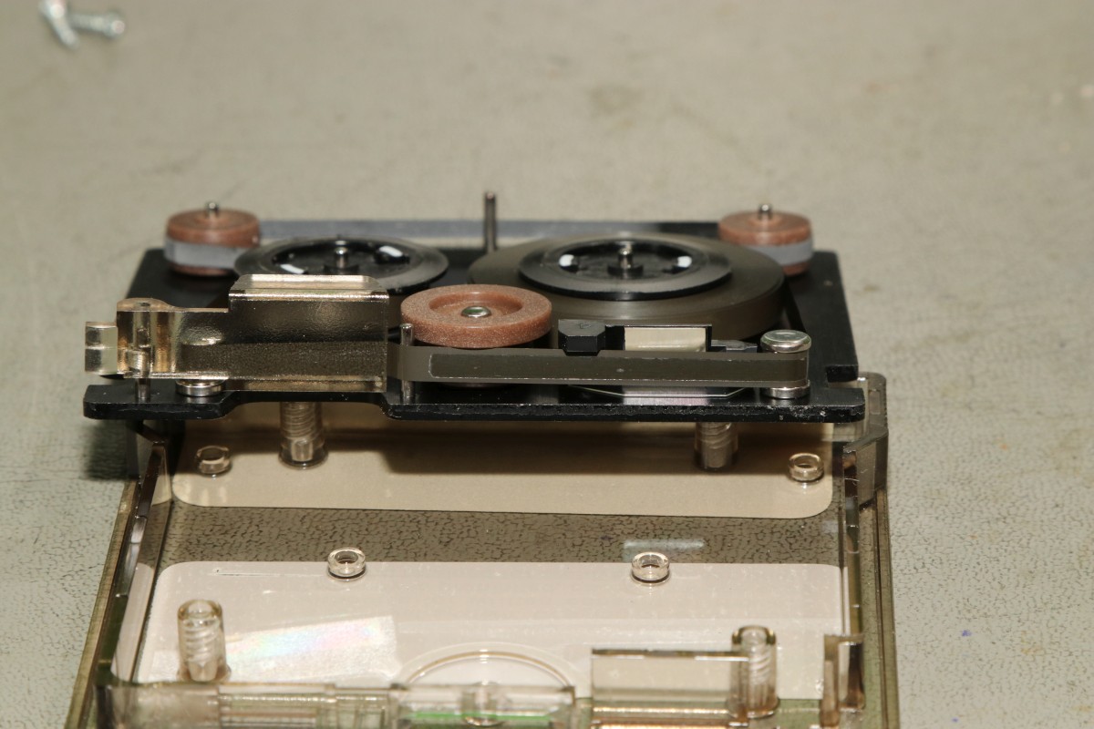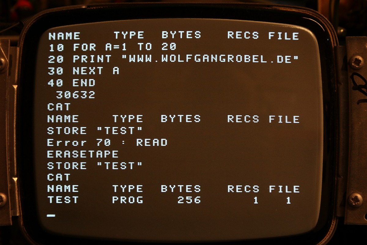{HP-85 Bandlaufwerk} das Cassettenlaufwerk des HP-85 ist ein noch schlimmeres Ärgernis, als Druckerzahnriemen und Tastenstempel zusammen...Das Problem: die Antriebsrolle besteht nach den vielen Jahren nicht mehr aus elastischem Kunststoff, sondern aus einer klebrigen, halbflüssigen Masse. O.K., hier hat der Vorbesitzer schon nachgebessert, aber nicht genug... Die alten Cassetten machen auch viel Spaß. Wenn nicht schon die Bandbeschichtung abblättert, dann reißen die internen Antriebsriemen nach wenigen Zentimetern und es gibt Bandsalat... Zwei Bandspulen - ein Antriebsrad... Immerhin original HP! Auf der Unterseite eine massive Aluplatte... Hier sieht man den gerissenen internen Antriebsriemen - er sorgt - wenn er ganz ist - für völlig gleichmäßigen Bandtransport unabhängig vom Spulendurchmesser und für den Erhalt der Bandspannung... So sieht er kurz vor dem Zerfallen aus... Hier sieht man die Folgen von 30 Jahren Kontakt zwischen Band und Antriebsriemen... das Band hängt irgendwie als Abdruck am Riemen... Diese Löcher sind wichtig! Am Bandanfang und am Bandende - in ausreichendem Abstand - dienen diese Löcher zur optischen Bandendeerkennung. Anders als bei Musik-Cassetten ist das Magnetband hier nicht an der Spule befestigt, sondern nur lose aufgelegt. Fehlt die Bandendeerkennung, dann ist Aufschrauben angesagt! Zur Sicherheit sind jeweils zwei Doppellöcher und ein einzelnes Loch gestanzt... Hier das Einzelloch, welches erkannt werden sollte. Dafür gibt es eine Lichtschranke im Laufwerk und einen 45°-Spiegel in der Cassette. Und hier klebt wieder etwas Antriebsriemen am Band... das führt zu Lesefehlern... Das war die lange Auflagefläche auf der großen Spule... Und weil es mit den originalen Cassetten so viele Probleme gibt, wird ein Umstieg auf die noch nicht ganz so verrotteten QIC-80 Bander der deutlich neueren Streamer empfohlen: Die gibt es massenhaft und günstig zu kaufen - oft noch original verpackt. Die Cassetten haben exakt die gleiche Grundfläche, sind aber etwas dicker. Das Band ist 1/4" breit - ebenfalls dicker als das Original. Ansonsten sind Aufbau und Mechanik identisch... Das sieht man gut im Vergleich: Selbst die Bandende-Löcher sind vorhanden! Ein wichtiger Unterschied liegt allerdings in der Magnetbeschichtung: diese benötigt einen erhöhten Schreibstrom - das muss man beim Umbau durch den Wechsel eines Widerstandes kompensieren! Und die Schutzklappe ist deutlich größer und verhakt gerne mit dem HP-85-Gehäuse... Und noch eine wichtige Umbaumaßnahme: die Antriebsrolle liegt aufgrund der höheren Breite des Bandes deutlich höher - das muss bei der Wahl des richtigen Antriebsrades berücksichtigt werden... Bevor ich allzuviel umbauen muss, versuche ich erst mal, die originalen Bänder zu verwenden... Angeblich sollen diese USA-Plastibands helfen, den Antriebsgummi zu ersetzen... Die gehen zwar mit sanfter Gewalt drauf - flutschen aber nach ein paar Umdrehungen wieder runter - zu eng... Datenfehler... Da sehe ich mir die QIC-80-Bänder genauer an. Wenn man Glück hat, bekommt man die für einen Euro pro Stück... Einen Euro für einen passgenauen Transportgummi... cool. Da kann ich den Rest getrost entsorgen... ;-) Der QIC-80 Transportriemen passt perfekt auch in die HP-Cassetzten! Das verhunzte Band wird gekürzt, die Bandendelöcher werden gnadenlos mit dem Lötkolben reingebrannt... nicht schön, aber... Funktioniert!!! Ach, ist das schön, wenn man seine Programme auch mal abspeichern kann... Mittlerweile habe ich noch viel rumprobiert - Bänder kürzen und aneinanderkleben - alles geht so leidlich... ... und man kann auch die verklebten Segmente problemlos rausschneiden! Aber nach kurzer Zeit weigerte sich das Laufwerk auch diese Bänder zu erkennen. Zeit für eine genauere Analyse! Der Ausbau des Bandlaufwerks ist einfach: vier Schrauben und zwei Flachbandkabel sind zu lösen - die Tastatur muss dazu aufgeklappt sein - dann kann man das Teil nach vorne rausziehen. Hier ist der Patient einzeln: Der Blick auf den Cassettenschacht: Man kann erahnen, was die Ursache für die Probleme ist... Die Rückenansicht: Das dicke Runde ist der Antrieb für das Band... Weitere Demontage - auf die Schrauben aufpassen! Die sind alle zöllig, Ersatz ist nicht leicht! Der Antriebsmotor ist mit vier Schrauben befestigt... Aber Vorsicht! Die Lötanschlüsse des Glühlämpchens für die Tachoscheibe müssen vorher abgelötet werden! Schon ist der Motor demontiert. Hier ist der Übeltäter - wenn man eine Reparatur nur unsauber macht... Die Welle ist zwar schon mal abgedreht worden, dafür hatte man aber die neue Gummirolle mit dem falschen Kleber fixiert. der richtige Klebstoff sollte hier zumindest dauerelastisch bleiben - Schuhkleber zum Beispiel. Mein TX5 löst die zwei (!) Madenschrauben, die die Antriebswelle auf der Motorwelle halten... Vorsicht auf die Tachoscheibe - die ist empfindlich und unverzichtbar! Da muss ich ran... Hier ist das Gegenstück am Motor - das Glühlämpchen sitzt unsichtbar darunter! Ziemlich feine Strukturen... Jetzt weiß ich auch, warum dieser Motor so fein regeln kann... Jetzt muss ich nur noch auf geeignete Gummirollen warten. Ich bin gespannt!