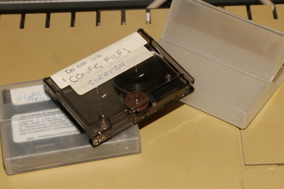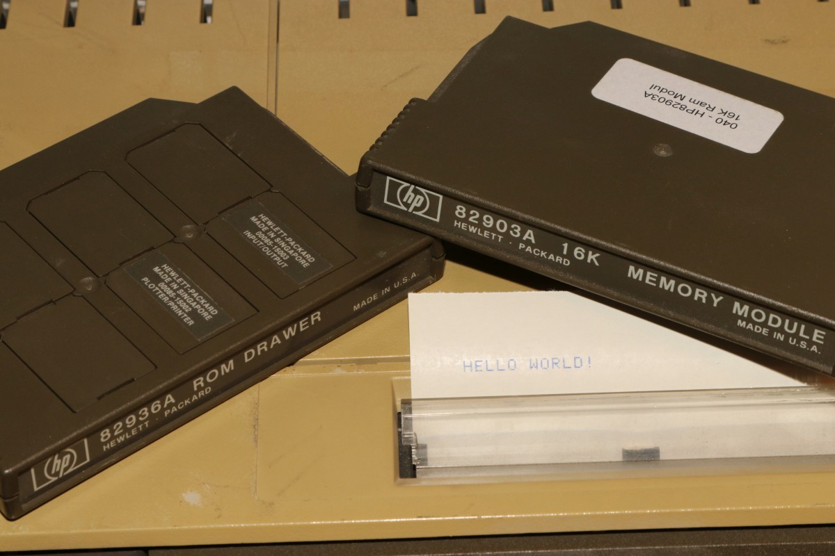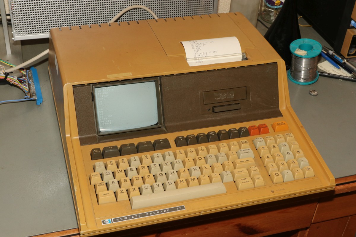 {HP-85 - Neuankunft} Ach, der Anfang der 80er... Wichtige Leute hatten einen Schnauzbart und natürlich einen HP-Computer... Ich habe keinen Schnauzbart (Gottseidank), aber dafür jetzt zwei HP-Computer... Lange schon ein Traum von mir, dafür aber mittlerweile nicht billig: der HP-85A. Ein Komplettrechner mit durchdachter Architektur, Monitor, Bandlaufwerk und Thermodrucker inclusive! 1980 kam er auf den Markt und kostete damals heftige 3.250$... Und wie es der Zufall wollte, suchten natürlich gleich zwei Exemplare bei mir Unterschlupf - ein sehr vergilbtes Model... ... und ein völlig unvergilbtes Modell: Beiden Modellen gemeinsam: Monitor und Thermodrucker funktionieren. ... wobei der eine Drucker etwas wenig Zahnriemenspannung besitzt - das sieht man am versetzten Druckbild. Die Zahnriemen sind übrigens eines der Probleme bei HP-85-Druckern. Sie zerfallen im Lauf der Jahre in krümelige Einzelteile. Aber Ersatz ist nahe! Die Programmierung erfolgt hauptsächlich in BASIC, einer einfachen aber praktischen Programmiersprache. Alternativ kann der HP-85 aber auch in Maschinensprache programmiert werden, dafür benötigt man aber Zusatzhardware! Die gigantische Grundspeicherausstattung von 16k RAM kann über eine Einsteckkarte auf wahnsinnige 32k erweitert werden - das bekommt man nie voll... Funktioniert sogar... Dazu gibt es noch eine ROM-Karte, in die man eigene EPROMs stecken kann... Und einen sogenannten ROM DRAWER, in den nur HP-spezifische Spezial-ROMs passen: Alles in Allem ein schönes und umfangreiches Elektroschrottpaket höchster Güte! Cassetten für das Bandlaufwerk sind auch dabei - aber diese und das Laufwerk sind ein weiteres Betätigungsfeld für umfangreiche Restaurationstätigkeiten. Die Cassetten zerfallen und die Andruckrolle im Bandlaufwerk verwandelt sich in eine klebrige Masse... Für den Sammler kein Plug&Play - das benötigt viel Liebe! Dazu noch ein HP-IP-Interface - gut für HP-Messgeräte und Plotter zum Beispiel... Dieses Gerät hatte sicher einen langen und sinnvollen Einsatz in seinem Leben - und funktioniert immer noch! O.K., den Monitor kann man mal putzen, aber sonst... Wie es mit allen Problemen und Komponenten so weiter geht, könnt ihr in den anderen Artikeln bis in's feinste Detail nachlesen!