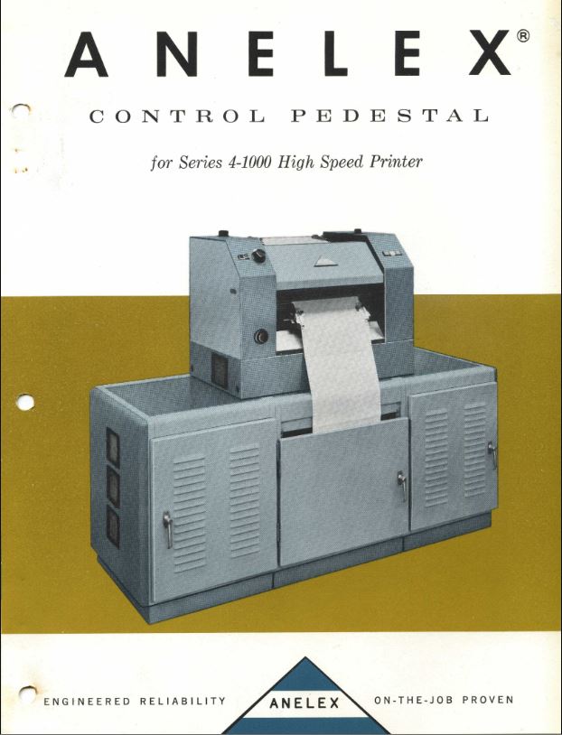 {Anelex Drucker von 1965} Ein paar Jahre vor meiner Geburt glänzte die Firma Anelex durch ein Angebot an riesigen Computerdruckern, als es noch keine integrierten Bausteine zu vernünftigen Preisen zu kaufen gab. Alle Konstruktionen wurden diskret aufgebaut - hier noch mit beeindruckenden Germanium-Transistoren, Silizium stand erst in den Startlöchern! Den Drucker habe ich nicht bekommen... (Danke an http://www.chilton-computing.org.uk/ für das Katalogbild!)