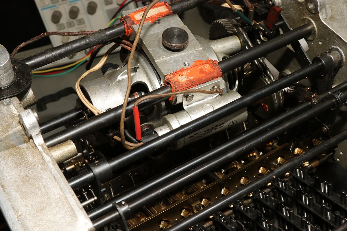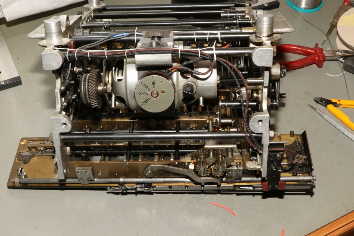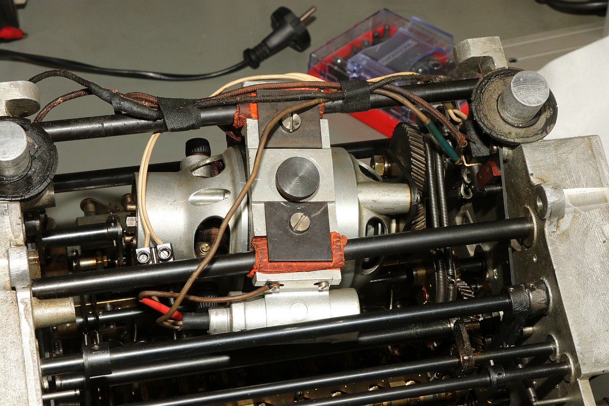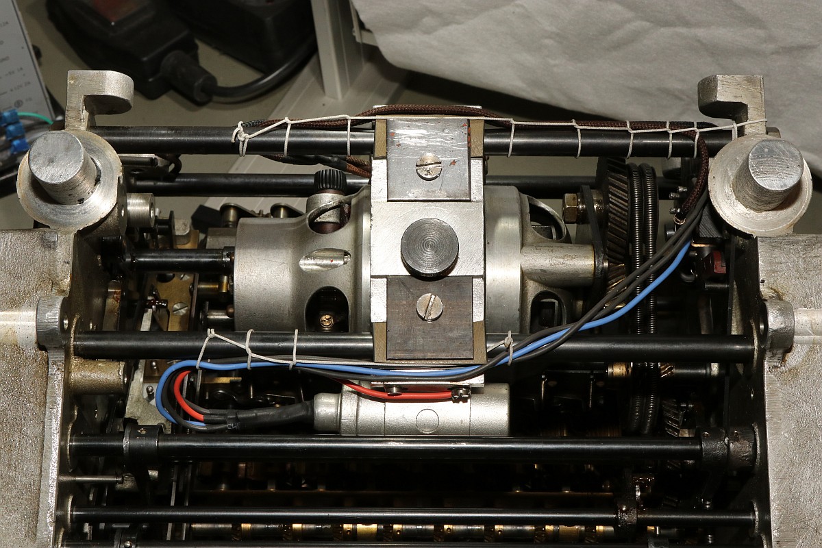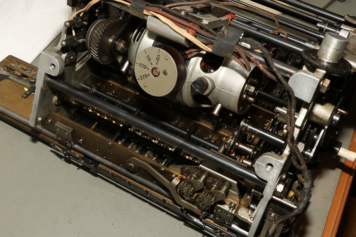 Das Besondere an dieser Maschine ist nicht nur das stattliche Alter von 85 Jahren, sondern die Fähigkeit, eine Division vollautomatisch durchzuführen! Der Zustand der Maschine war exzellent für das Alter - aber trotzdem gab es einiges zu tun, vor Allem im Bereich Elektrik! Aber Schritt für Schritt! Im Jahre 1930 war es üblich, solche Geräte mit stoffummantelten Leitungen zu kostruieren. Nach 85 Jahren ist der Stoff zwar noch vorhanden, die darunter liegende Isolierung ist allerdings in erbarmungswürdigem Zustand und krümelt so vor sich hin... Immerhin liegen an den Kabeln und Schaltern 230V Netzspannung an - Erdung ist irgendwie nicht vorgesehen, der Betrieb ist eigentlich nur noch mit einem Trenntrafo halbwegs sicher möglich!!! Die Aufhängung des Antriebsmotors soll so eigentlich nicht sein - die Kautschukbuchsen sind von zäh nach flüssig nach steinhart migriert. So müssen Fossilien entstehen. Die gute Nachricht: die Antriebsriemen sind keine Gummiriemen sondern Spiralfedern. Haltbarkeit: ewig! Die Elektrik ist lebensgefählich - ausgefranst, Isolierung fehlt, Kabel sind völlig brüchig. Das muss grundlegend neu! Der Unterbrecherschalter der Schlittenverstellung: Die Buchsen der Motoraufhängung sind sogar gewebeverstärkt... hat ihnen alles nichts genützt. Auf der Rückseite des Motors befindet sich ein dreifach-Entstörfilter. Ich wusste nicht, dass es das 1935 schon gab! Die Elektrik ist einfach: der Motor hängt einseitig am Netz, auf der anderen Seite trennen Unterbrecherkontakt und Sicherheitsschalter der Schlittenverstellung in Reihe den Stromkreis. Alles fliegt erst mal raus! Auch die Gehäusefüße haben ihre beste Zeit hinter sich! Aber das ist eine andere Geschichte! Das Entstörfilter ist stark beschädigt, was die Kabelage betrifft. Das Teil muss schon mal ersetzt worden sein, laut Stempel stammt es von 1949 und die Kabel sind mit Lüsternklemmen angetüddelt... Ich habe im Netz sogar den Katalog des Herstellers gefunden... Eine Nachbestellung erscheint mir allerdings aussichtslos. Der Antriebsmotor erscheint bis auf die verrotteten Anschlusskabel in gutem Zustand. Die Umschaltung für verschiedene Spannungsversorgungen erfolgt über eine drehbare Kontaktplatte: Um endlich mal ein Erfolgserlebnis zu haben, hab ich schon mal die Motorbefestigung gereinigt... Der Unterbrecherschalter hat Liebe nötig... Der Schlittenschalter sieht noch ganz gut aus... Der Motor ist recht sauber und läuft gut. Er ist 100% demontierbar, was die Mechanik betrifft, das würde man sich heute wünschen... Laufspuren aber kaum Bürstenfeuer... das bleibt so. Never change a running system! Selbst die Kohlen könnte man ohne Werkzeug wechseln: Ich möchte wissen, ob ich die Anschlusslitzen direkt im Motor anschließen kann... Dafür muss die Kontaktplatte komplett demontiert werden. Die Kontakte sind per Madenschrauben auf die Kabel geschraubt! Leider geht das nicht - die Kabel verschwinden im Motor. Also die harte Tour! Hier hilft der Seitenschneider... Sauber verzinnen... Die Anschlusshülsen sind gelötet: Ich habe einen deutschen Anbieter für stoffummantelte Einzellitzen gefunden... das war nicht einfach... Die Litzen passen perfekt, auch vom Durchmesser her! Für das Konfektionieren benötigt man ein scharfes Messer und ein Feuerzeug. Der Stoff wird angeschmolzen und somit verschweißt, dann rutscht nichts mehr. Zusätzlich kann man die Enden mit einem Stück Schrumpfschlauch stabilisieren. Schon ist der Motor wie neu! Nächste Baustelle: das Netzfilter. Die Isolierungen sind brüchig, die schwarzen Isolierungen sind schon völlig zerfallen. Hier verwende ich silikonisolierte Litzen. Das ist jetzt nicht so original, aber es isoliert sicher... Der Unterbrecherschalter erhält auch ein Stück silikonisolierte Litze und wird gründlich gereinigt: Die Litze wird direkt auf die Stahlelemente gelötet, endlich muss mein Lötkolben mal was leisten! Die neuen Kabel sind ja sowas von Retro... ;-) Fixiert werden die Kabel standesgemäß mit verknoteter Schnur... Ein Wermutstropfen am Rande: die Maschine lief ca eine halbe Stunde störungsfrei, dann plötzlich fing der Motor an, im Dauerlauf zu laufen... Da die Unterbrecherschalter offen waren, konnte dies nur eines bedeuten: der Entstörkondensator ist durchgeschlagen! Und ja, er war recht heiß. Da das Gerät auch ohne Entstörung läuft, habe ich den Kondensator erst einmal komplett von der Verkabelung wieder getrennt... Viel Aufwand für nix. Aber immerhil läuft und rechnet die Maschine wieder einwandfrei wie am ersten Tag! Der wunderschön verschnörkelte Herstellerschriftzug: Auch die Ziffern sind eine Schönheit! Maschinenimpressionen: Jetzt noch ein paar interessante Details, hier die Eingabemechanik: Eine Zahnstange bedient das Rädchen der Anzeige und verschiebt ein Mitnehmerzahnrad auf einer quadratischen Welle: Unbetätigt entspricht der Ziffer "0": Und bei Ziffer "9": Und hier noch das entscheidende Detail, welches dieser Rechenmaschine ihren Gattungsnamen "Staffelwalzenmaschine" gegeben hat: Je nach Lage des Mitnehmerzahnrades werden mehr oder weniger Zähne der Staffelwalze wirksam: Fazit: eine wunderschöne und trickreiche Maschine mit erstaunlichen Fähigkeiten. Diese werden demnächst noch in einem Film zu bewundern sein, da z.B. der Ablauf einer vollautomatischen Division nicht mit Fotos zu dokumentieren ist... |