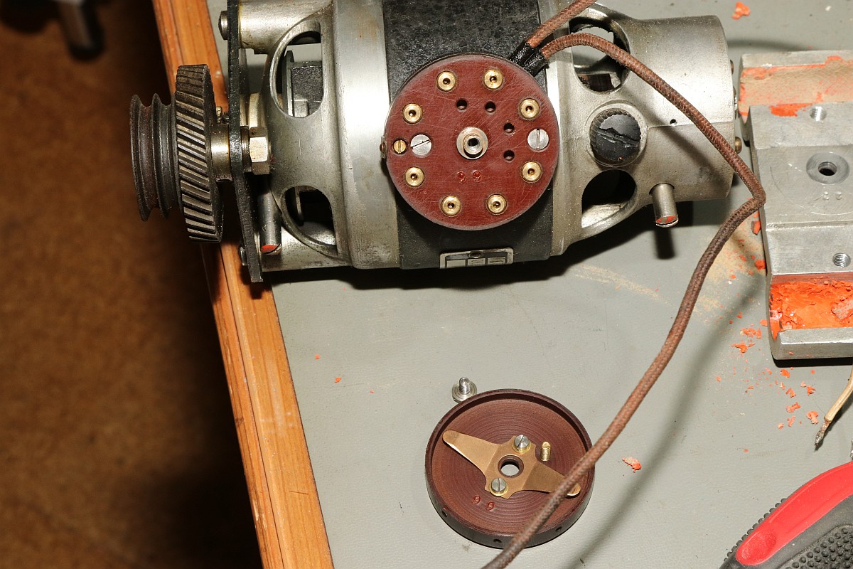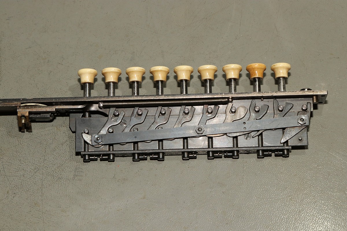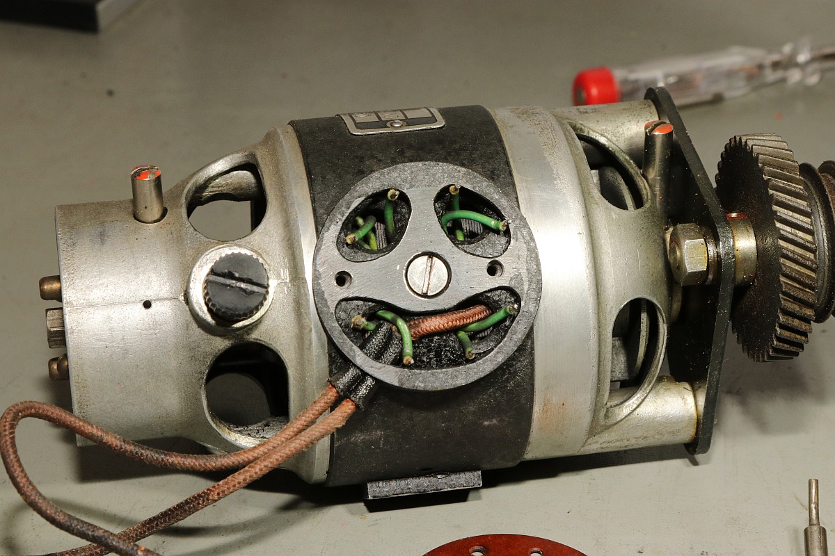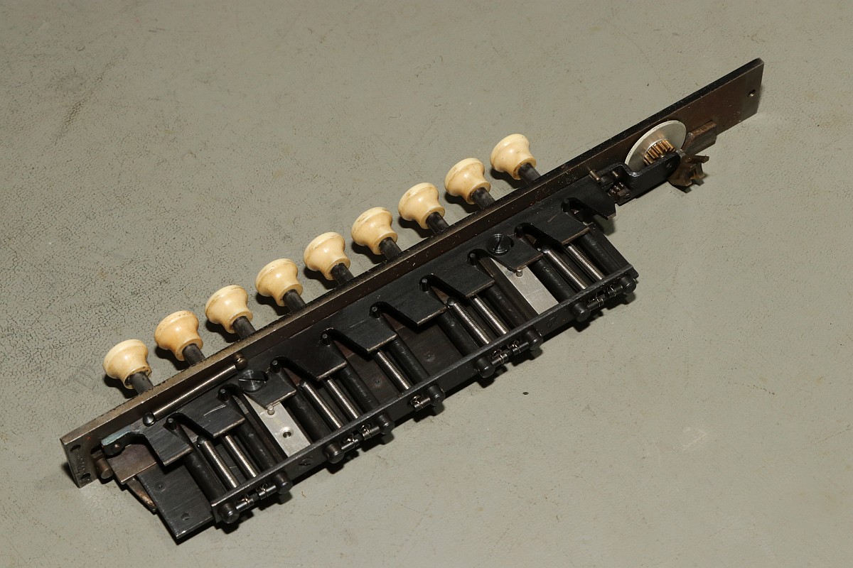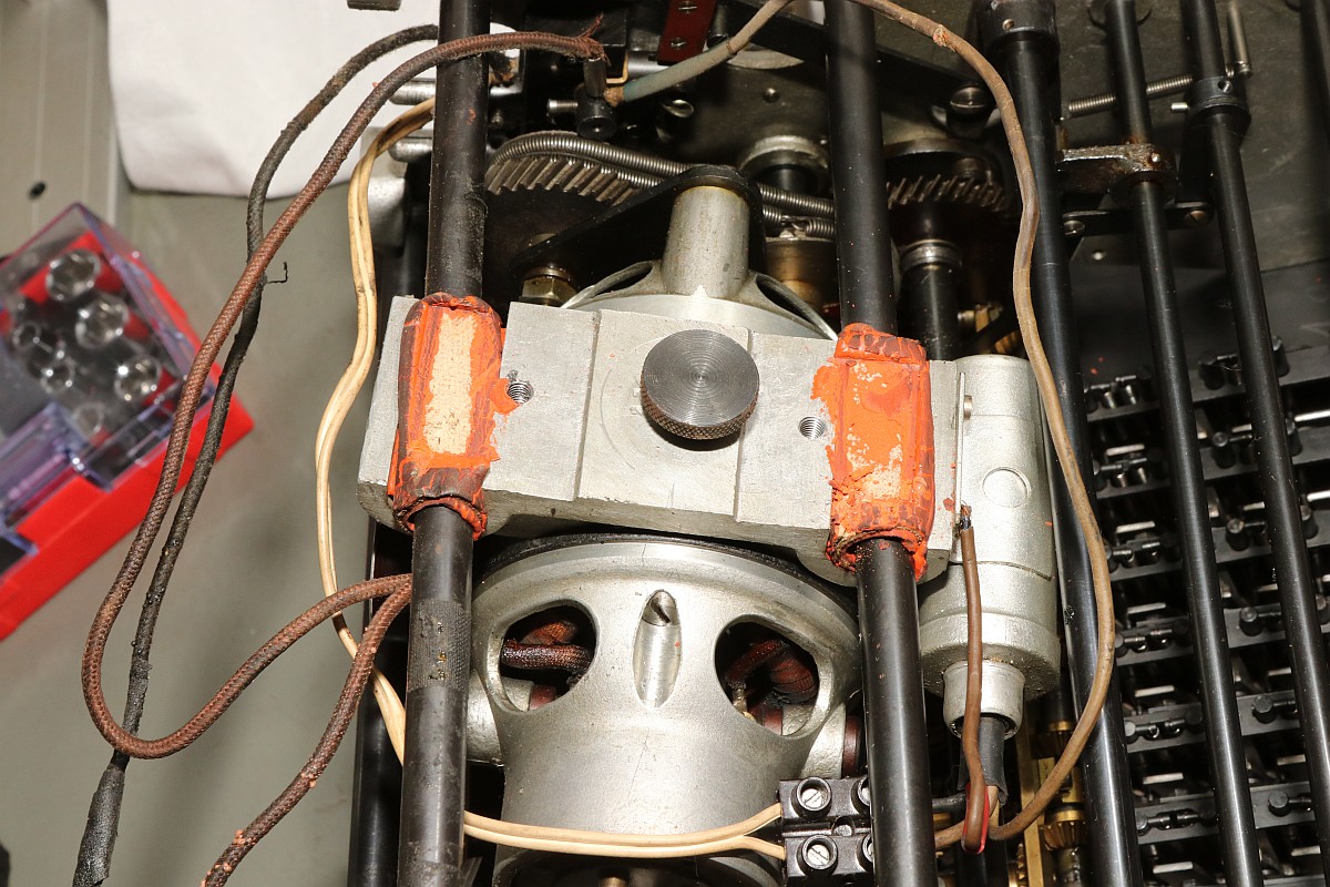 Das Besondere an dieser Maschine ist nicht nur das stattliche Alter von 85 Jahren, sondern die Fähigkeit, eine Division vollautomatisch durchzuführen! Der Zustand der Maschine war exzellent für das Alter - aber trotzdem gab es einiges zu tun, vor Allem im Bereich Elektrik! Aber Schritt für Schritt! Im Jahre 1930 war es üblich, solche Geräte mit stoffummantelten Leitungen zu kostruieren. Nach 85 Jahren ist der Stoff zwar noch vorhanden, die darunter liegende Isolierung ist allerdings in erbarmungswürdigem Zustand und krümelt so vor sich hin... Immerhin liegen an den Kabeln und Schaltern 230V Netzspannung an - Erdung ist irgendwie nicht vorgesehen, der Betrieb ist eigentlich nur noch mit einem Trenntrafo halbwegs sicher möglich!!! Die Aufhängung des Antriebsmotors soll so eigentlich nicht sein - die Kautschukbuchsen sind von zäh nach flüssig nach steinhart migriert. So müssen Fossilien entstehen. Die gute Nachricht: die Antriebsriemen sind keine Gummiriemen sondern Spiralfedern. Haltbarkeit: ewig! Die Elektrik ist lebensgefählich - ausgefranst, Isolierung fehlt, Kabel sind völlig brüchig. Das muss grundlegend neu! Der Unterbrecherschalter der Schlittenverstellung: Die Buchsen der Motoraufhängung sind sogar gewebeverstärkt... hat ihnen alles nichts genützt. Auf der Rückseite des Motors befindet sich ein dreifach-Entstörfilter. Ich wusste nicht, dass es das 1935 schon gab! Die Elektrik ist einfach: der Motor hängt einseitig am Netz, auf der anderen Seite trennen Unterbrecherkontakt und Sicherheitsschalter der Schlittenverstellung in Reihe den Stromkreis. Alles fliegt erst mal raus! Auch die Gehäusefüße haben ihre beste Zeit hinter sich! Aber das ist eine andere Geschichte! Das Entstörfilter ist stark beschädigt, was die Kabelage betrifft. Das Teil muss schon mal ersetzt worden sein, laut Stempel stammt es von 1949 und die Kabel sind mit Lüsternklemmen angetüddelt... Ich habe im Netz sogar den Katalog des Herstellers gefunden... Eine Nachbestellung erscheint mir allerdings aussichtslos. Der Antriebsmotor erscheint bis auf die verrotteten Anschlusskabel in gutem Zustand. Die Umschaltung für verschiedene Spannungsversorgungen erfolgt über eine drehbare Kontaktplatte: Um endlich mal ein Erfolgserlebnis zu haben, hab ich schon mal die Motorbefestigung gereinigt... Der Unterbrecherschalter hat Liebe nötig... Der Schlittenschalter sieht noch ganz gut aus... Der Motor ist recht sauber und läuft gut. Er ist 100% demontierbar, was die Mechanik betrifft, das würde man sich heute wünschen... Laufspuren aber kaum Bürstenfeuer... das bleibt so. Never change a running system! Selbst die Kohlen könnte man ohne Werkzeug wechseln: Ich möchte wissen, ob ich die Anschlusslitzen direkt im Motor anschließen kann... Dafür muss die Kontaktplatte komplett demontiert werden. Die Kontakte sind per Madenschrauben auf die Kabel geschraubt! Leider geht das nicht - die Kabel verschwinden im Motor. Also die harte Tour! Hier hilft der Seitenschneider... Sauber verzinnen... Die Anschlusshülsen sind gelötet: Ich habe einen deutschen Anbieter für stoffummantelte Einzellitzen gefunden... das war nicht einfach... Die Litzen passen perfekt, auch vom Durchmesser her! Für das Konfektionieren benötigt man ein scharfes Messer und ein Feuerzeug. Der Stoff wird angeschmolzen und somit verschweißt, dann rutscht nichts mehr. Zusätzlich kann man die Enden mit einem Stück Schrumpfschlauch stabilisieren. Schon ist der Motor wie neu! Nächste Baustelle: das Netzfilter. Die Isolierungen sind brüchig, die schwarzen Isolierungen sind schon völlig zerfallen. Hier verwende ich silikonisolierte Litzen. Das ist jetzt nicht so original, aber es isoliert sicher... Der Unterbrecherschalter erhält auch ein Stück silikonisolierte Litze und wird gründlich gereinigt: Die Litze wird direkt auf die Stahlelemente gelötet, endlich muss mein Lötkolben mal was leisten! Die neuen Kabel sind ja sowas von Retro... ;-) Fixiert werden die Kabel standesgemäß mit verknoteter Schnur... Ein Wermutstropfen am Rande: die Maschine lief ca eine halbe Stunde störungsfrei, dann plötzlich fing der Motor an, im Dauerlauf zu laufen... Da die Unterbrecherschalter offen waren, konnte dies nur eines bedeuten: der Entstörkondensator ist durchgeschlagen! Und ja, er war recht heiß. Da das Gerät auch ohne Entstörung läuft, habe ich den Kondensator erst einmal komplett von der Verkabelung wieder getrennt... Viel Aufwand für nix. Aber immerhil läuft und rechnet die Maschine wieder einwandfrei wie am ersten Tag! Der wunderschön verschnörkelte Herstellerschriftzug: Auch die Ziffern sind eine Schönheit! Maschinenimpressionen: Jetzt noch ein paar interessante Details, hier die Eingabemechanik: Eine Zahnstange bedient das Rädchen der Anzeige und verschiebt ein Mitnehmerzahnrad auf einer quadratischen Welle: Unbetätigt entspricht der Ziffer "0": Und bei Ziffer "9": Und hier noch das entscheidende Detail, welches dieser Rechenmaschine ihren Gattungsnamen "Staffelwalzenmaschine" gegeben hat: Je nach Lage des Mitnehmerzahnrades werden mehr oder weniger Zähne der Staffelwalze wirksam: Fazit: eine wunderschöne und trickreiche Maschine mit erstaunlichen Fähigkeiten. Diese werden demnächst noch in einem Film zu bewundern sein, da z.B. der Ablauf einer vollautomatischen Division nicht mit Fotos zu dokumentieren ist... |