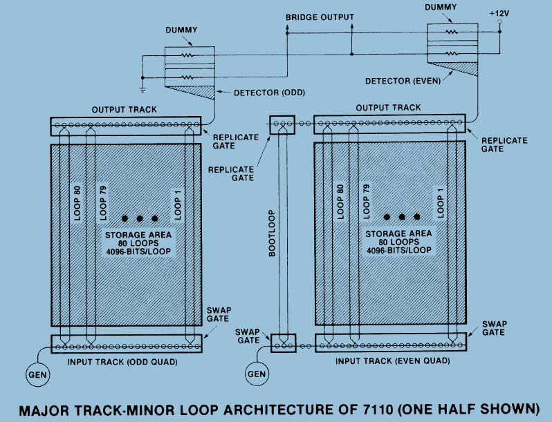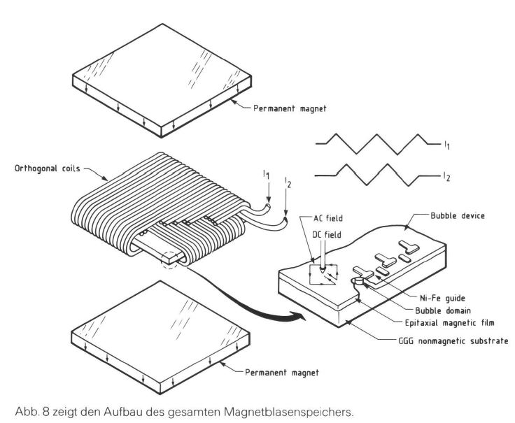 Der Magnetblasenspeicher besteht eigentlich nur aus einem Substrat mit magnetisierbarer Beschichtung und zwei Permanentmagneten, sowie trickreichen Strukturen, die die magnetisierten Bereich gezielt weiter leiten und einem Satz Spulen, die um das Ganze ein Wechselfeld erzeugen... Ganz einfach also, ohne bewegte Teile.