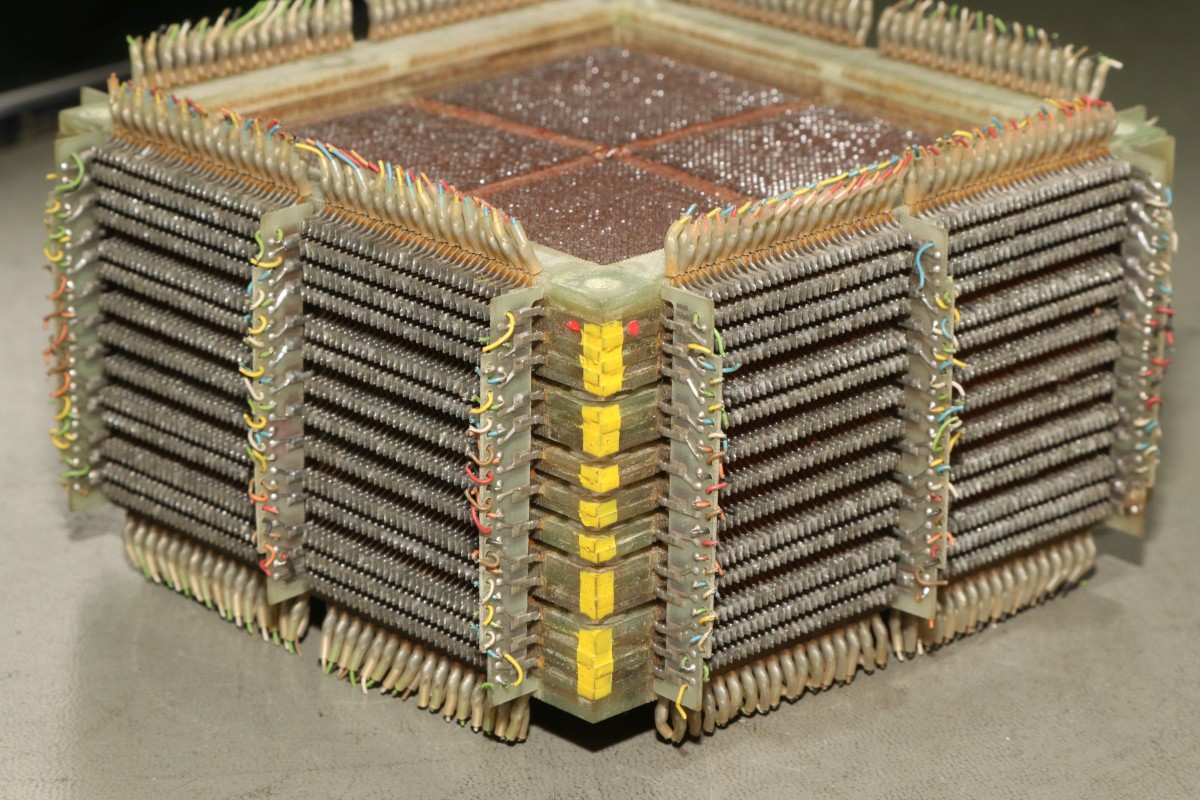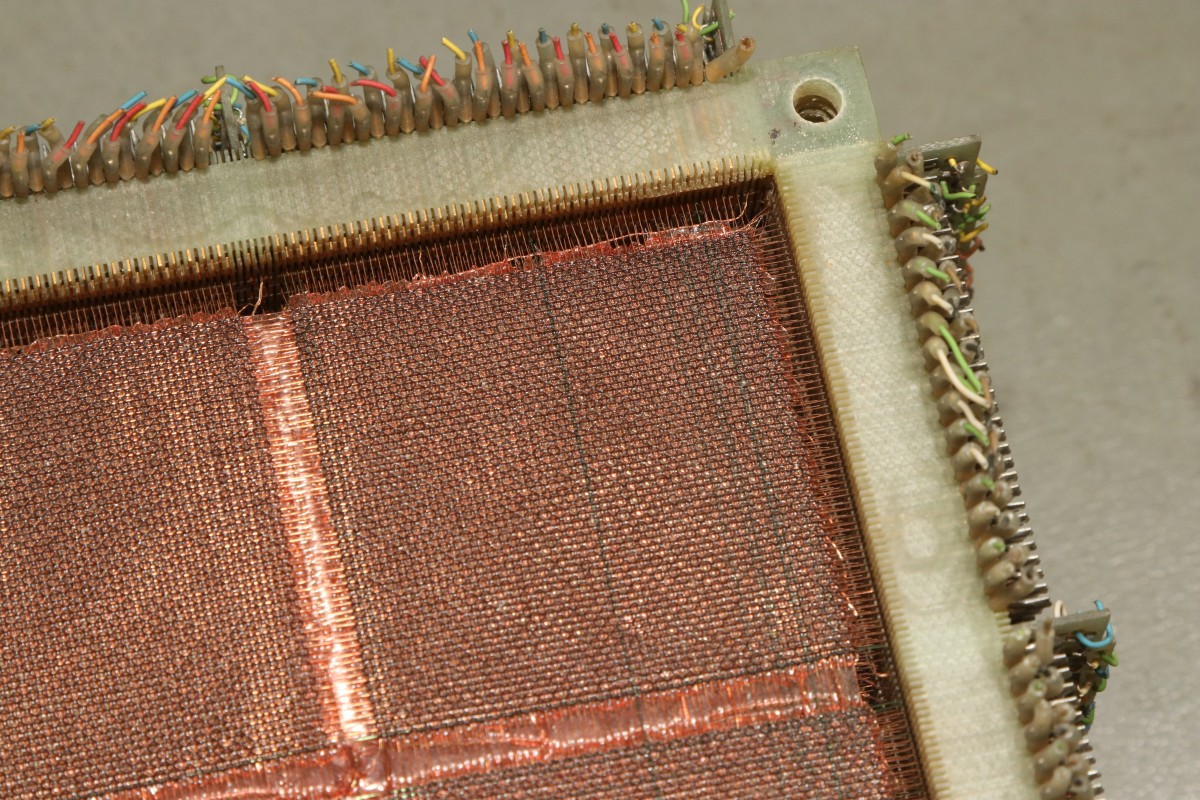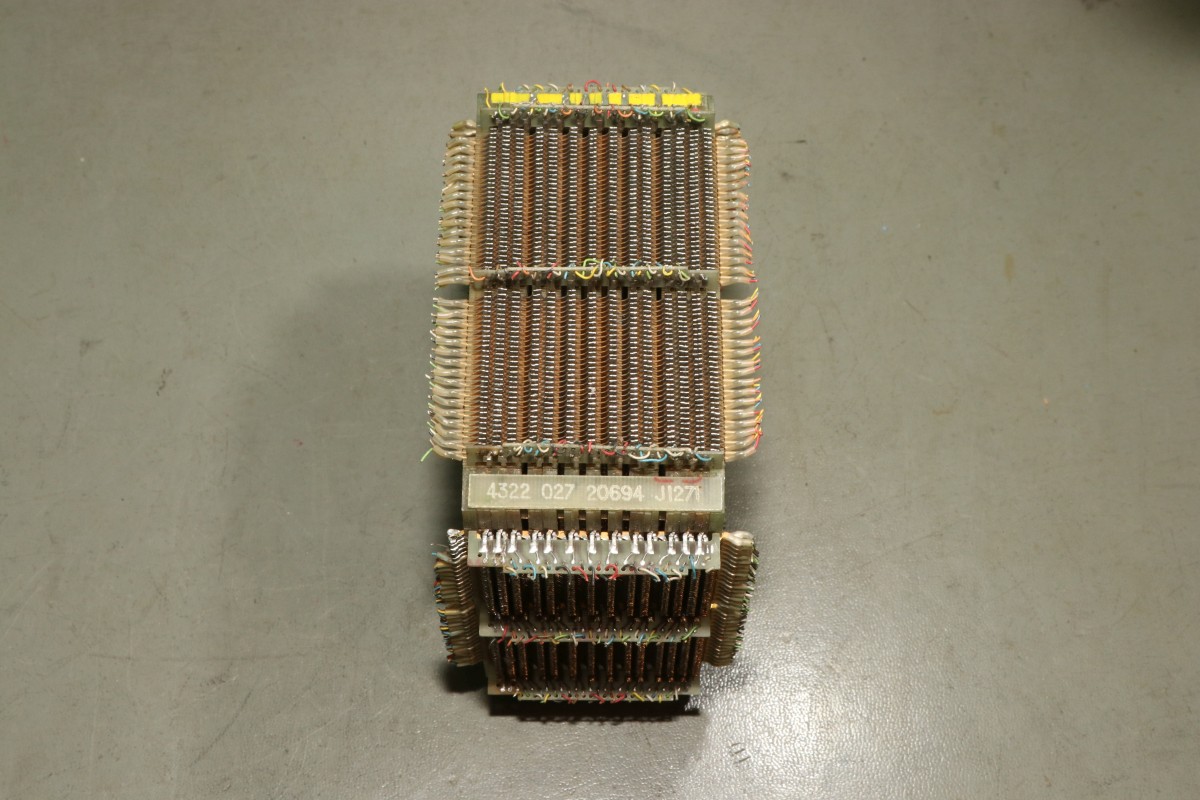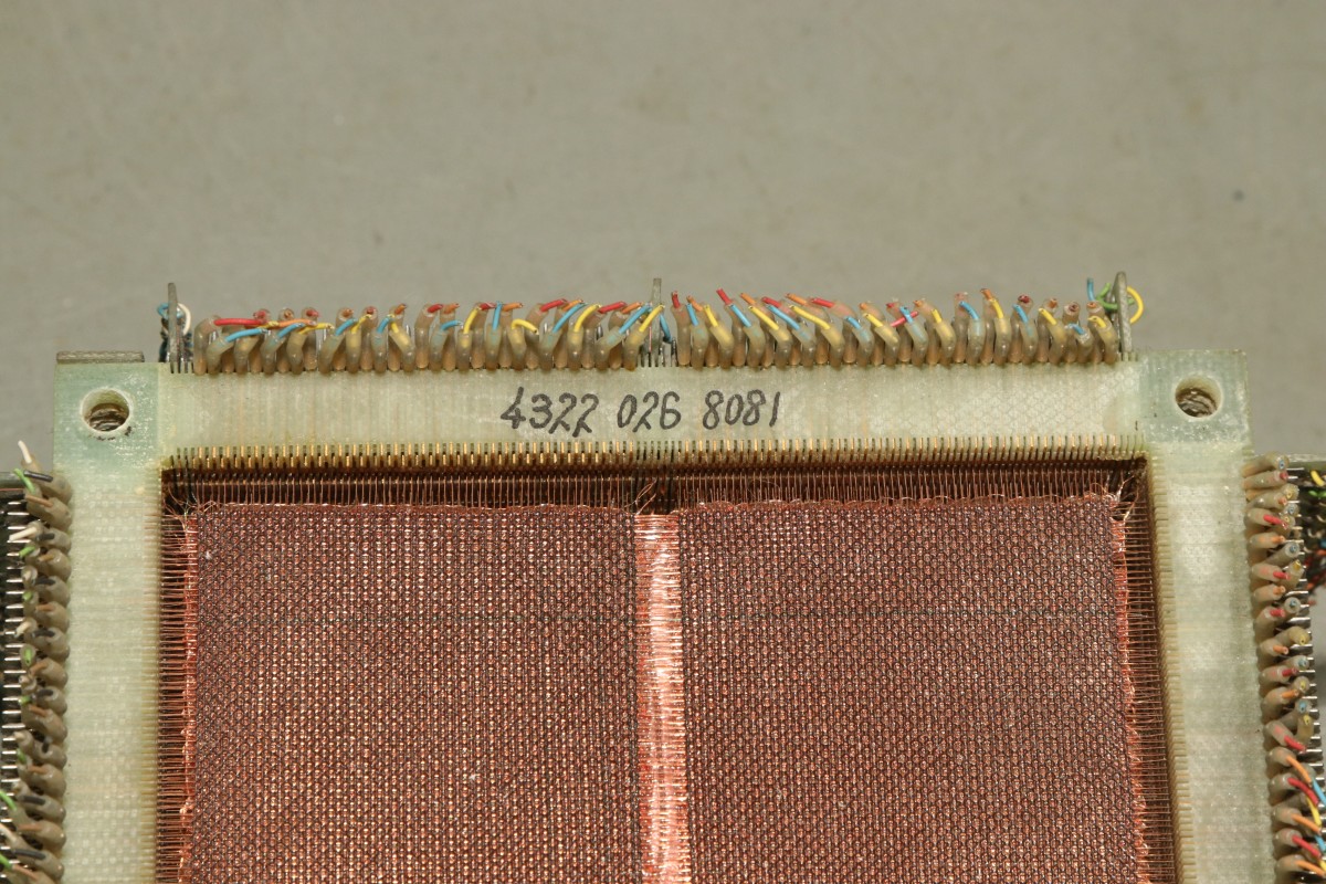 Update 2022: Günter S. hat mir freundlicher Weise Infos zum hier gezeigten Stück übermittelt: "Diese Einheit, bestehend aus 13 Einzel-Matrizen mit je 16kBit, war mit einem weiteren Block zu einer Kernspeicher-Einheit 16k x 26 Bit mit der entsprechenden Ansteuerelektronik zusammengefasst und kam bei den Telefunken-Rechnern TR440 und TR86 zum Einsatz. Die Wortlänge betrug 24 Bit, die 2 restlichen Bits dienten zur Fehlererkennung und -Korrektur im Kernspeicher-Magazin. Hersteller bzw. Lieferant der Einzel-Matrizen war Valvo, ob diese Teile auch bei anderen Rechner-Herstellern verwendet wurden, entzieht sich meiner Kenntnis."