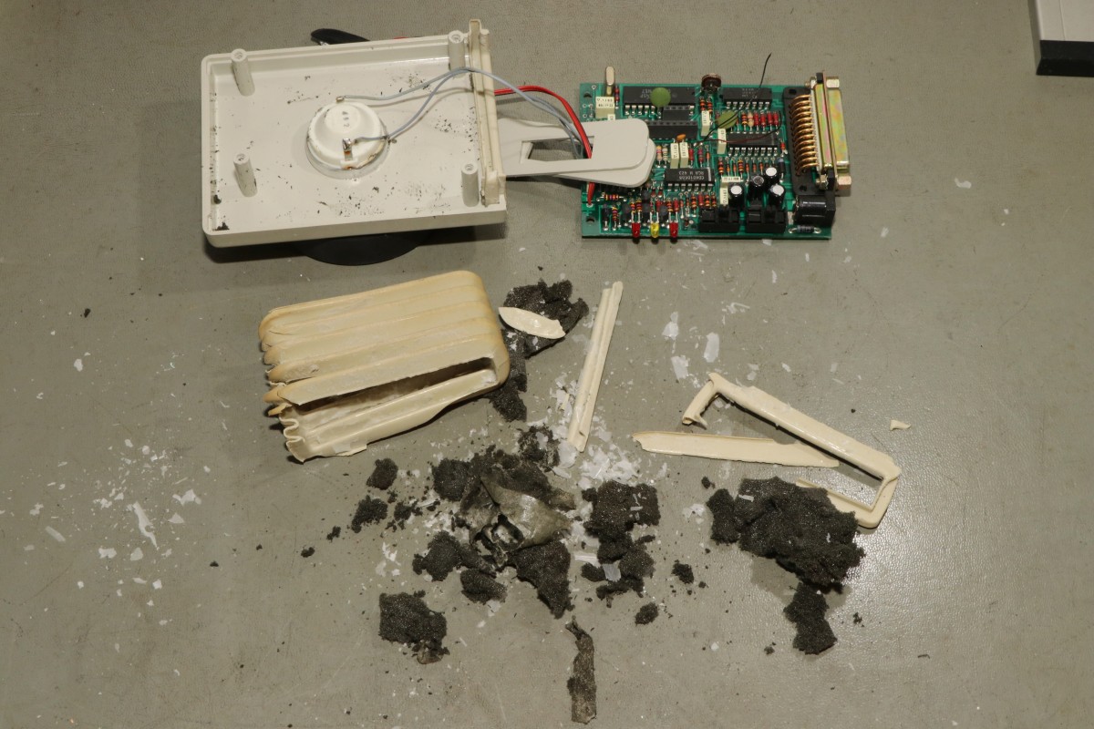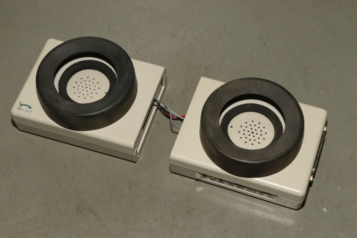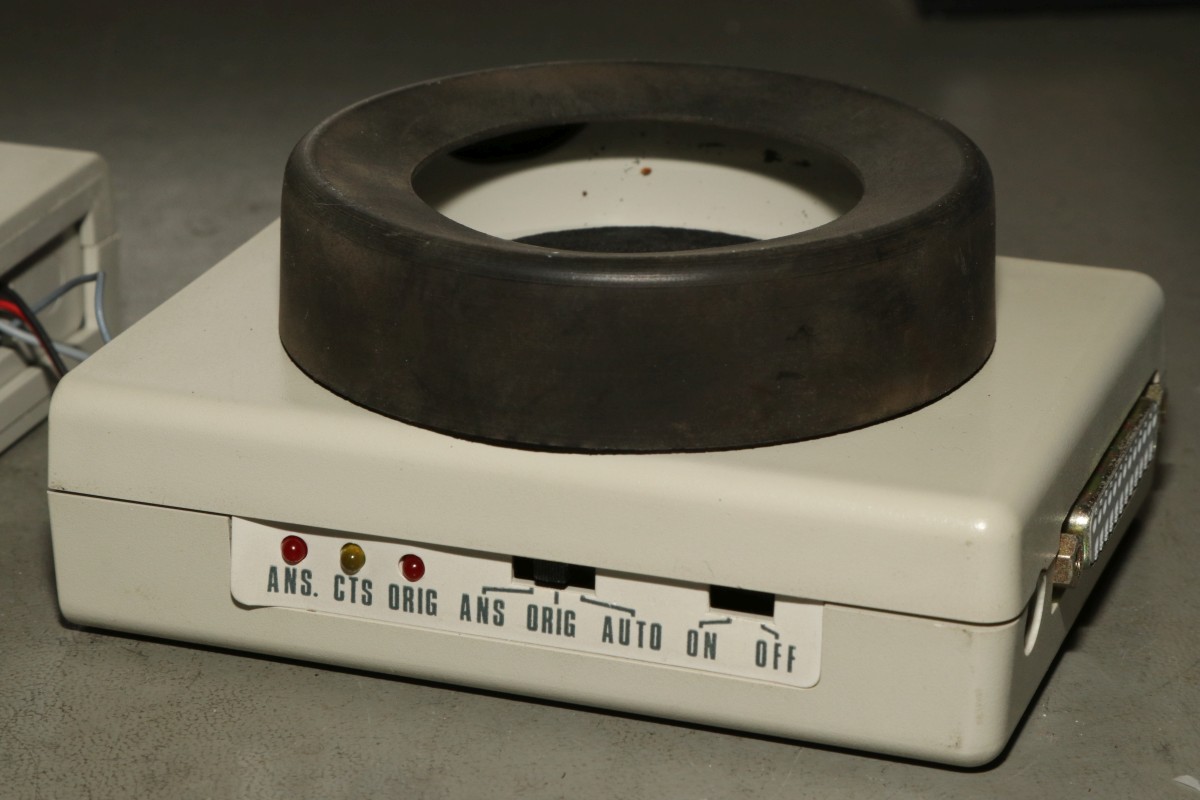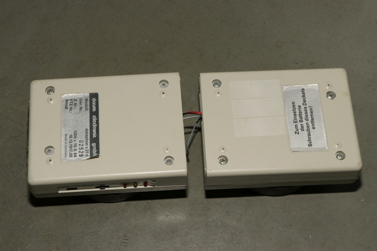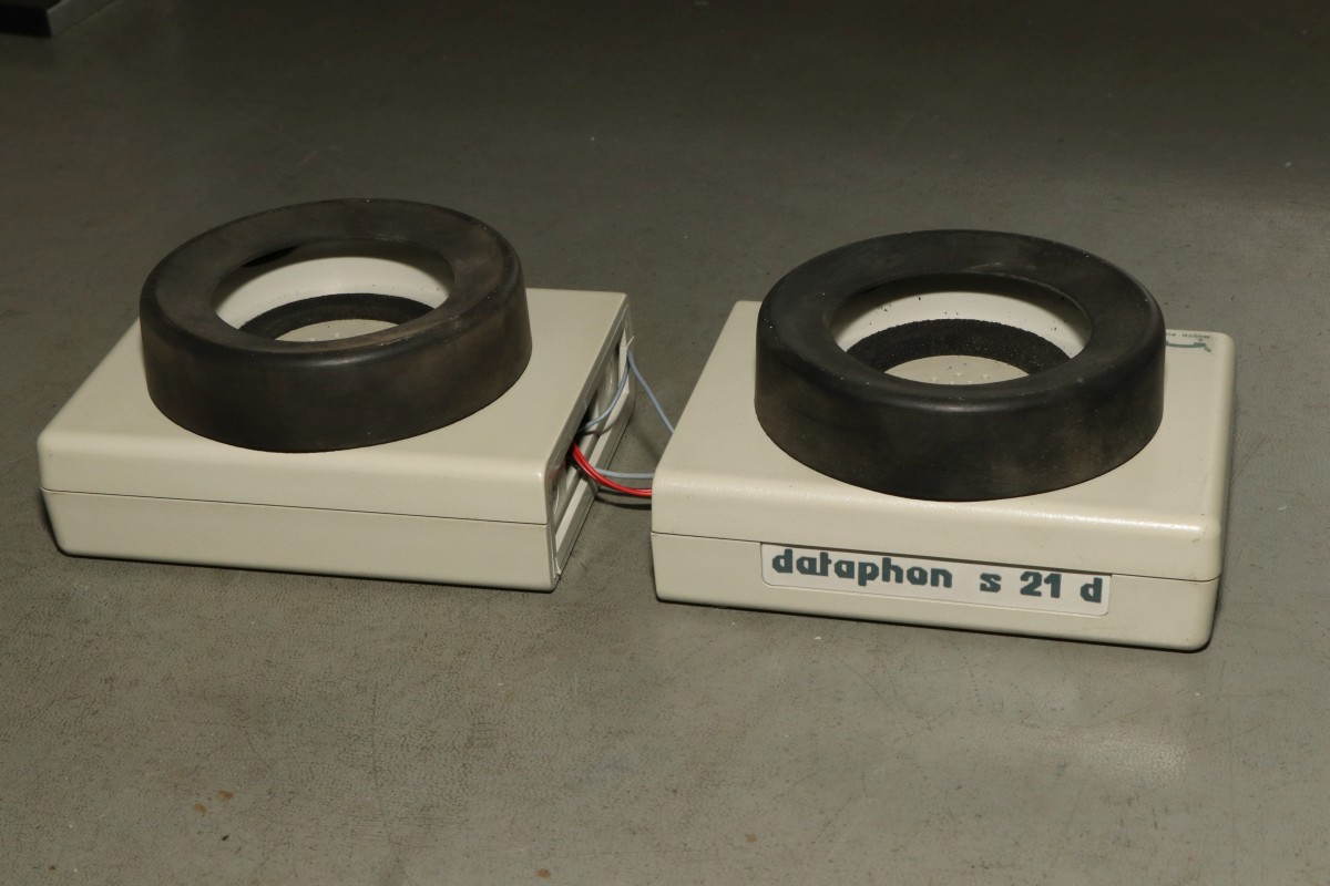 {Dataphon Akustikkoppler} "Wir hatten ja damals nix..." - Stimmt nicht! Wir hatten sogar Akustikkoppler, um damit über das Telefon in's Internet... äh, das hatten wir damals tatsächlich nicht... aber immerhin, um in diverse BBS (Bulletin Board Systeme) zu gelangen. Diese Teile waren die Vorläufer der Modems, die direkt an die Telefondose gestöpselt wurden. Man musste mit dem analogen Telefon die BBS-Nummer anwählen und steckte dann den Hörer in die dafür vorgesehenen Muscheln. Darin befanden sich ein Mikrofon und ein Lautsprecher, die die Daten dann entsprechend umsetzten. Das ging seeeeeehr laaaaangsam. Leider haben sich die flexiblen Kunststoffe dieses Exemplars nicht gut gehalten - trotzdem vielen Dank an Volle aus Berlin für dieses nette Exponat und dabei gleich einen herzlichen Gruß an die Hauptstadt!