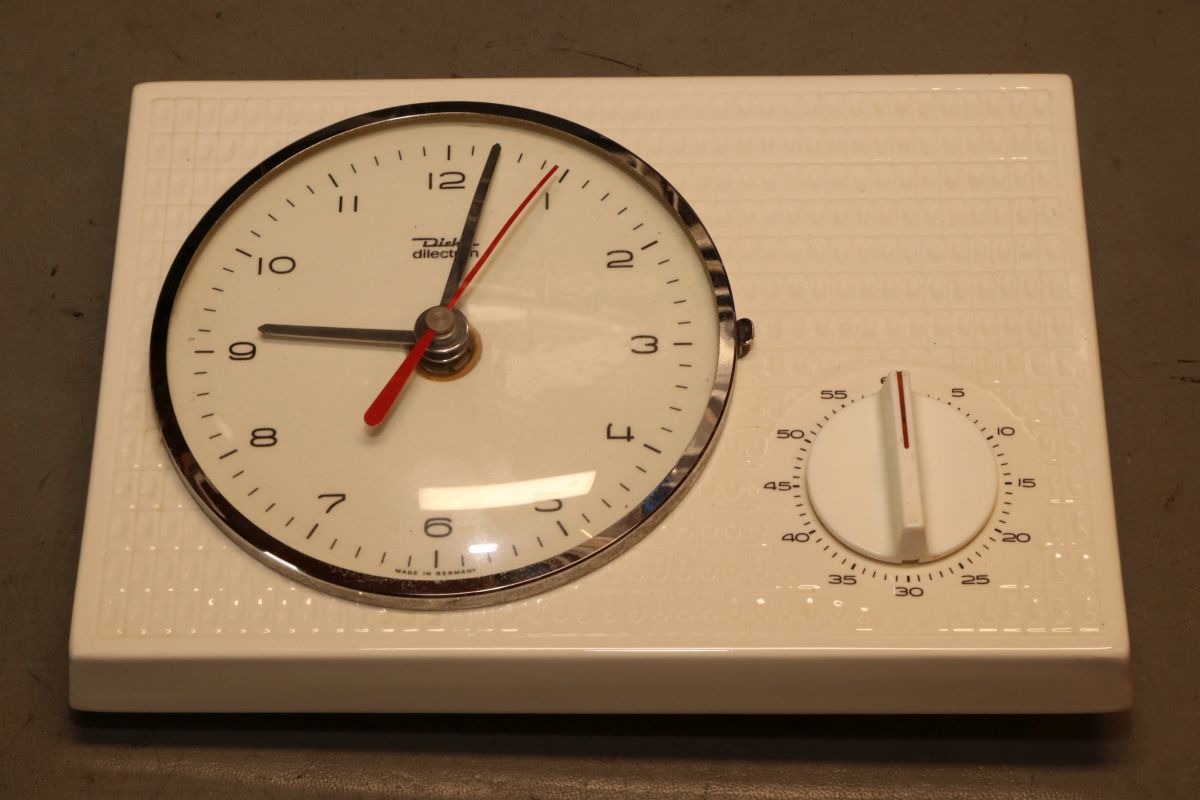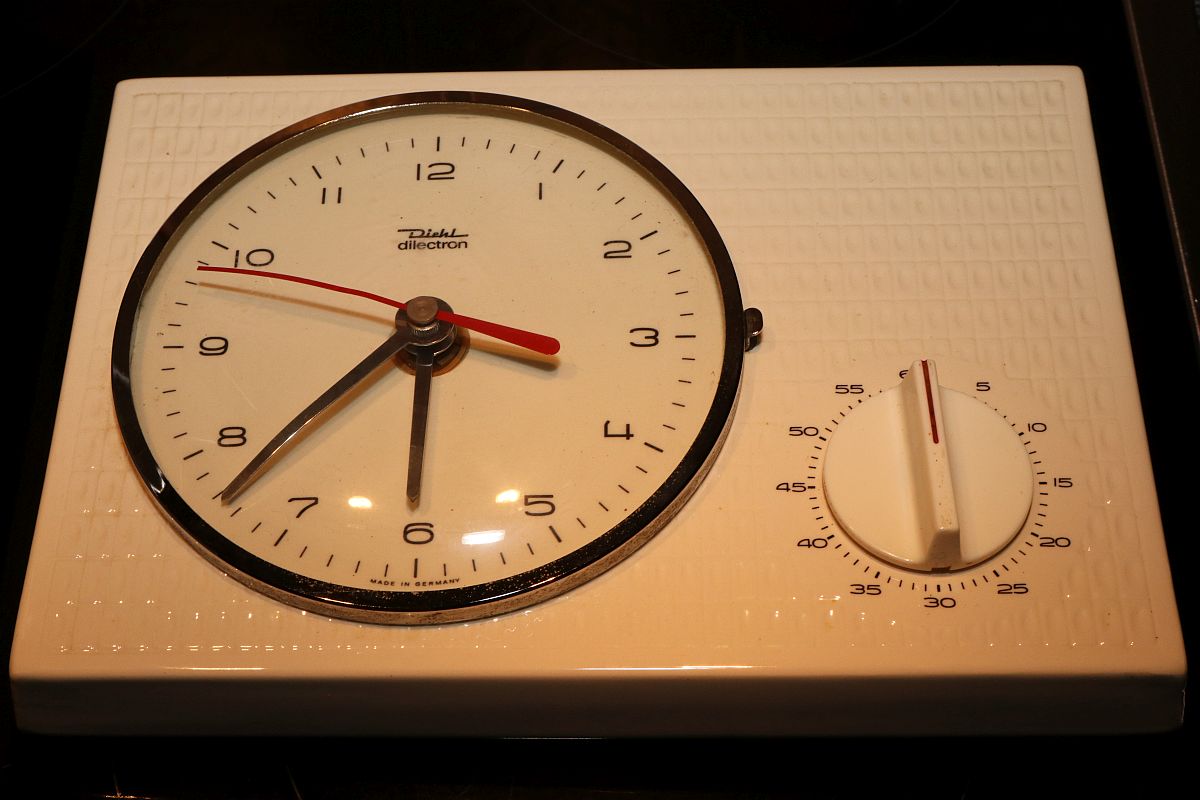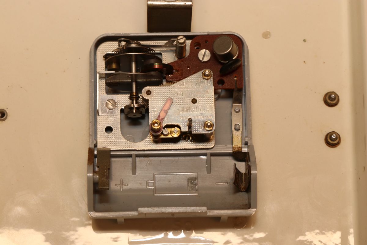 {Diehl Dilectron - der elektronische Zeitmesser} Eines dieser beiden Geräte gehört nicht in die Küche, obwohl sie beide vom selben Hersteller stammen und sehr ähnlich heißen... Der elektronische Zeitanzeiger mit mechanischem Küchentimer hat mich einfach fasziniert, weil er so gut zu den grandiosen Rechenmaschinen in meiner Sammlung passt. Genau so, wie die Rechner ist auch die Uhr gebaut: hochwertige Materialien, schönes, schlichtes Design - glasierte Keramik als Gehäuse und die Uhr läuft! {Diehl Dilectron - Diagnose und Reparatur} O.K., die Uhr läuft doch nicht so gut... nach wenigen Sekunden bleibt sie stehen. Also muss ich da noch mal ran, es interessiert mich eh, was sich hinter dem unscheinbaren Plastikdeckel verbirgt. Der Deckel lässt sich entfernen, wenn man das Rändelrad abzieht und die kleine Schraube löst. Dahinter befindet sich... sehr wenig. Bei diesem Uhrwerk handelt es sich um ein elektromechanisches Werk (Junghans ATO-Mat W726). Es besteht aus einer klassischen mechanischen Unruh, einem klassischen Zahnradwerk und als Antrieb eine Schwungscheibe mit Magneten, die sich um eine Spule bewegen. Im Blechgehäuse befindet sich ein simpler Transistor als Sperrschwinger, der nichts anderes macht, als die induzierte Spulenspannung zu verstärken und wieder als elektromagnetischen Antriebsimpuls im rechten Augenblick in die Spule einzuspeisen. So bleibt die Pendelbewegung der Unruh erhalten. Diese Konstruktion hat keinerlei Zeitbezug - dieser erfolgt einzig und allein durch die gefederte Unruh, die sich über eine Schraube abgleichen lässt. Quarzuhren waren teurer... Und noch eine Erkenntnis: das Start/Stop-Hebelchen hat keine elektrische Funktion! Es wirft einfach die Schwungscheibe an oder blockiert sie! Faszinierend einfach - einfach genial! Und die Uhr lief deswegen nicht sauber, weil die Hohlachsen der Zeiger nicht mehr sauber geschmiert waren - zu viel Reibung! Etwas Teslanol wirkt auch hier Wunder! Das irgendwie vertraute hektische aber leise Ticken erinnert mich jetzt immer bei meinen Reparaturen: "Tempus fugit!". {Junghans Diehl ATO-MAT Werk 726} Im Internet sind mir noch einige Unterlagen zum Uhrwerk zugelaufen, die ich meinen Lesern nicht vorenthalten möchte. Wie schon beschrieben, handelt es sich hier um einen einfachen Sperrschwinger mit zwei Spulen, einem Transistor und einem Kondensator, der mal so grob die Arbeitsfrequenz bestimmt. Weil das Konstrukt so einfach aufgebaut ist, ist es auch nicht selbstanlaufend und muss angeworfen werden. |