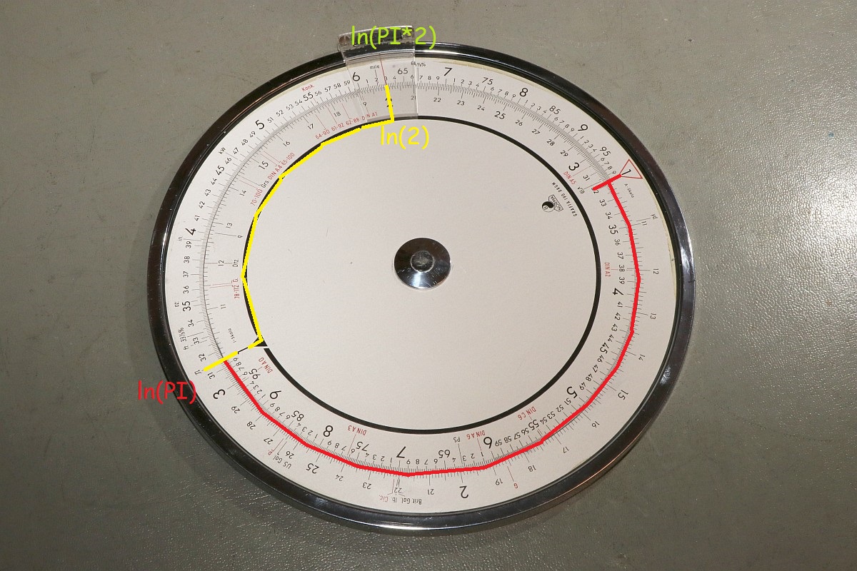 {Grafia Rechenscheibe 190} In einer Zeit lange vor unserer Zeit, als man noch keinen Strom benötigte, um simple Rechnungen durchzuführen, und kein Internet, um die Lösung auf 5x5 zu finden, da gab es Rechenschieber - und für Rechnungen ohne Größenbegrenzung auch Rechenscheiben. Eine unscheinbare Plastikhülle liegt vor mir. Im Inneren eine Kostruktion aus vielen Zahlen und Strichen auf zwei gegeneinander verstellbaren Aluscheiben - und eine Kurzanleitung, die in erster Linie auf das grafische Gewerbe ausgerichtet ist. Vermutlich heißt dieses Produkt genau deswegen "Grafia 190"... So geht's... Das Ergebnis liest man am Faden ab: 6,28... Das ist die Rechnung: Um genau zu sein: die Rechnung war Pi*2 - und weil (wie jeder weiß) der Logarithmus eines Produktes zweier Zahlen das Gleiche ist, wie der Logarithmus der einen Zahl plus den Logarithmus der zweiten Zahl - und weil beide Ringe logarithmische Skalen besitzen - , kann man bei Rechenschiebern und Rechenscheiben die Multiplikation durch eine einfache Streckenaddition ersetzen. Logischer Weise geht die Division genau so durch eine Streckensubtraktion! Der Mathematiker hat so etwas gerne benutzt, waren dadurch doch recht hohe Genauigkeiten in kürzester Zeit möglich! Der Praktiker hingegen hat eher gerundet und lebt in einer Welt, in der e = 3 = pi ist. ;-) |