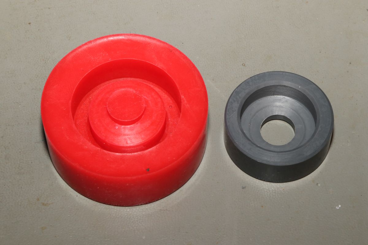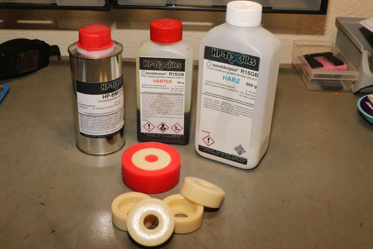 {Frisch gegossen: Diehl Gehäusefüße} Wer schon mal eine Diehl auf einem empfindlichen Tisch bewegen musste, erinnert sich nur ungern an die dabei entstehenden Kratzer. Grund dafür: bis zur Bedeutungslosigkeit geschrumpfte Gummifüße. Den Diehl Kundendienst frage ich garnicht erst, selbst ist der Mann. Meine Drehbank liefert mir einen Master aus PVC: Vorsichtshalber noch mal anpassen... Der Master wird mit Entformwachs bepinselt und vorsichtig mit Abformsilikon umschlossen. Nach 24 Stunden kann man die Gussform vom Master trennen. Als Abstandshalter hat übrigens ein 40poliger Sockel gedient... Das geht prima! Jetzt geht das mühsame Geschäft los: ca. 20g flexibles 2K-PUR anmischen und jeden Fuß einzeln gießen. Die Entformzeit von 3 Stunden (da klebt es noch recht eklig) bestimmt den Arbeitstakt. Das Ergebnis kann sich sehen lassen! Ein gutes Team: Jetzt kommt der Moment der Wahrheit. der alte Fuß wird abgeschraubt... ... der neue Fuß wird eingesetzt... ... und verschraubt. Das vorhandene Spiel spielt keine Rolle, letztendlich steht ja die Maschine eh drauf. Endlich wieder Abstand zur scharfen Metallkante: Das steht wieder 50 Jahre stabil. Übrigens haben durch diese weichen Füße die Vibrationen der Maschine noch mal merklich abgenommen! |