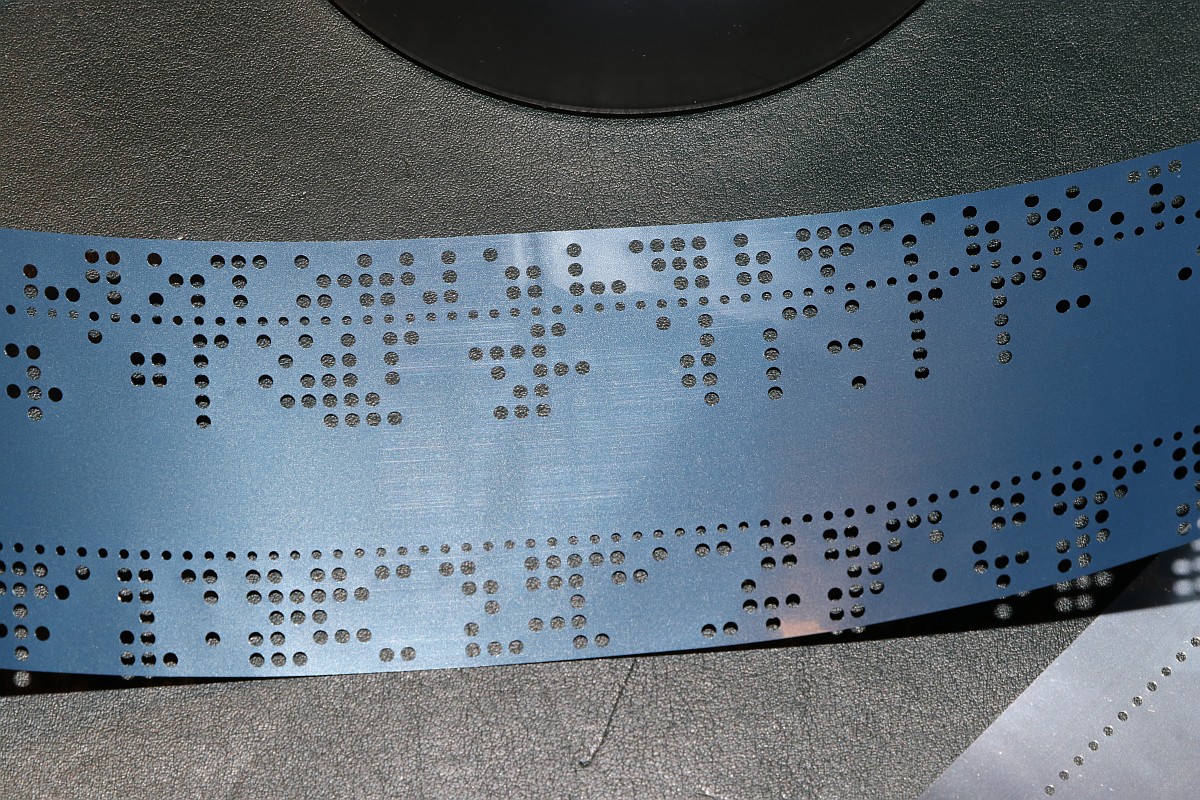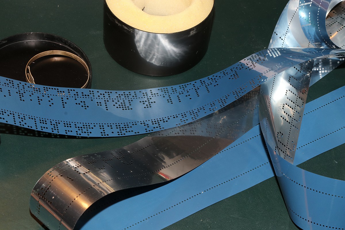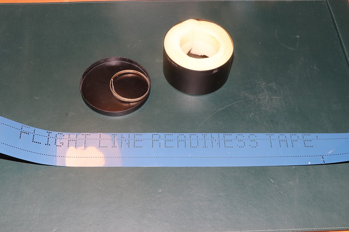Es ist ein Lochstreifenband in völlig ungewöhnlichem Format - außerdem nicht aus Papier, sondern aus metallisierter Kunststoffolie. Die Klartextlochung verweist auf den Avionik-Bereich, hier hat Geld offensichtlich keine Rolle gespielt!