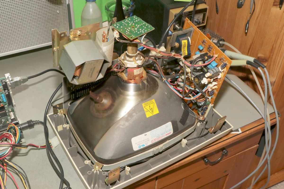 Beim Auseinanderbauen des Monitors muss man vorsichtig sein: der Netztrafo hängt recht lümmelig am Gehäuse dran un dürfte bei unsachgemäßer Behandlung recht schnell abbrechen - also Vorsicht! Hier mal der dreckige Bildröhrenhals - das empfindlichste Teil eine Bildröhre!