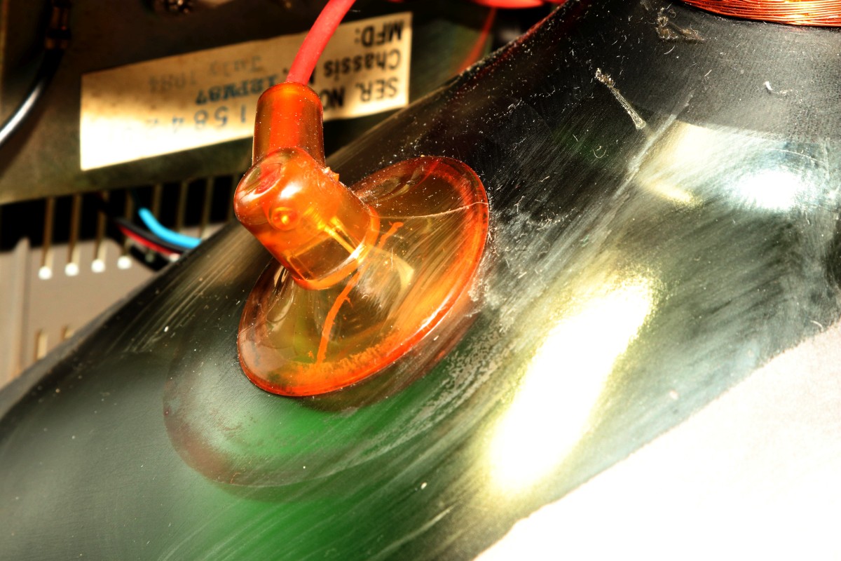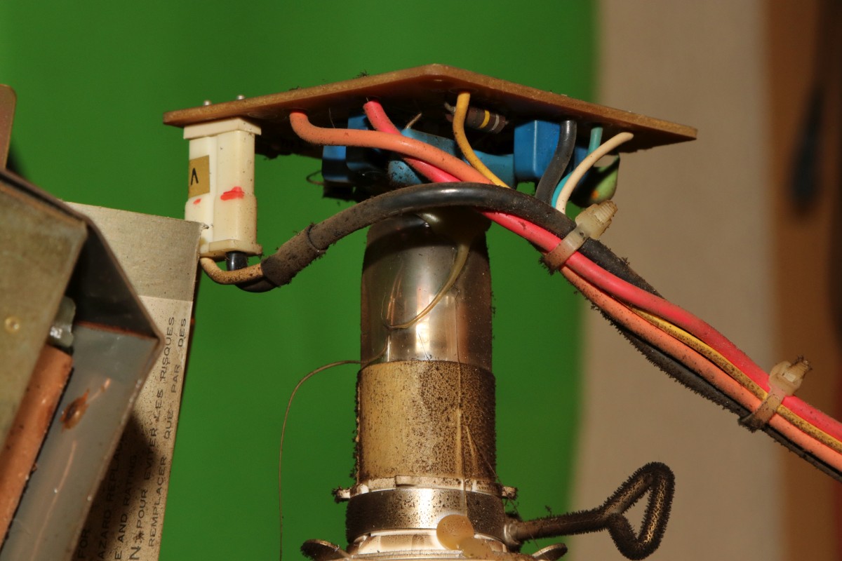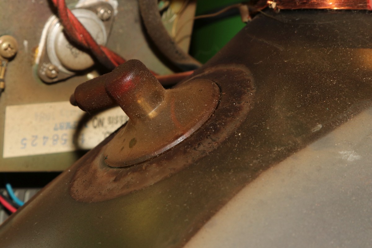 Die Anodenkappe wird - wie der Zeilentrafo auch - extrem dreckig. Verantwortlich dafür ist die statische Aufladung durch 13kV, die von überall her Staub anzieht. Solche Stellen mache ich grundsätzlich sauber, um zukünftig Überschläge zu verhindern!