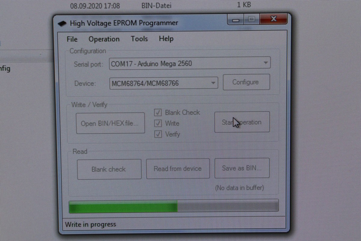 Nachteil dieser Bausteine: es gibt keine Programmer dafür... Quatsch, ich hab doch einen! Matt's Programmer für 2708 hat doch einen Umschalter für 68764/66, da der Brennalgorithmus sehr ähnlich ist! Zufällig hab ich so einen Prommer da...