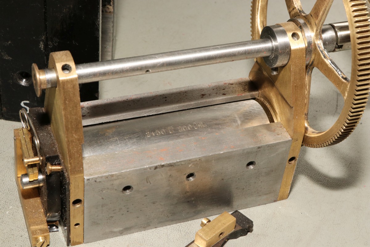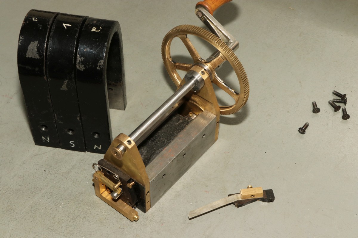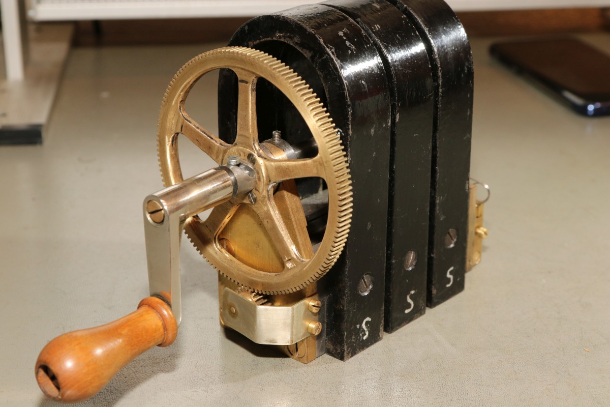 {Ein Kurbelinduktor} von einem freundlichen Spender erreichte mich ein Kurbelinduktor, der leider defekt ist und außerdem noch zusätzlich einen Transportschaden erlitten hatte. Trotzdem möchte ich natürlich auch solche Exponate möglichst hübsch in Szene setzen - zumal sich bei diesem Teil vermutlich ein Geselle viel Mühe bei der Erstellung seines Gesellenstücks gemacht hat. Womöglich als Fernmeldemechaniker oder so etwas. Die Spule hat eine Unterbrechung und die Isolierplatte ist in eine Handvoll Stücke zersprungen... Auch wenn hier offensichtlich einige industriell gefertigte Teile verbaut wurden, so sehen doch die meisten Teile sauber und ordentlich handgefertigt aus. Das hat mal sehr viel Mühe gemacht! Hier der isolierte Wellenabgang: Der geteerte Rotor (Doppel-T-Anker - genau wie das Bosch-Logo...). Hersteller war wohl ein gewisser Heinz Amann... Die Spulen haben keinen Durchgang mehr, da hilft kein Suchen, da hilft nur Entfernen und neu Wickeln! Was für eine Arbeit, da fällt mir ein, dass ich auch ganz dringend mal wieder zum Friseur müsste... blödes Corona... Hier der blanke Anker: Die Isolierplatte sieht nicht gut aus... ...lässt sich aber für ein Ansichtsmuster trefflich mit Sekundenkleber reparieren. Danach sollte man die Senkkopfschrauben allerdings nur handfest anziehen! Und hier ist nun der vorläufig funktionslose Kurbelinduktor: Dieser Stift und Nut sorgen dafür, dass der Stromkreis nur bei Drehung im Uhrzeigersinn geschlossen wird. Wenn man aufhört, zu Kurbeln, rutscht die Welle wieder zurück! Der gefederte Schleifer für den Stromabnehmer: Der drehabhängige Kontaktteller auf der Antriebswelle: Viele Windungen auf dem Anker... ich denke, das Exponat kann erst mal drahtlos bleiben, wireless ist eh voll aktuell - sieht ja auch so wunderschön aus. Vielen Dank für die Spende! |